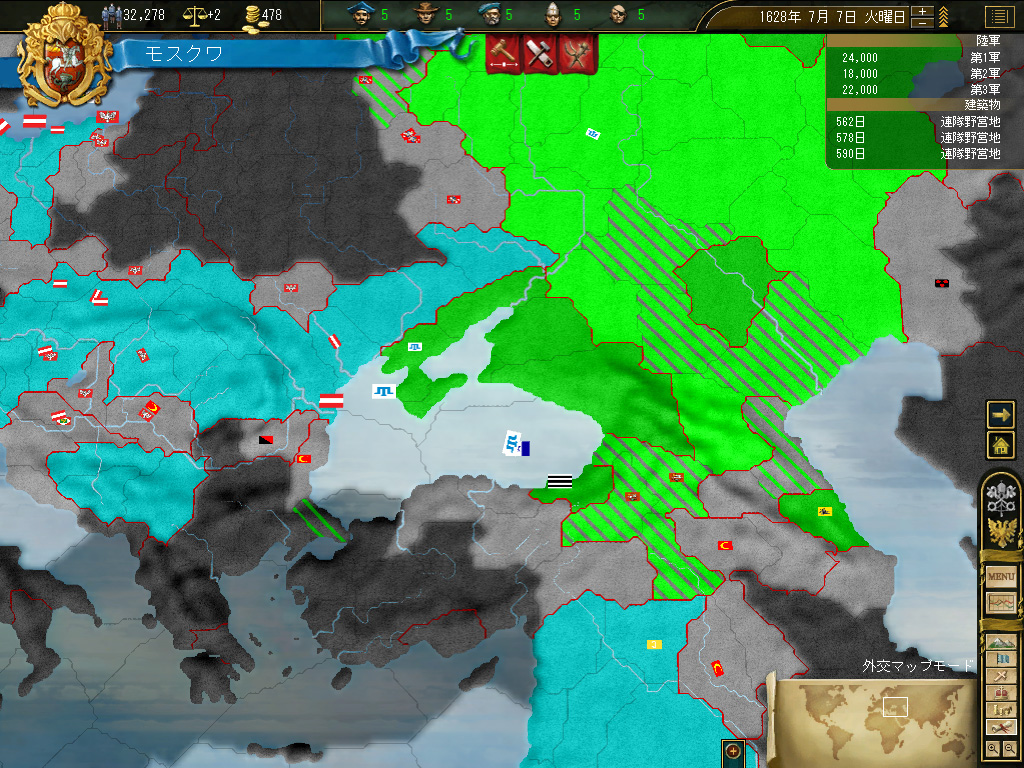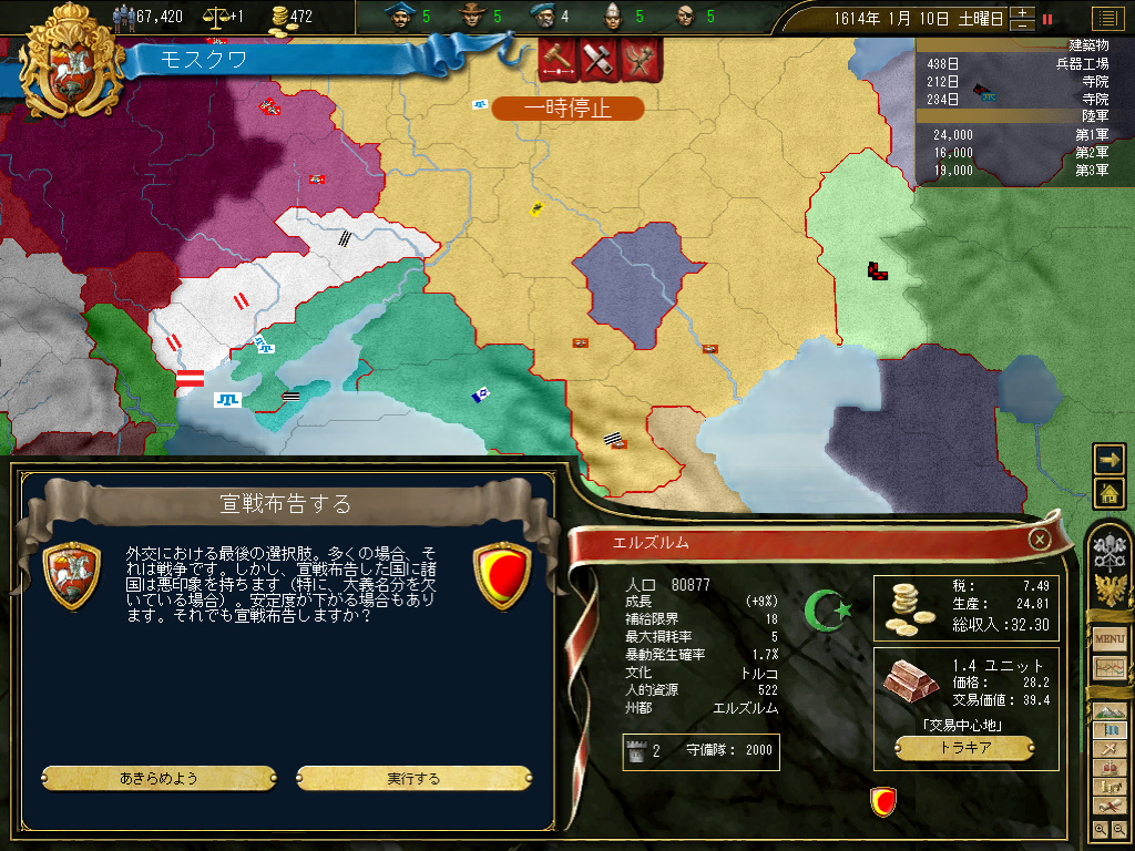 そもそもゲーム開始時の1453年,モスクワ大公国はいまだ正式に独立しておらず,いわゆる「タタールのくびき」の下にあったわけで,そこでいきなり「わが国は東ローマ帝国を復興するのじゃ」と叫んでも,ちょっとアレな気もする。それはそうなのだが,目標そのものがアレなんだから,これくらい前後の見境がない始末でなくては,むしろ説得力もあるまい。