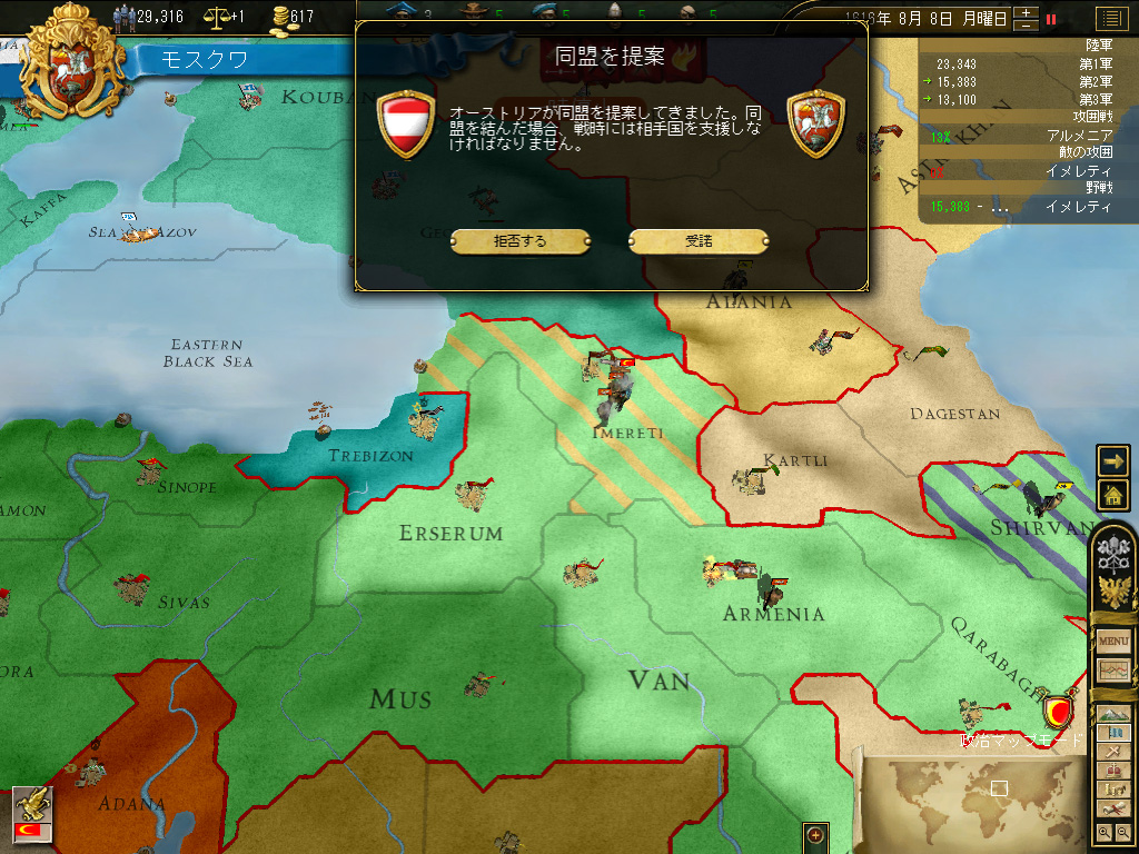 オスマン帝国との戦争を始めるに当たっても,まずなすべきは根回しである。当時中欧最強の国であったオーストリアは,長年オスマン帝国と戦争状態にあった。だが,モスクワ大公国とオーストリアの関係も−180。パラメータの範囲は−200〜+200なので,ほぼ最悪といってよい。