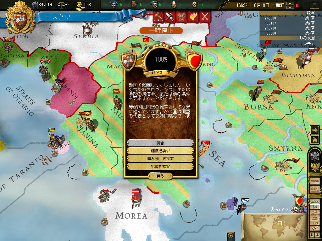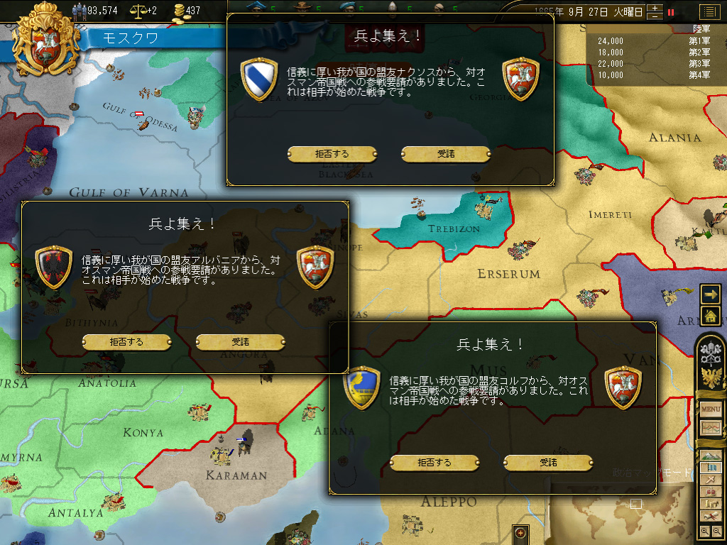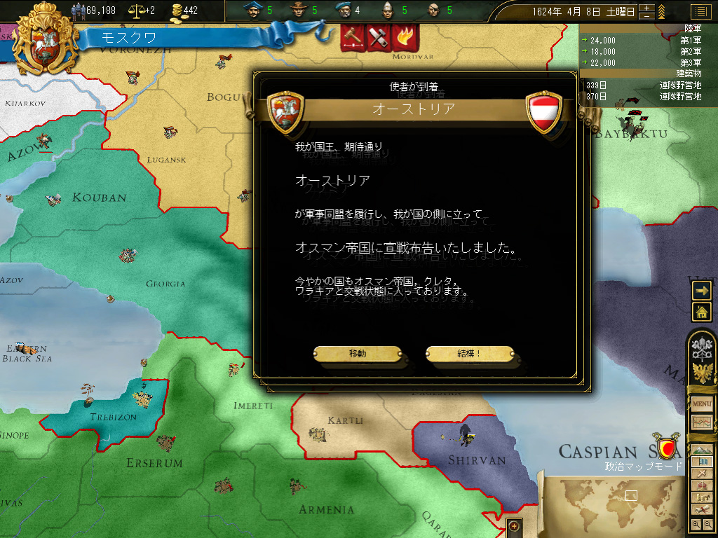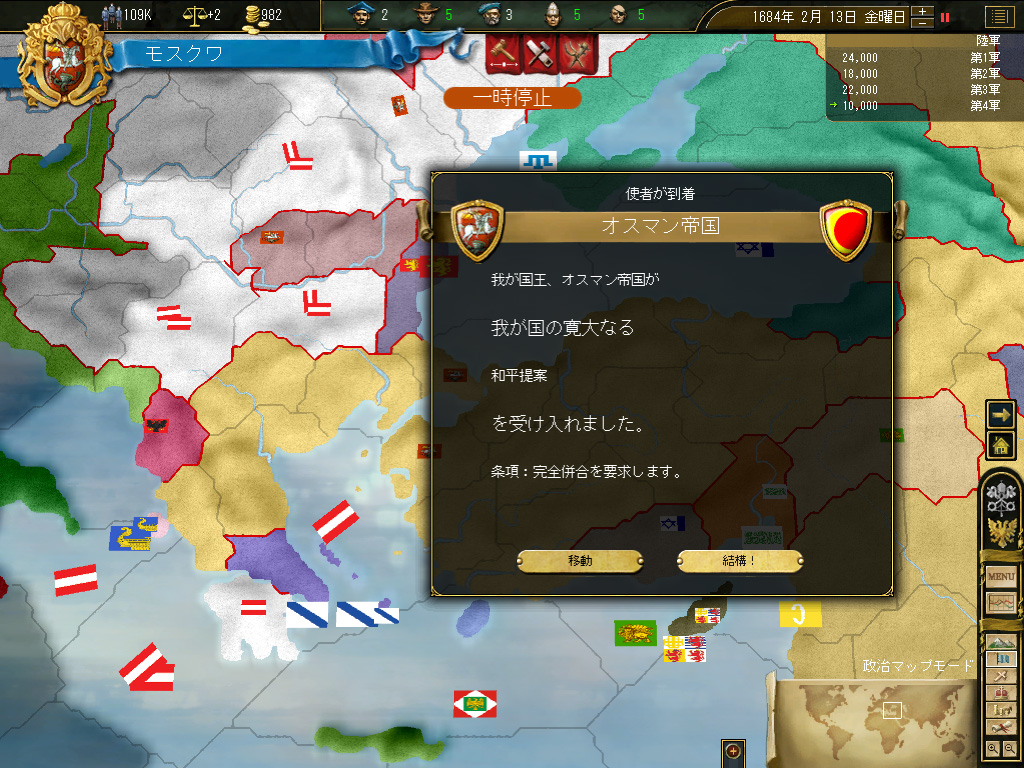 満を持して,モスクワはオスマン帝国に宣戦布告する。即座にオーストリアから同盟の打診が入ったので,これを受諾。オーストリア・モスクワ連合軍は,オスマン帝国を東西から挟撃していった。