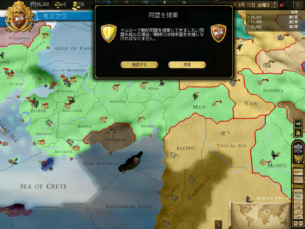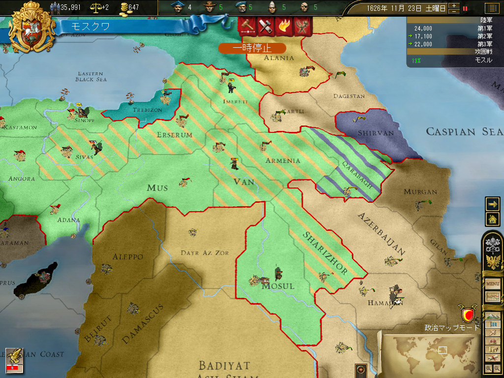 もう一つ,ちょっとヤバげな敵とはペルシアである。このときペルシアはグルジア付近までを支配下においており,オスマン帝国に侵攻するにはペルシア領を通らねばならない。もちろん軍隊の通行許可だけをもらうという手もあるが,正直いってそんな許可が下りる可能性は非常に低いし,アナトリア半島に進出した後になって通行許可が剥奪されたら,モスクワ大公国の未来までもろともに剥奪されてしまう。