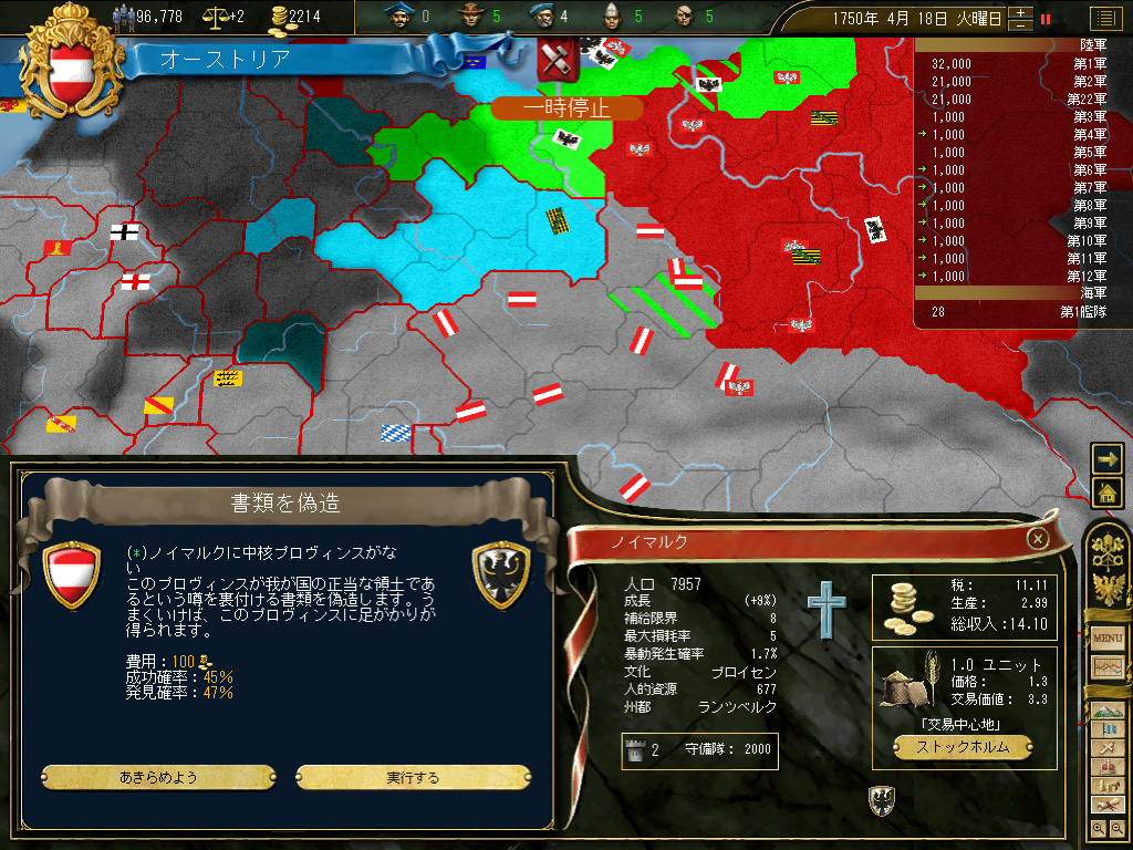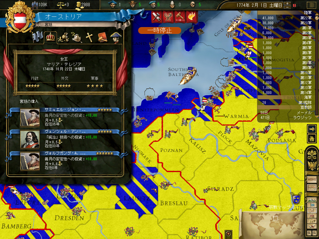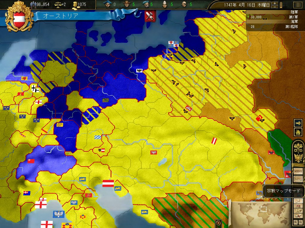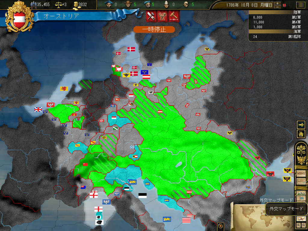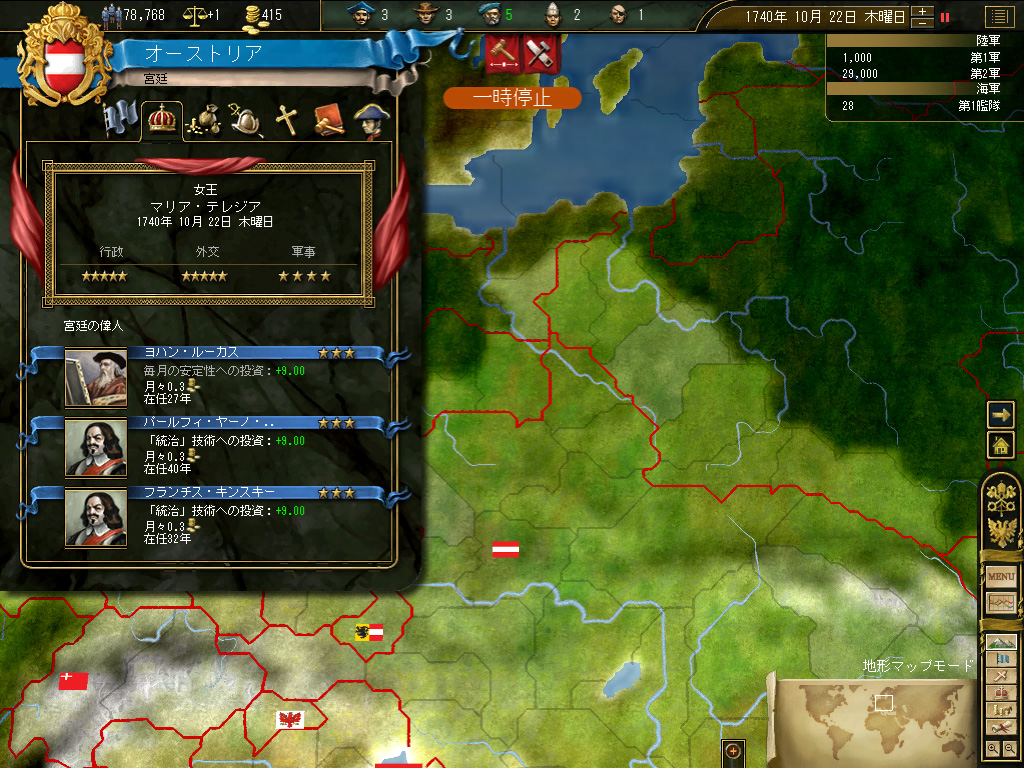 さてプレイを始めると,いきなりだが,なぜか問題の継承戦争が起こらない。まあ,オーストリア的にはたいへんありがたいので,知らんぷりを決め込むことにする。史実でもそうだったがオーストリアは財政難で,この時期に大規模な戦争が起こるとかなりつらいのだ。