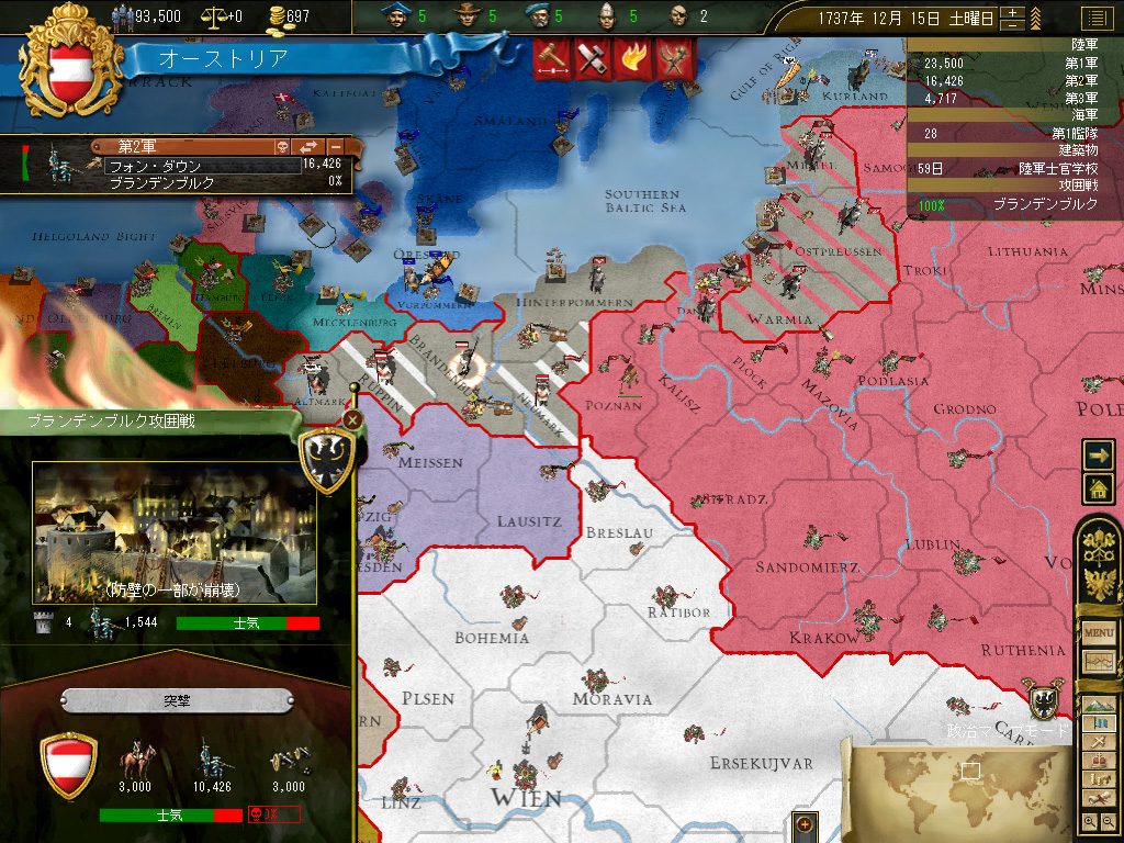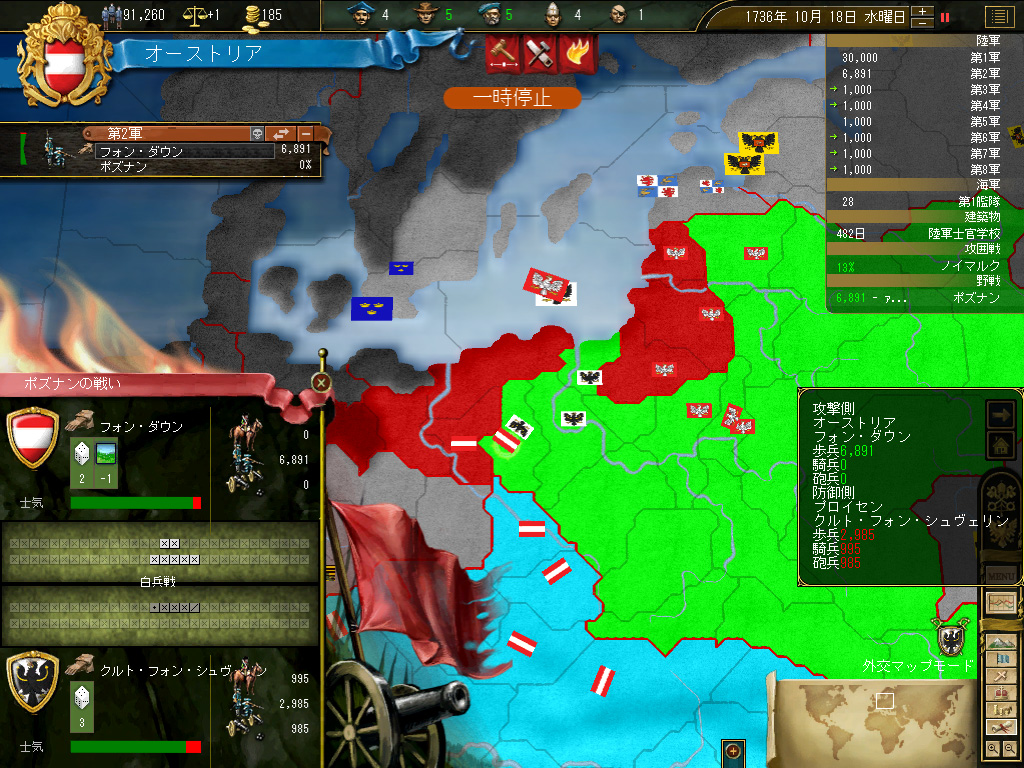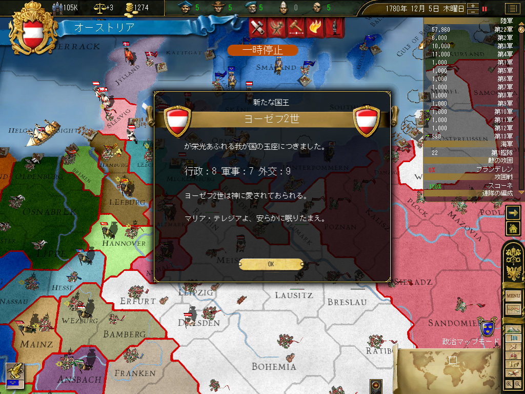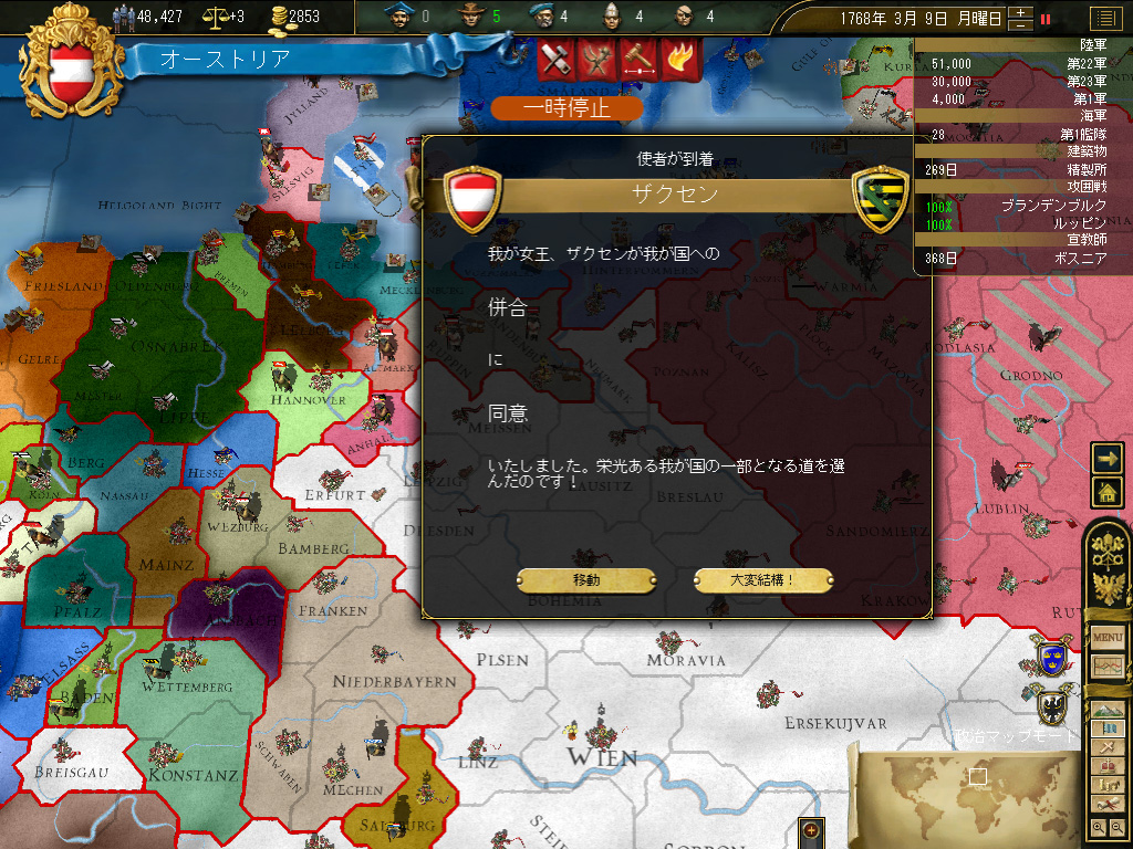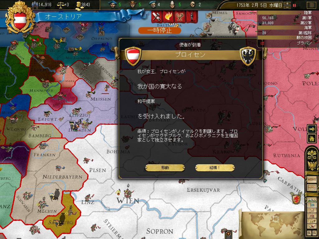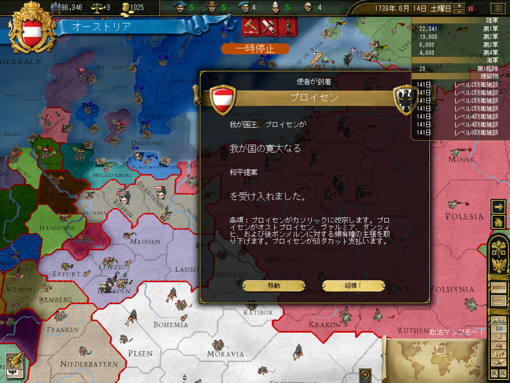 途中,なぜかポーランドがロシアに宣戦して泥沼の戦争が10年くらい続き,やがてポーランドが降伏して領土をロシアに割譲するとかいった不思議歴史が展開されたものの,このタイミングを突いてプロイセンからオーストリアに宣戦布告とかいった展開にはならなかったので,よしとする。