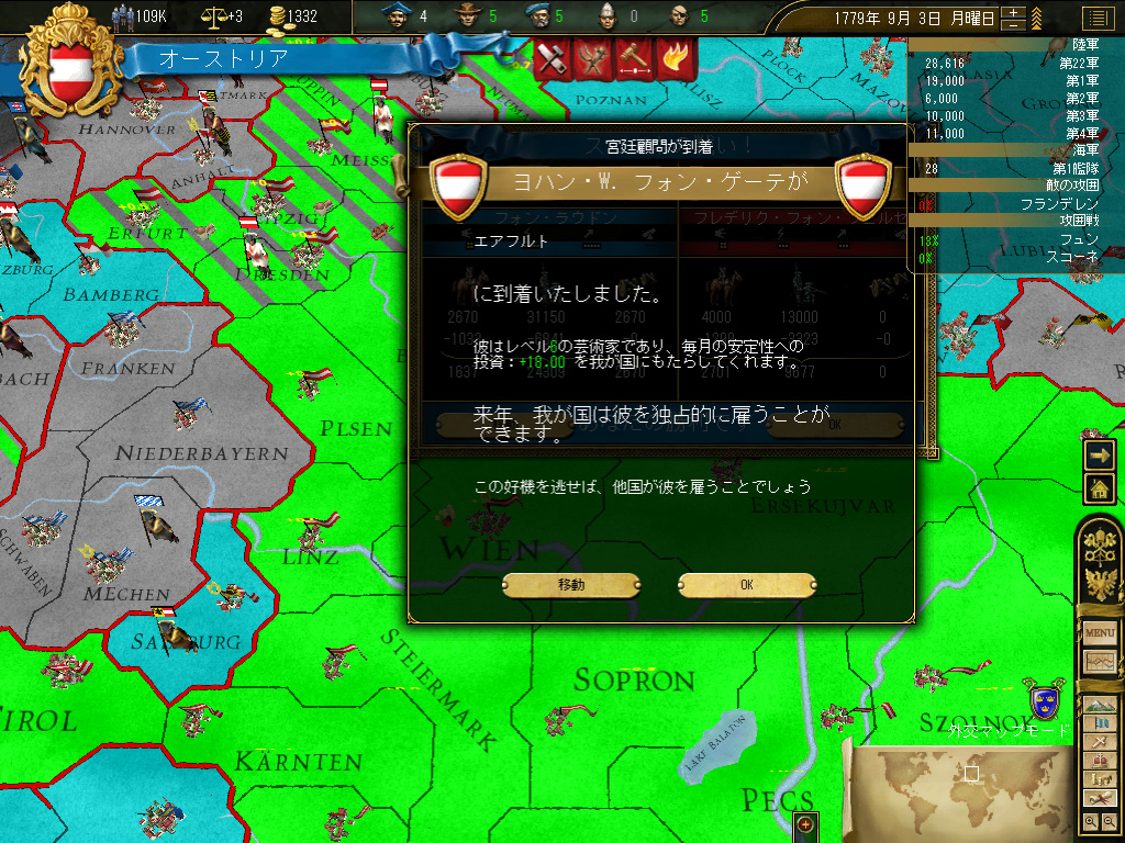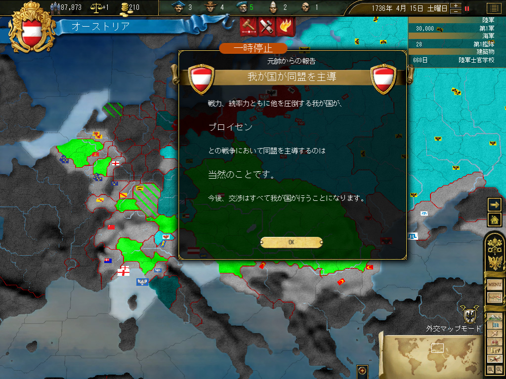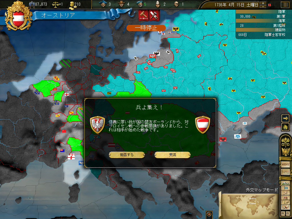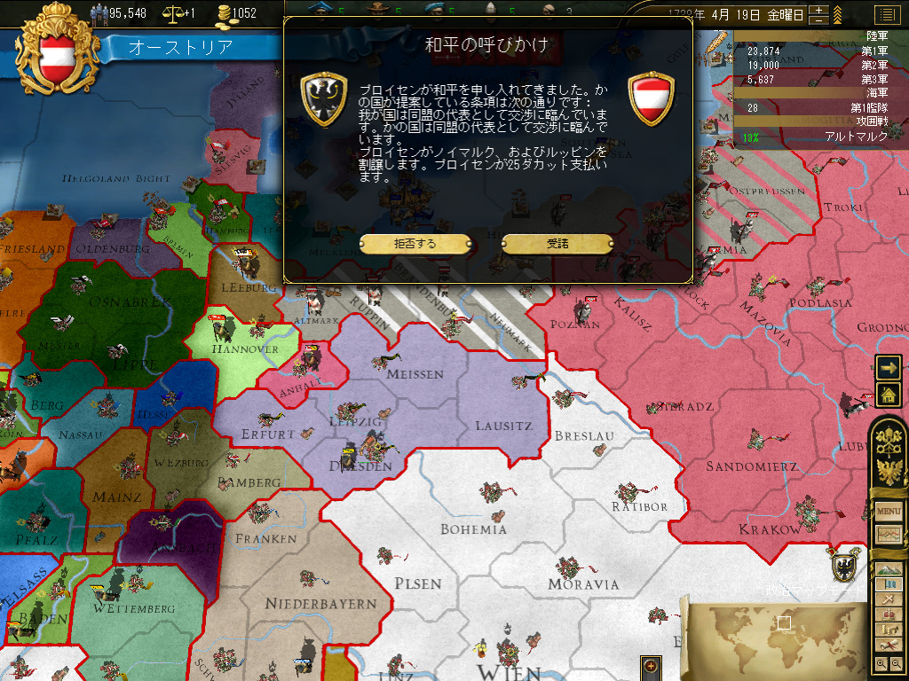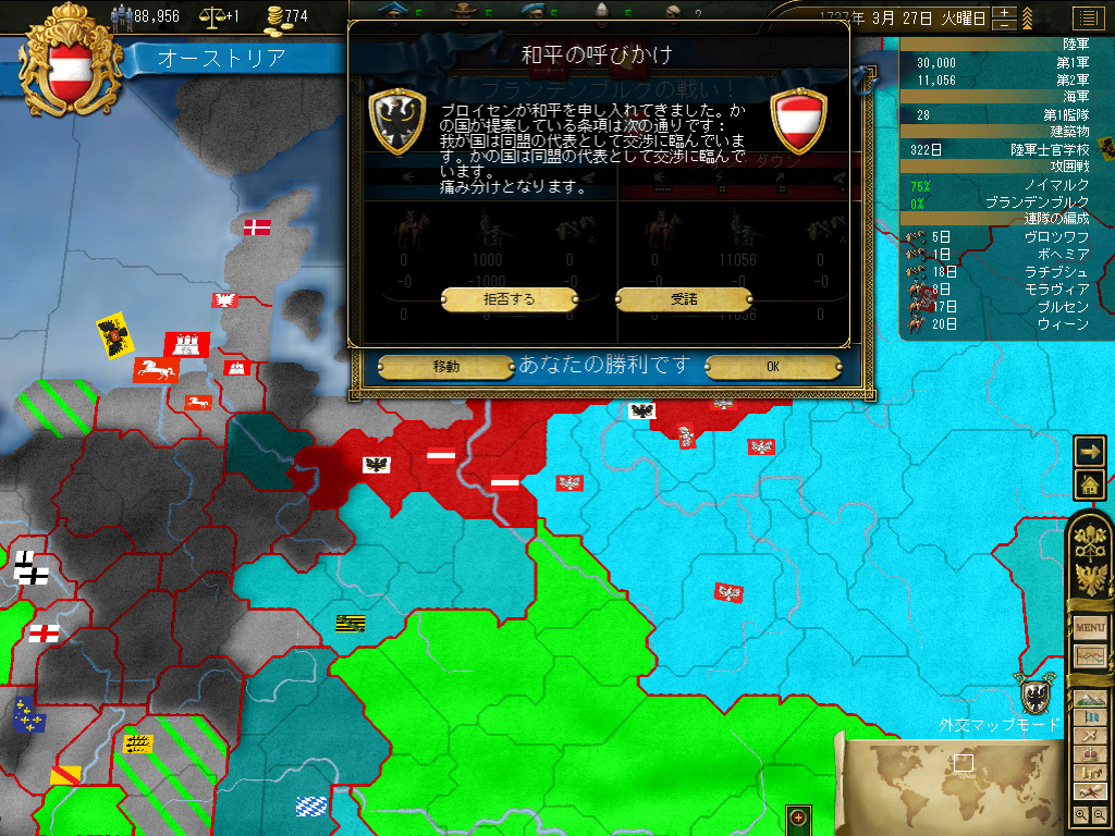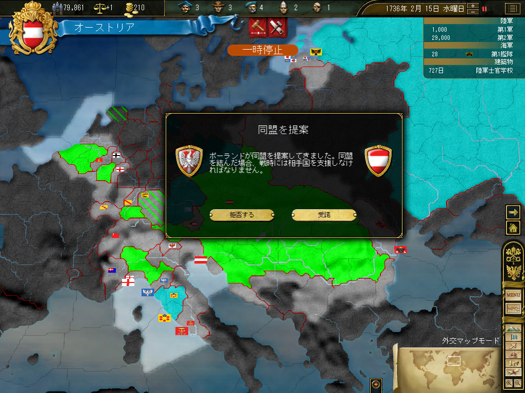 せっかく継承戦争が起こらなかったということで,まずは地盤固めに入ろう。ポーランドを筆頭とした周辺諸国と大同盟を結成し,のちのち災いの種となるに違いないプロイセンに対する包囲網を形成する。またロシア/フランスとの関係改善を進め,あわよくば軍事同盟を志す。