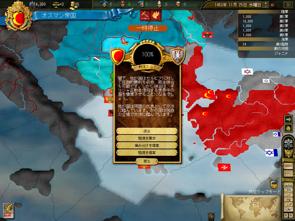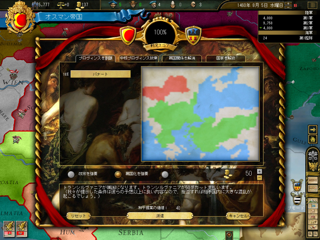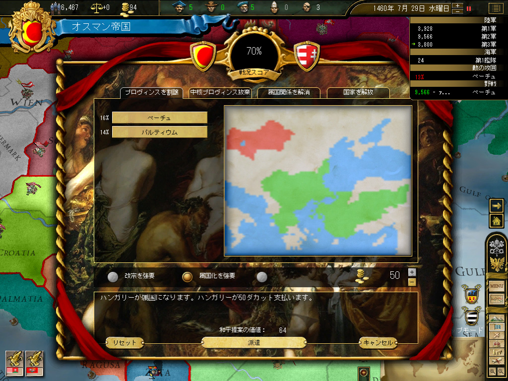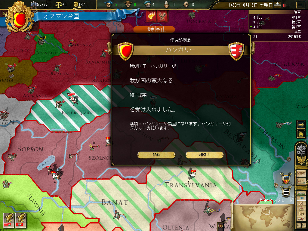 ここはハンガリーに「属国の解放」で手を打ってもらい,トランシルヴァニアとセルビアのみの割譲で最初の戦争を終わらせることとする。正直言ってハンガリーはさして恐れるに足りない国家で,兵役人口と予算に限界があり,長期間の戦争となると,やがて勝手に白紙講和を申し出てくるため,隣人としては望ましいのだ。