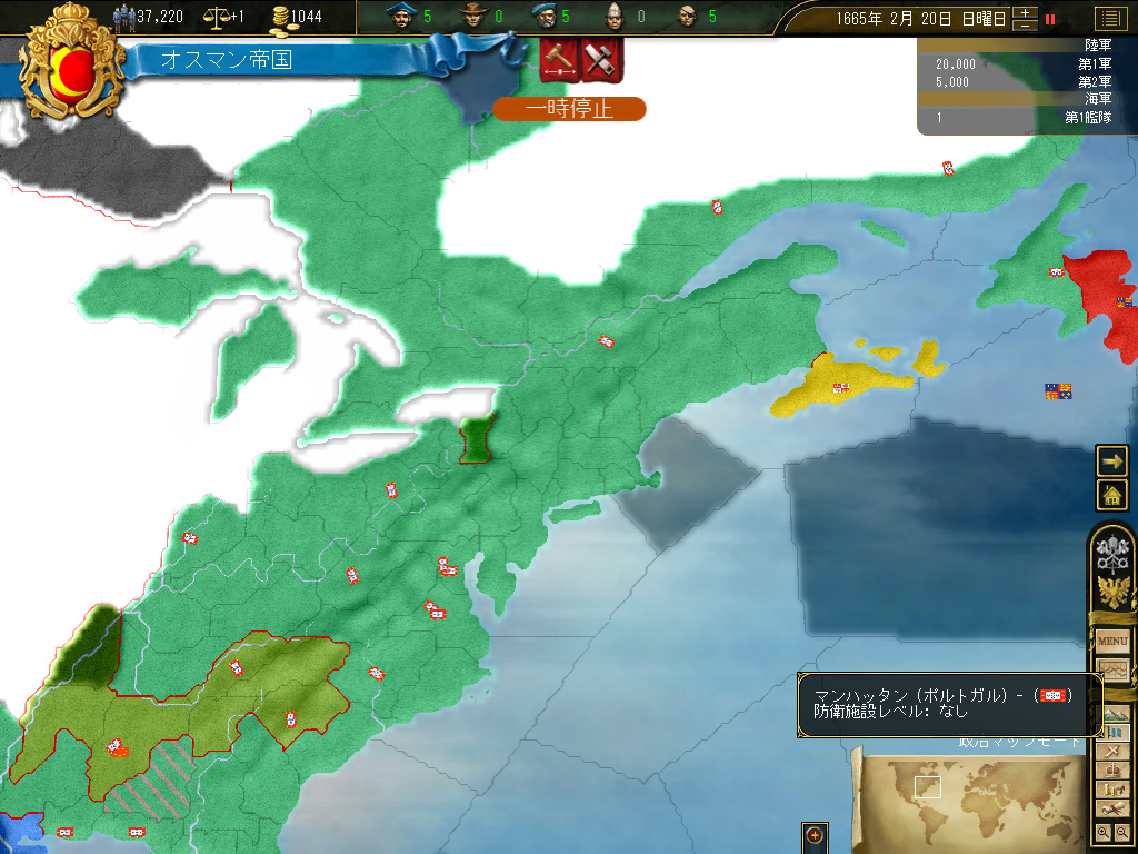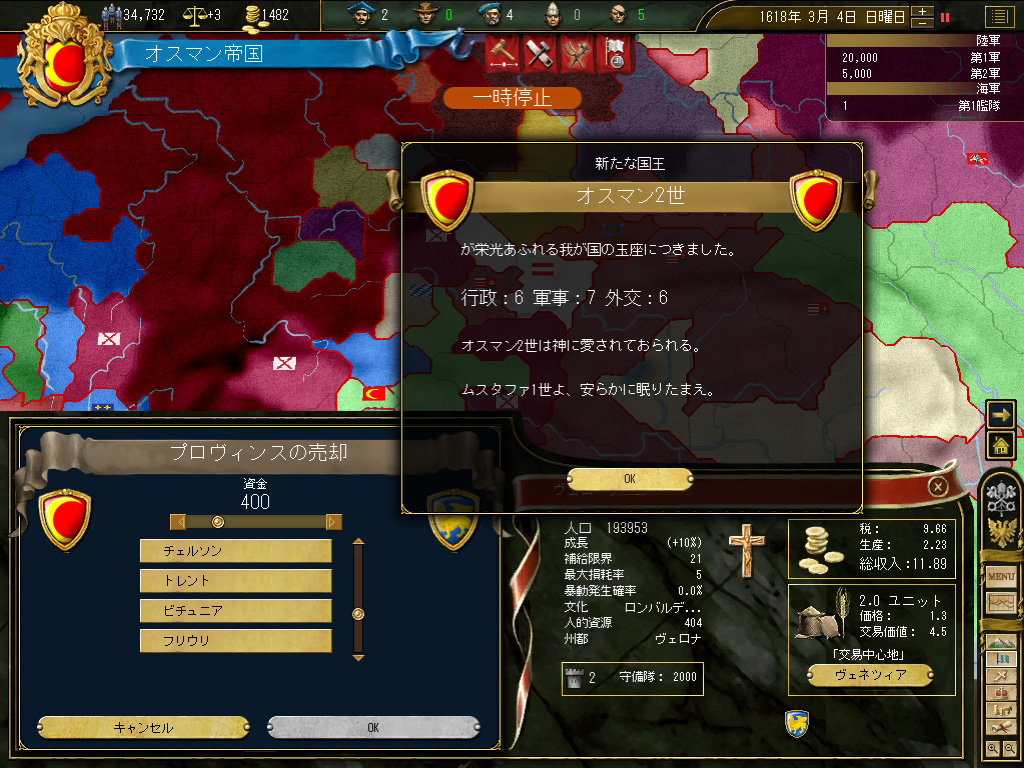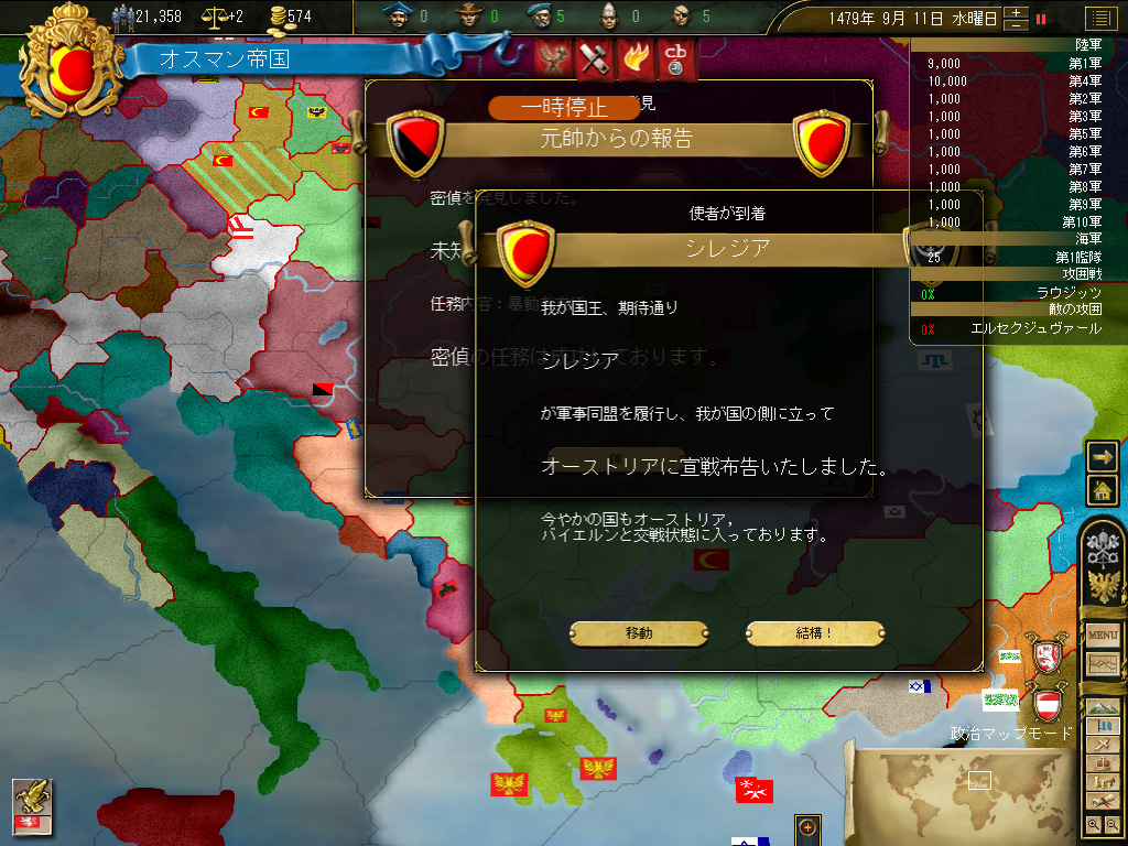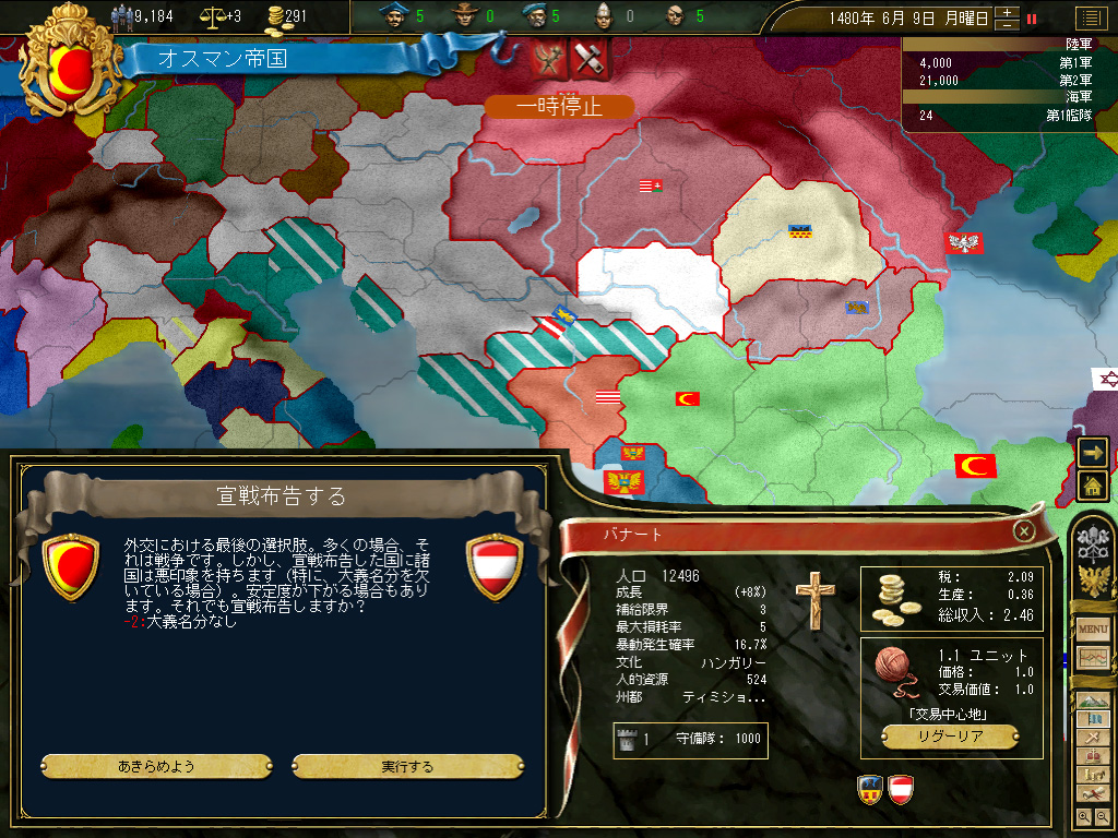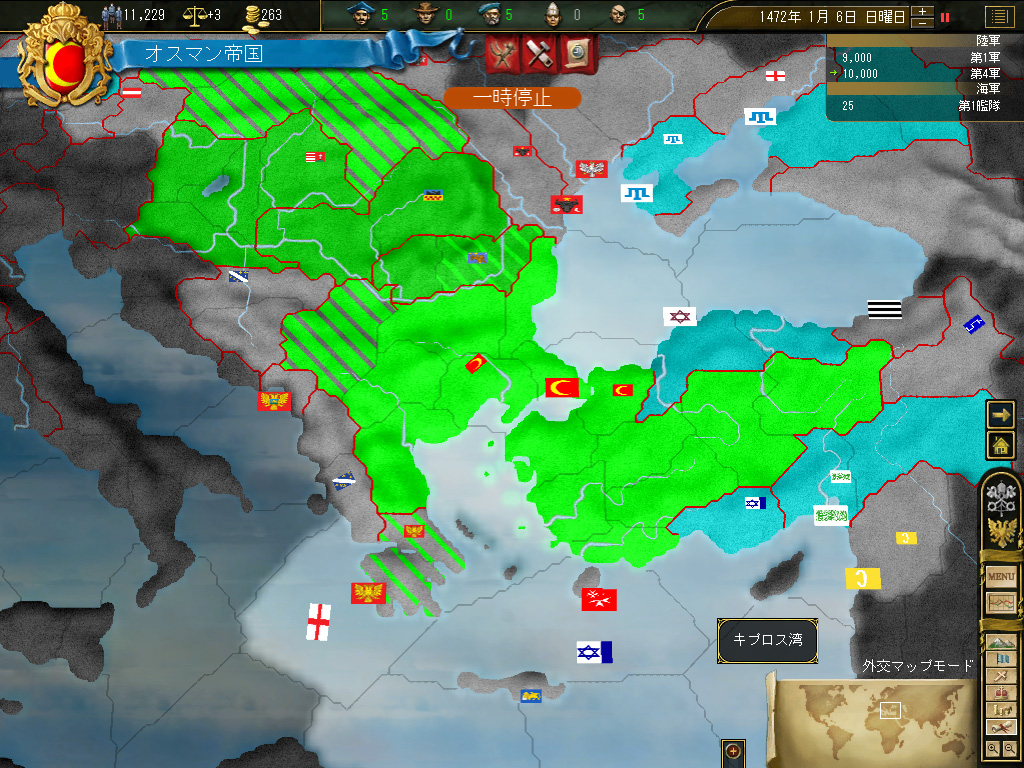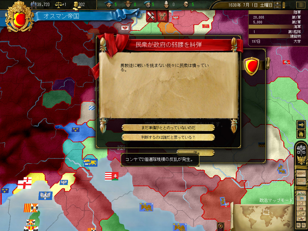 いやまあ,右上の画面で示したとおり,この時点でのオスマン帝国は小アジア半島とバルカン半島にまたがる,比較的有力な国というレベル。民族史的,宗教史的な大目標を前に,いきなり不安が立ちこめるわけだが。