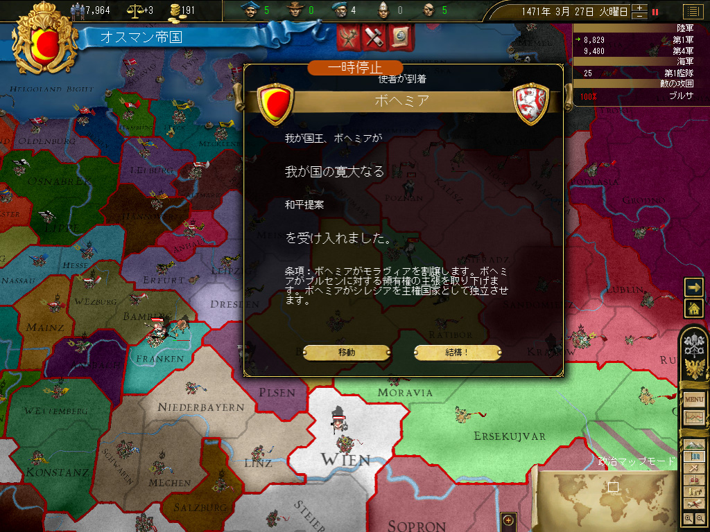 中欧を席巻し,バルカンを安定させ,北イタリアの一部を直轄領とした(金鉱があるので……)オスマン帝国は,満を持して「瀕死の重病人」オーストリアに宣戦布告。神聖ローマ帝国の盟主は抵抗らしい抵抗もできないまま,オスマントルコの属国となることを了承した。ちなみにオーストリア国王が神聖ローマ帝国皇帝を兼ねるというところは変わらないので,形式上,神聖ローマ帝国は,オスマントルコ帝国の封臣ということになる。なんだか,良い具合に歴史が中世に巻き戻ってきましたよ。