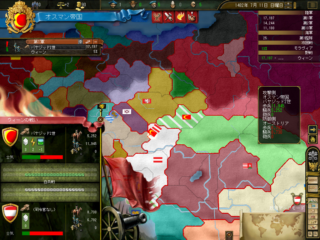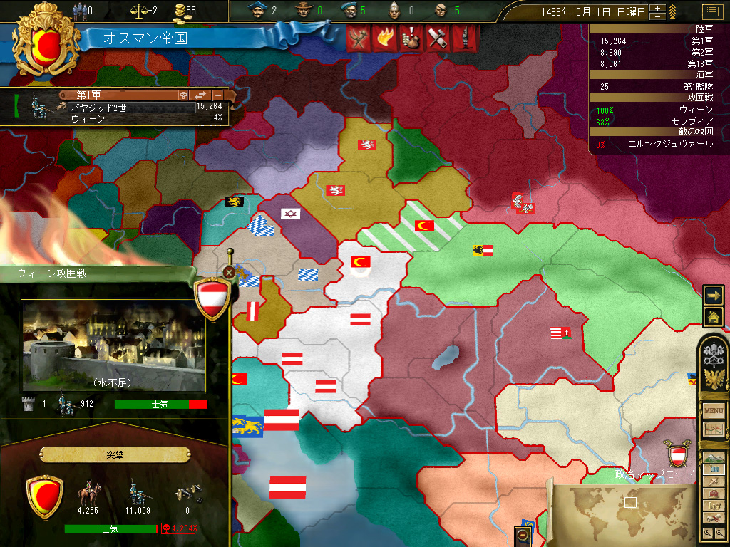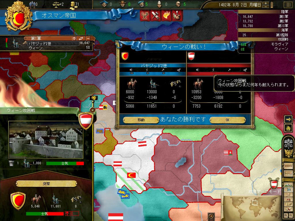 というわけで,やってきました第一次ウィーン包囲。緒戦を数の暴力で押しきり,オーストリア防衛軍を退ける。あとは時間の問題だ。というか,この際一気に突撃をかけてしまうのもいいかもしれない。ポーランド,リトアニアといった国がかなりうざったいので,素早く結果を出してしまったほうがよいだろう……。