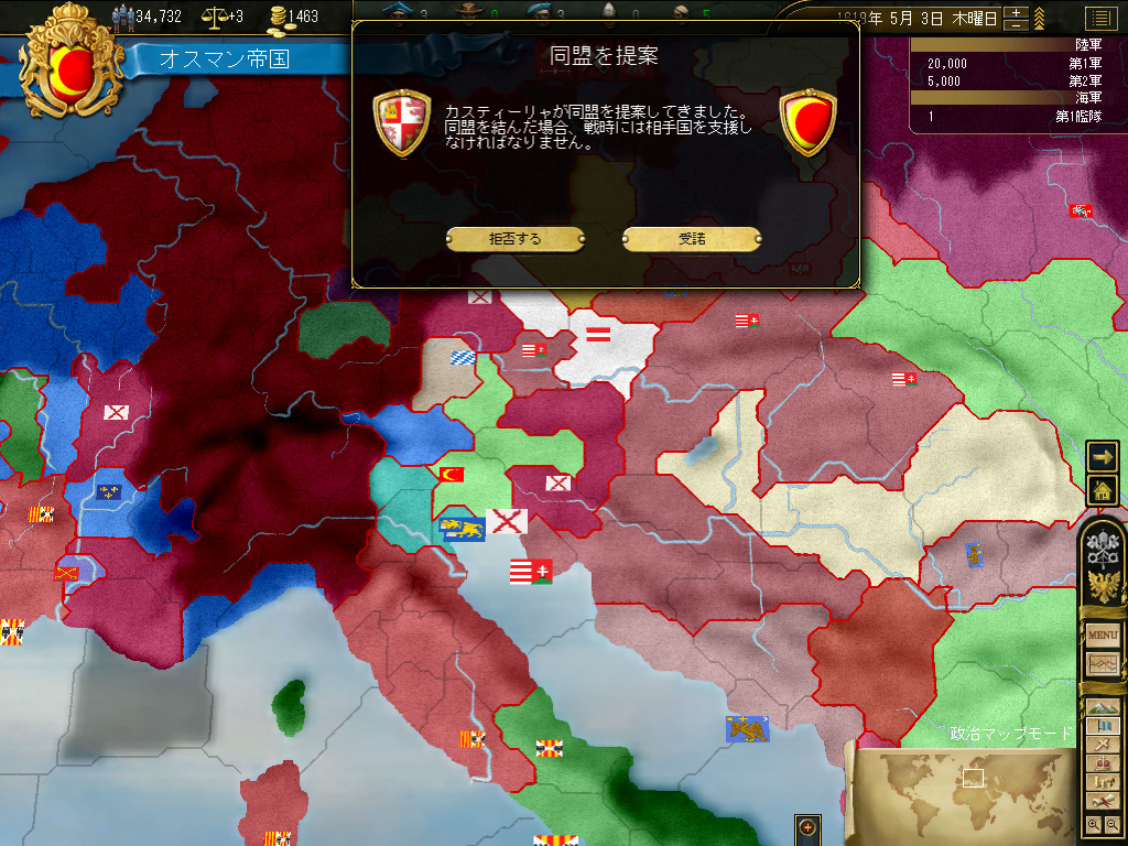 また,技術開発がヨーロッパ圏に比べて遅くなる問題に対しては,国内政治を徹底して改革派にシフトさせ,技術開発速度を上げることで対応する。これによって宣教師による改宗は不可能になるが,それはかまわない――剣で打ち倒したあと,素直に軍事力を提供してくれるなら,コーランまでは強要しなくてもよいではないか。「柔らかい専制」が持ち味なんだし。