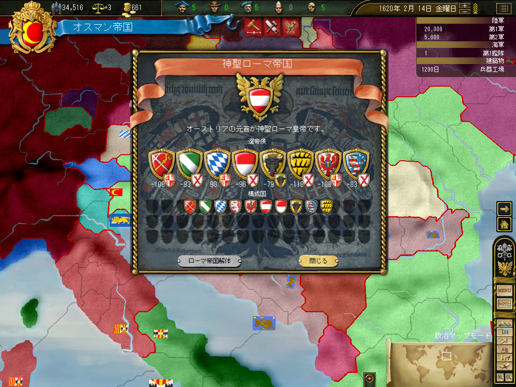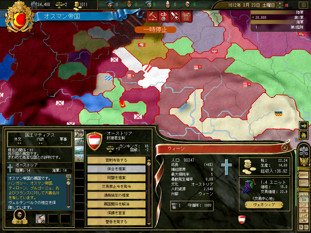 そしてもう一つ重大な政治的要因がある――この頃のオーストリアは,神聖ローマ帝国の盟主である。EU3で神聖ローマ帝国の盟主は,その加盟国の数に応じた人的資源ボーナスを得る。常備軍化されたオーストリアは,オスマン+オスマン同盟・属国軍よりも,人的資源に恵まれていたのだ。