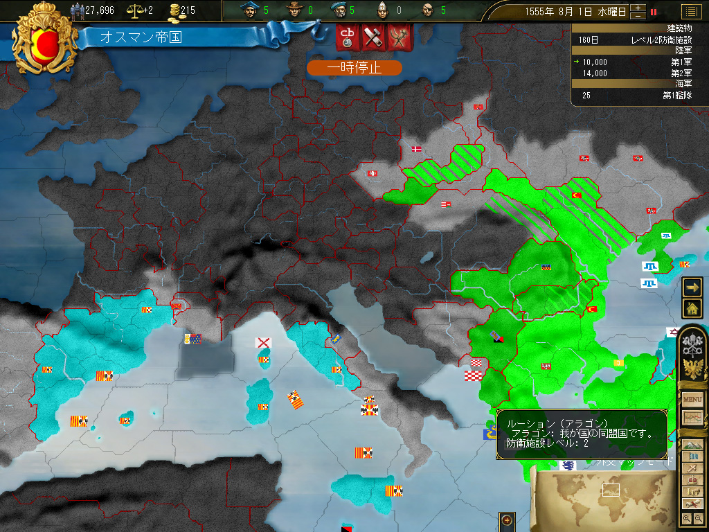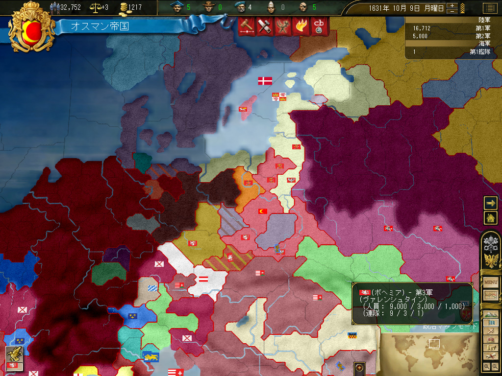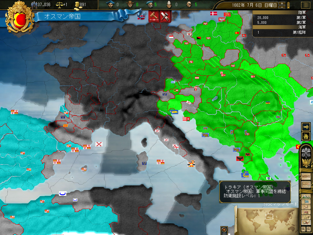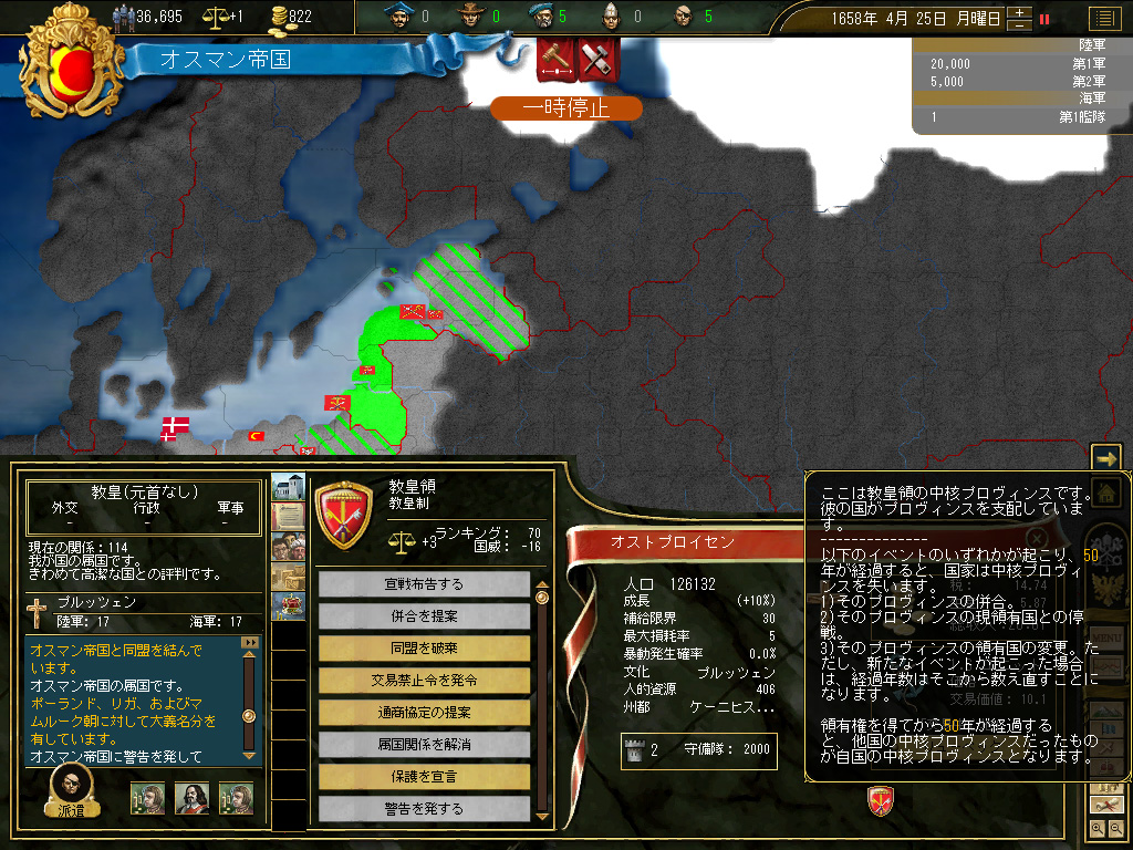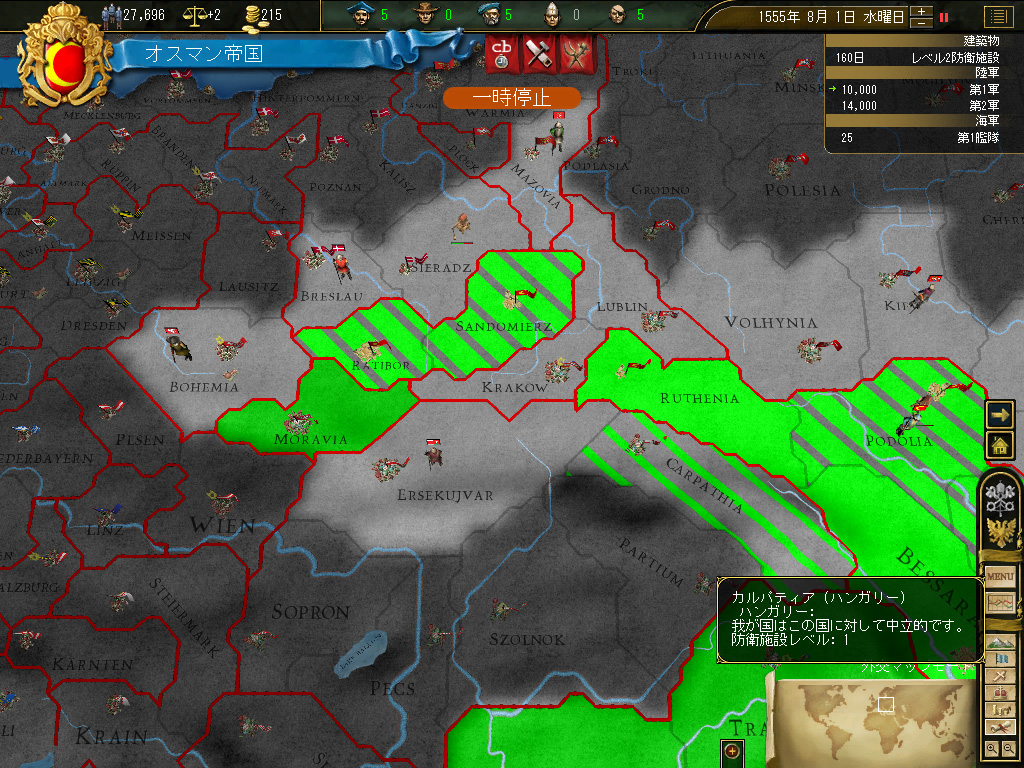 これによって,北方の脅威は大いに縮減した。ポーランドは完全に形骸化しており,リトアニアは事実上完全中立。北と西には小国が乱立しているものの,オスマントルコにしてみれば良いエサの群れである。彼らの兵力を全部足したって,オスマンの連合軍を上回ることはできないのだ。