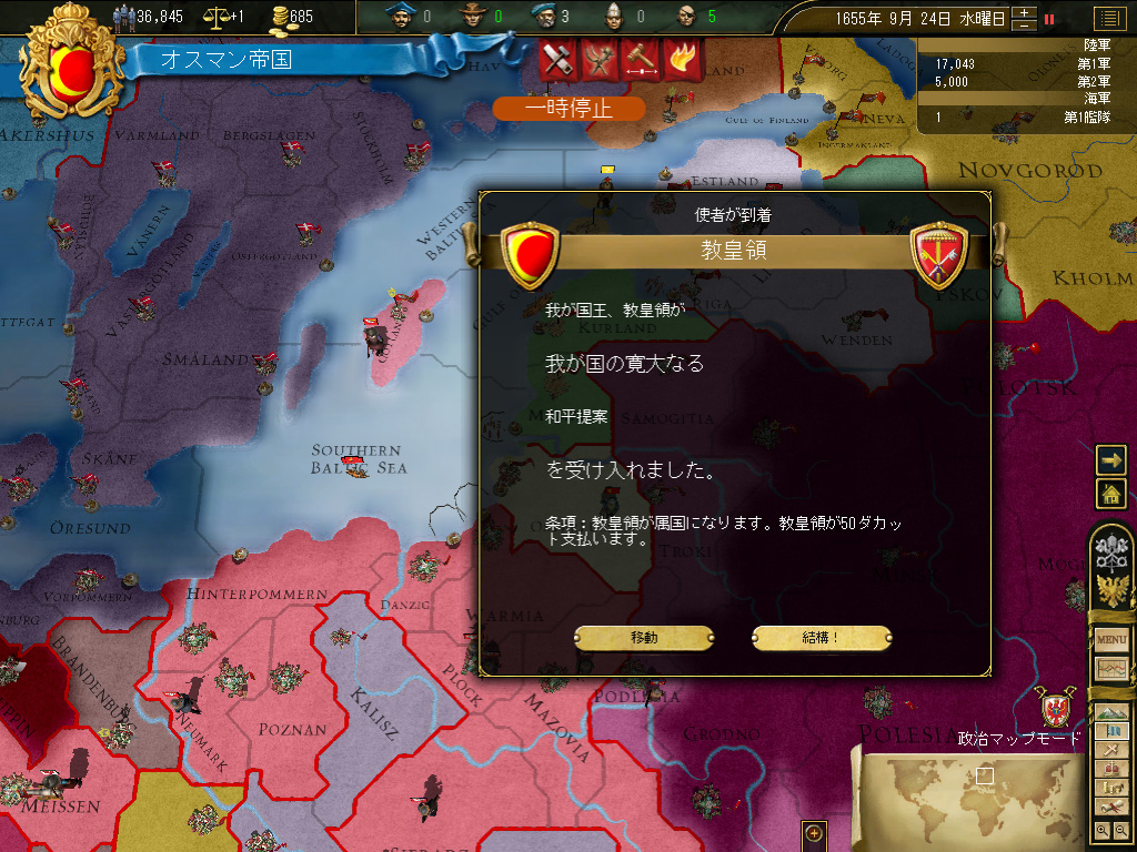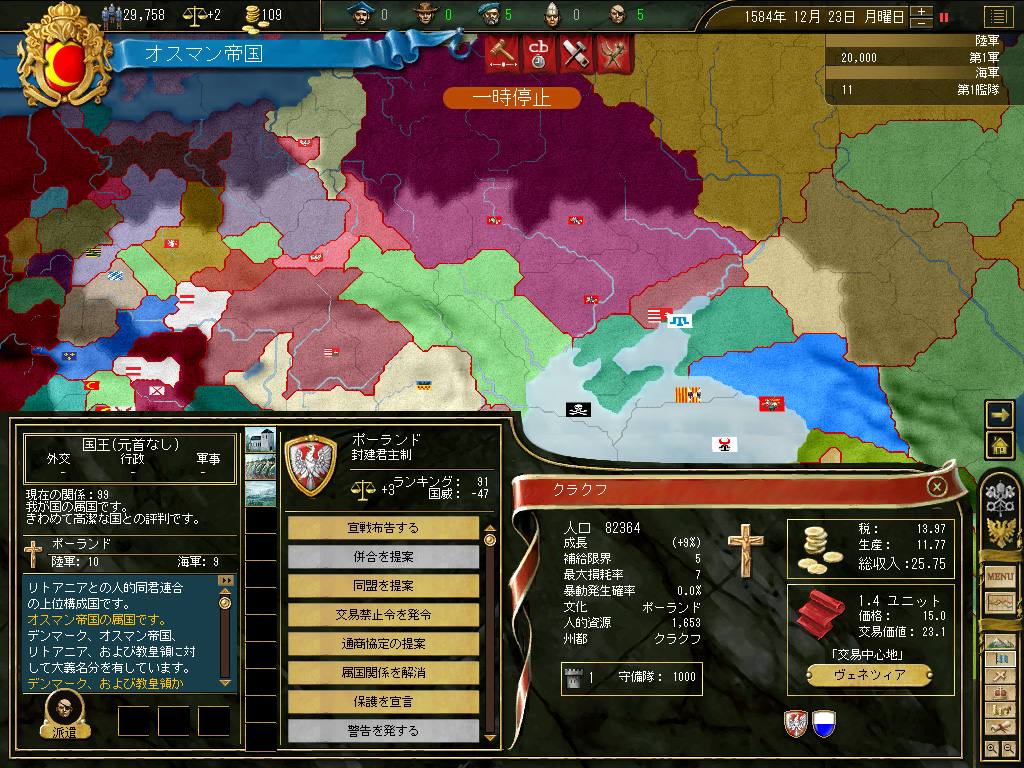 ポーランドは,デンマークやドイツ諸州などによって,あっという間に蝕まれていった。我に勝機ありというわけで,ズタズタになったポーランドの残骸に宣戦布告。電撃戦でポーランド全土を占領し,属国化した。こちらの対ポーランド宣戦布告に合わせて,周辺のキリスト教国が続々と我が国に宣戦布告してきたが,彼らとてついさっきまでポーランドと戦争していたので,国力的に息が続かない。軽くあしらってやると,次々に白紙和平を申し出た。自業自得である。