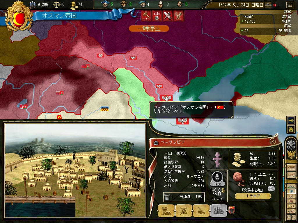 ……本当のことを言えば,たぶんこれは間違いで,最初はクリミアや各種ハン国といった中央アジアのイスラーム小国家を併呑するほうがよい。そしてそのまま北上,モスクワとカザフスタンを制圧し,そこから東進していけば,戦線正面は非常に限定されたものになる。だが,それだとなんだか連載第一回の裏返しになってしまう(おまけにこっちはモスクワの数倍のパワーがある)ので,あくまでも戦争はキリスト教徒と行うことにした。