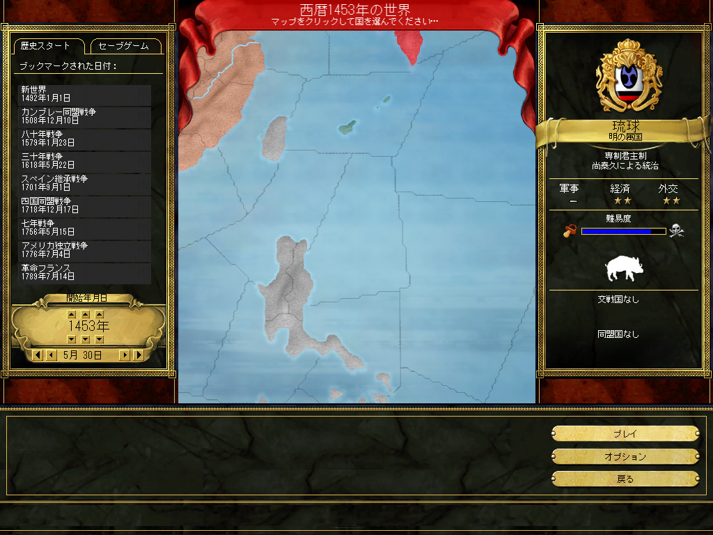 というわけで,今回は琉球王国を使って東アジア交易国家の顛末を見てみたい。いやまあ,このゲームでプレイヤー国として琉球が選べるだけでも,かなり驚愕なんだけど。