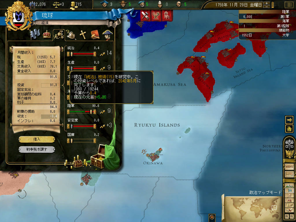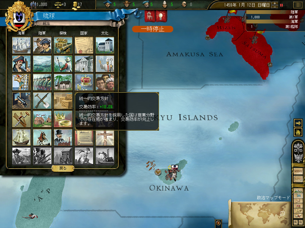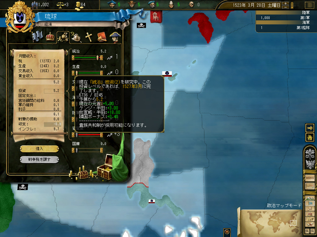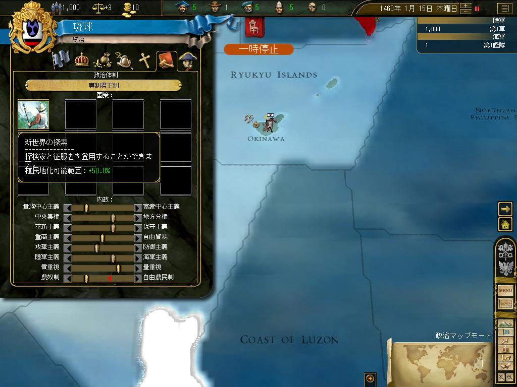 台湾の植民地化が終わったところで,国策を「新大陸の探索」に切り替える。国策の変更に伴う安定度ペナルティ−3は交易国家には痛い(派遣できる商人の数には,国家の安定度が強く影響する)が,琉球は現状,琉球本島と台湾のみで構成された小国なので,その国家の面積的/人口的規模に比して巨額といってもいい税収を活用すれば,安定度の回復はいたって迅速に達成される。