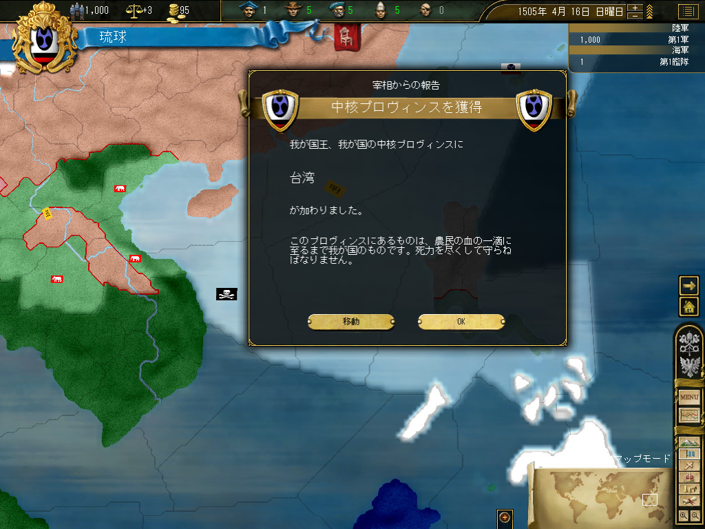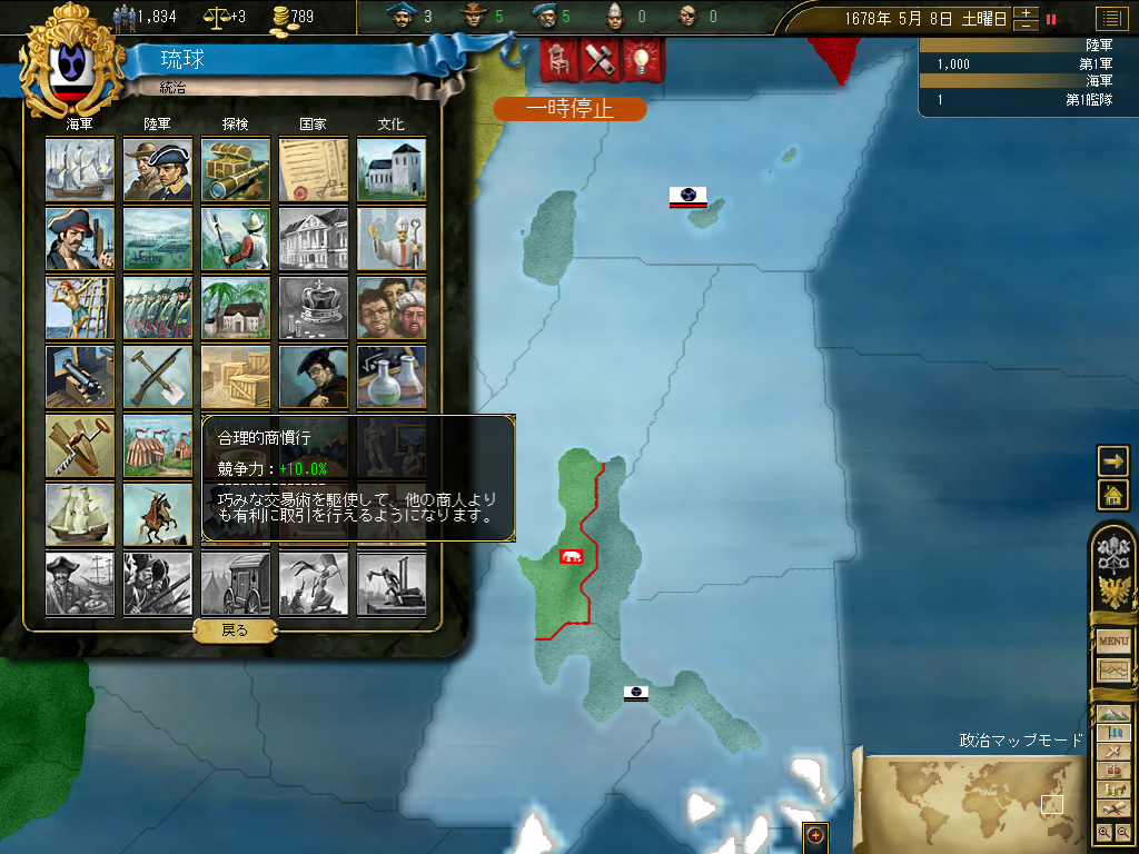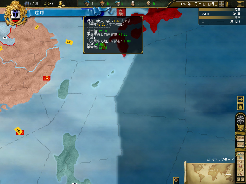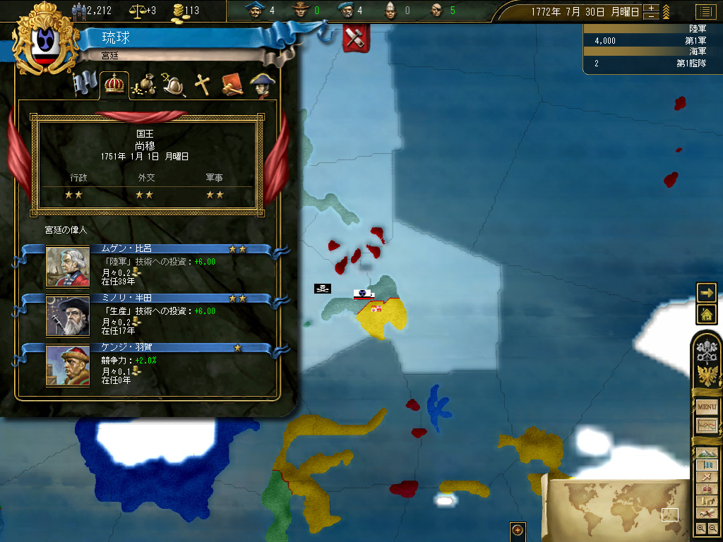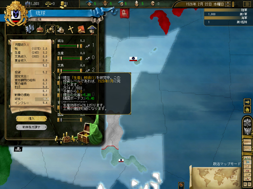 台湾の植民地化が終わったところで,国策を「新大陸の探索」に切り替える。国策の変更に伴う安定度ペナルティ−3は交易国家には痛い(派遣できる商人の数には,国家の安定度が強く影響する)が,琉球は現状,琉球本島と台湾のみで構成された小国なので,その国家の面積的/人口的規模に比して巨額といってもいい税収を活用すれば,安定度の回復はいたって迅速に達成される。