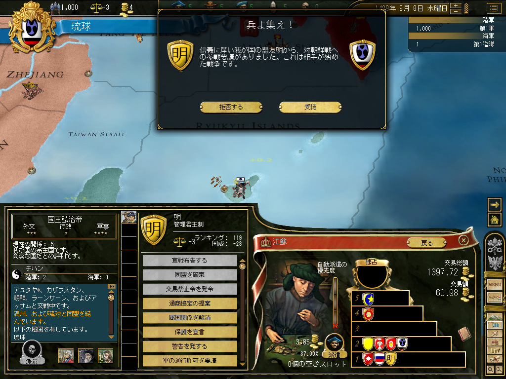 と,なんだか攻略記事のようなノリで始まってみたが,これには理由がある。上記のような基本戦略を胸にプレイを始めたくらいでは,琉球王国はぶっちゃけまったくもって立ち行かないのだ。悪くすると20年かからずに破産,良くてもまず100年くらい低迷して,その後も低迷。明の属国扱いとなっているので日本から宣戦されたりすることはない(合理的思考を旨とするAIは,普通朝鮮出兵など選ばない)が,これはただ単に死んでいないというだけで,生きているとはとうてい言いかねる。