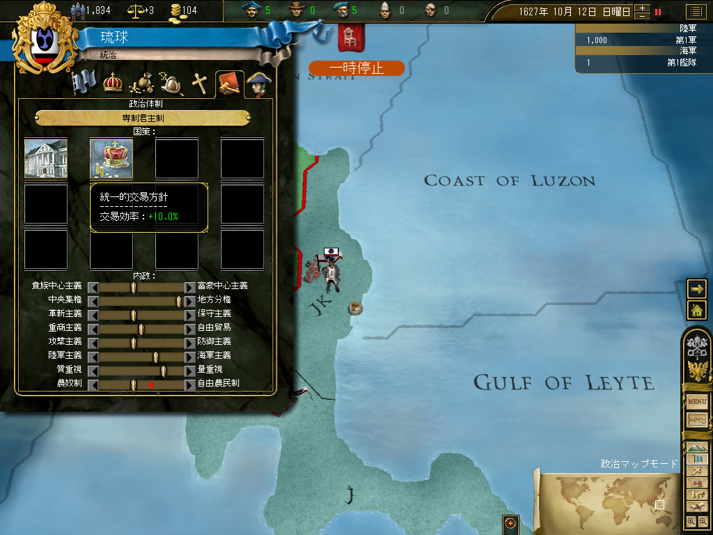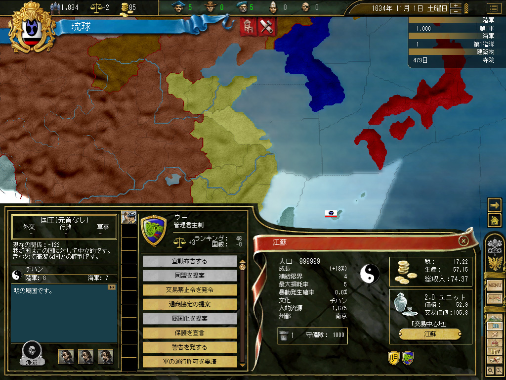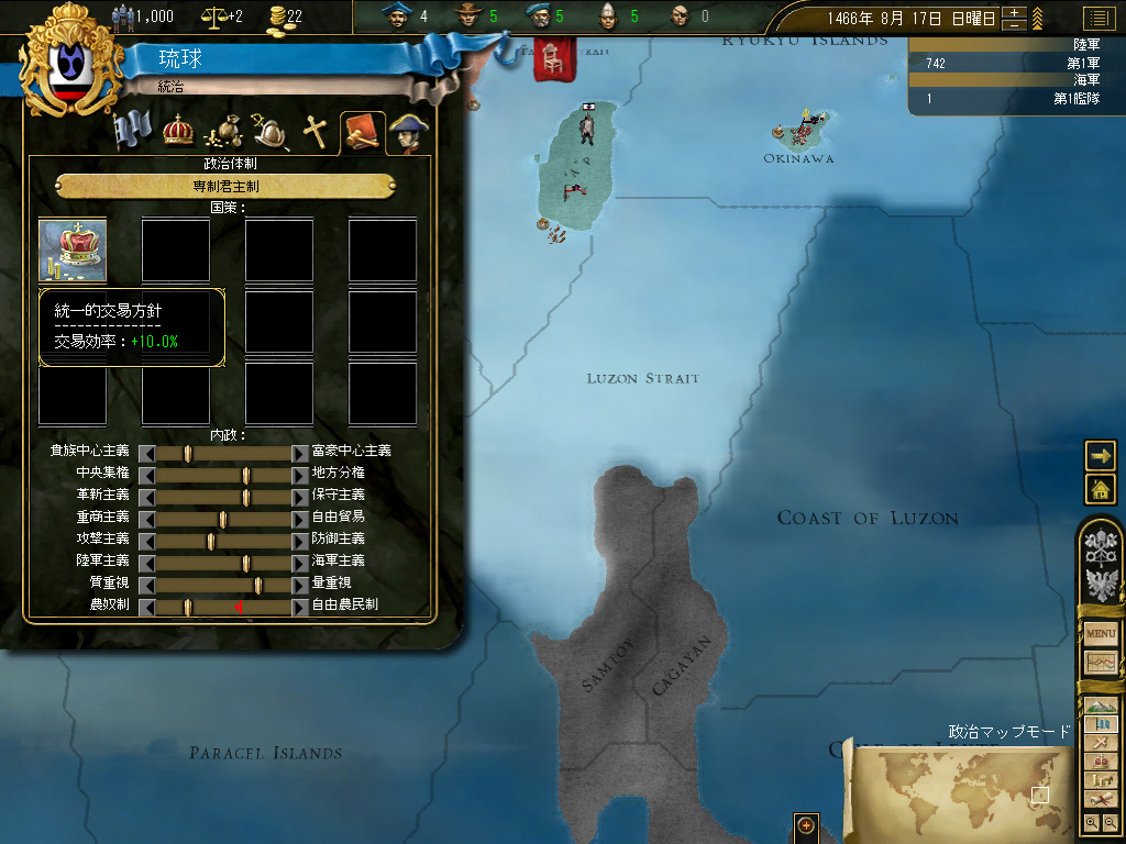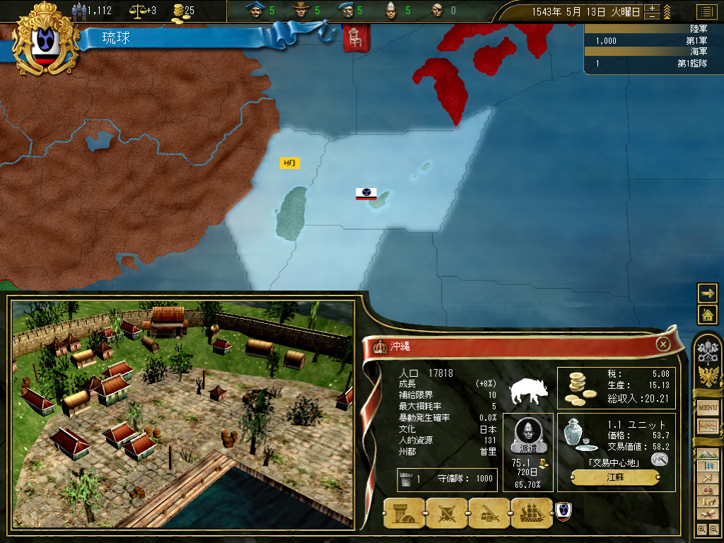 というわけで,まずは国策として「統一的交易方針」を採用する。「新大陸の探索」じゃなかったのかよ! と言われそうだが,これにも理由がある。琉球本島の経済規模では,そこから得られる税金だけで何かをするのは無理である。そのため,まずは中国本土に商人を派遣,そこで交易利益を稼ぎ,稼いだ税収を貨幣の鋳造に充てて,活動資金を確保しようというわけだ。