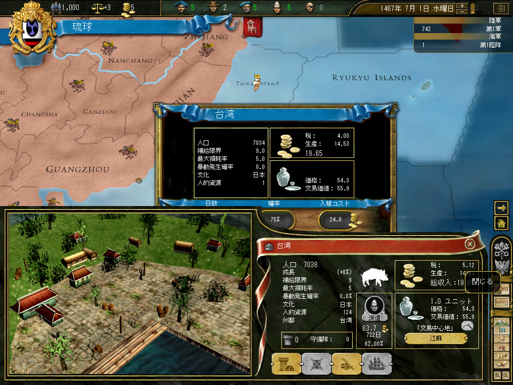 こうして稼いだ資金を利用して,台湾に植民を開始する。のっけから明にすごい勢いでケンカを売るようなムーブだが,怒られなかったのでよしとしよう。台湾は陶磁器を生産しており,また人口も多い。右肩上がりで進行するインフレは脅威ではあるが,生産による基本的な税収は大幅に向上し,兵役人口も上向いた。