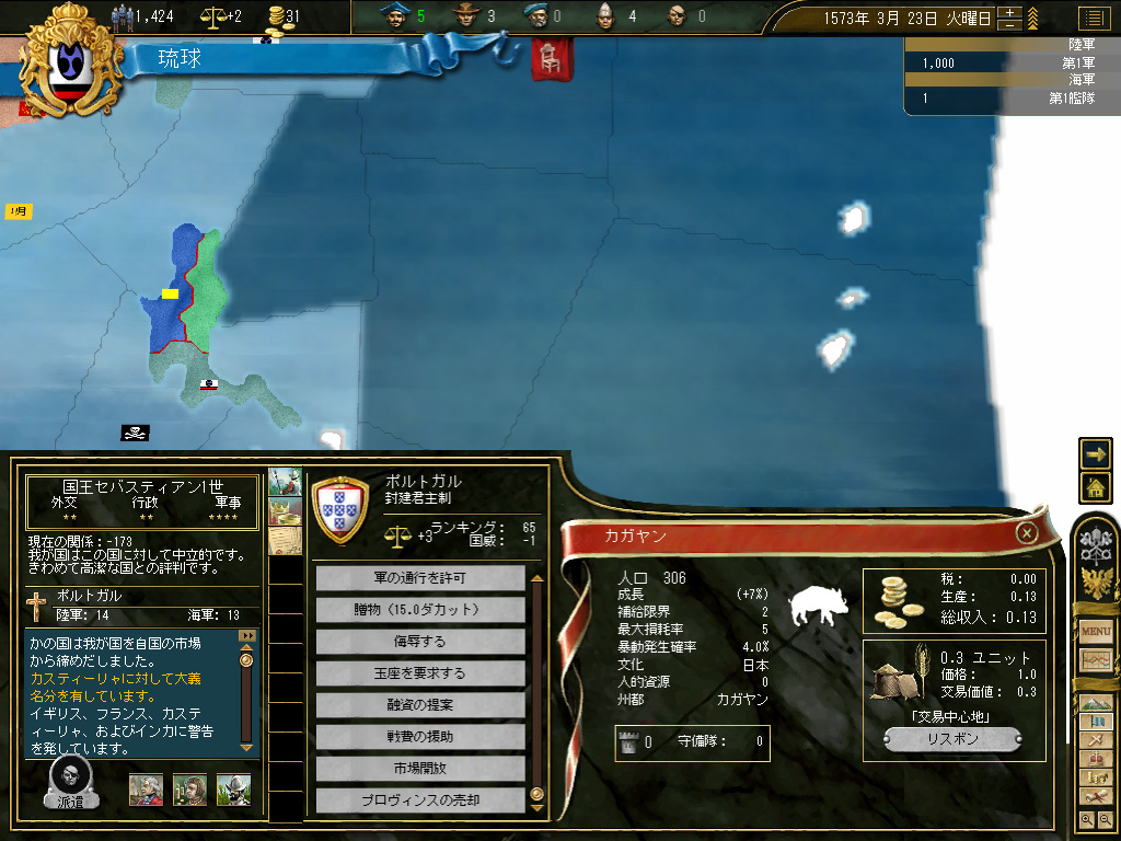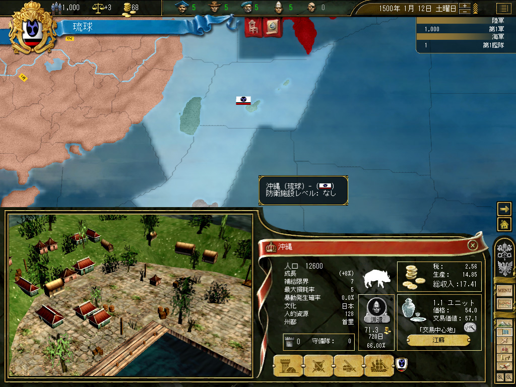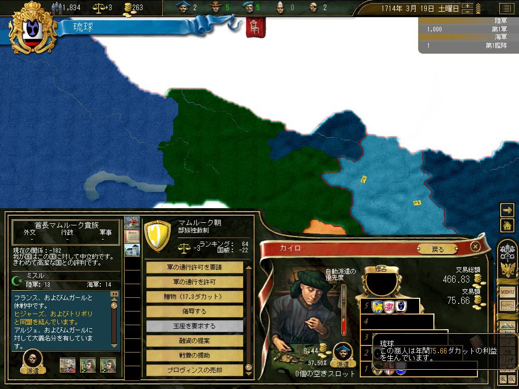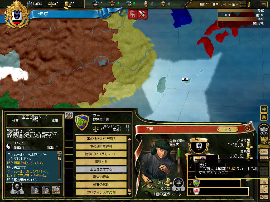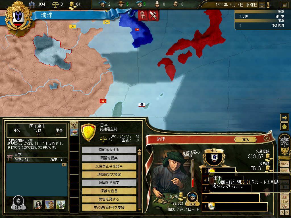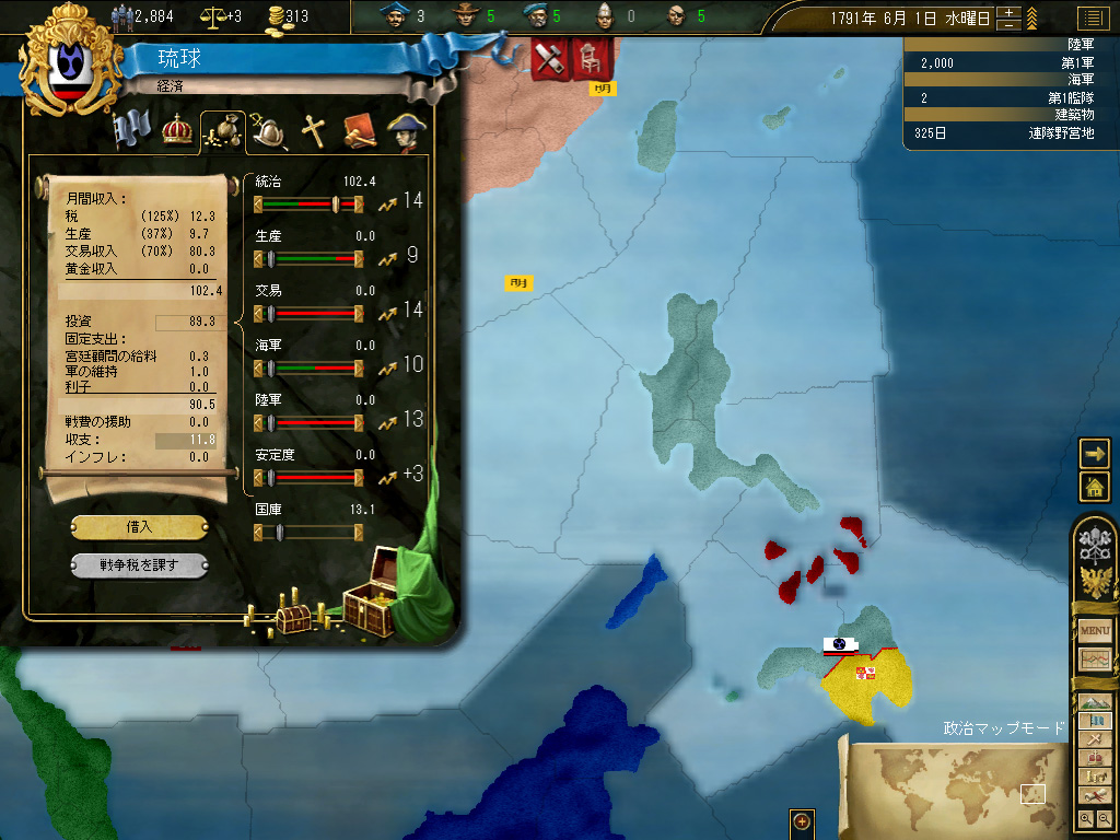 結果,琉球の財政規模は月当たり100ダカット近くにまでふくれ上がった。これがどれくらい大きいかというと,前回のドイツ騎士団がゲーム開始直後に10ダカット程度の経済規模だったことから推測していただきたい。いまや1琉球=10ドイツ騎士団というレートなのである。