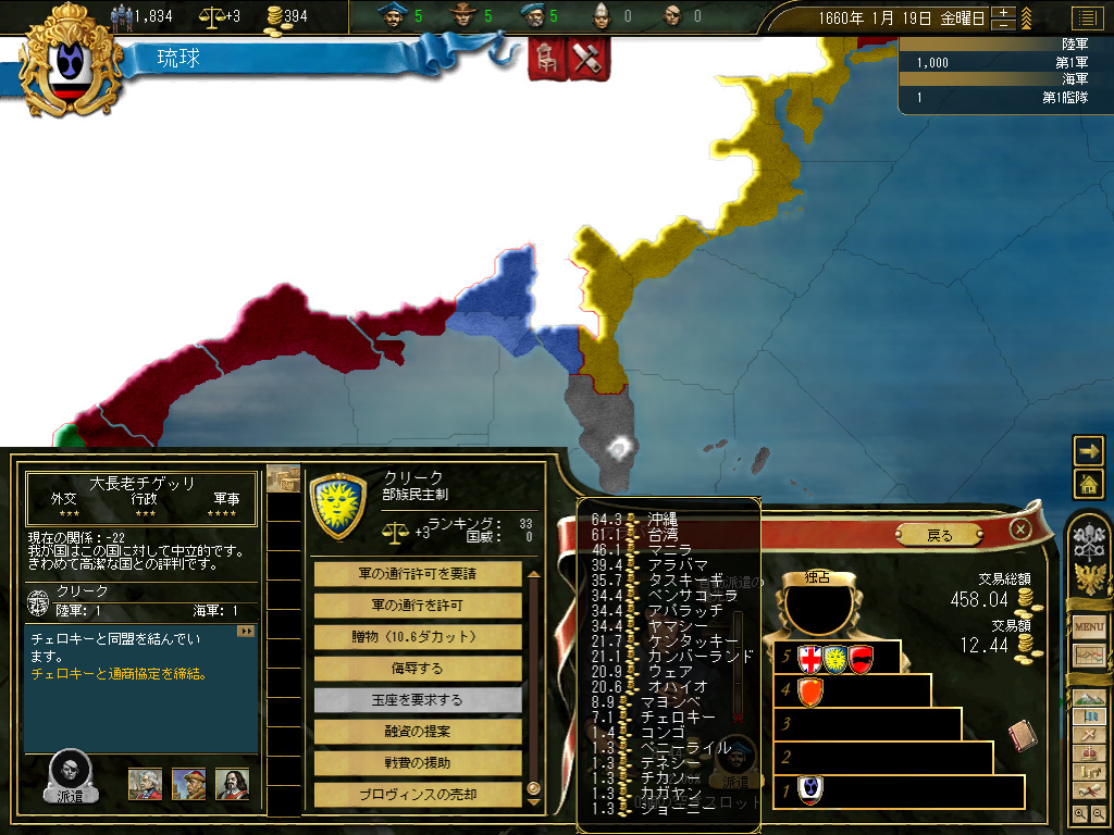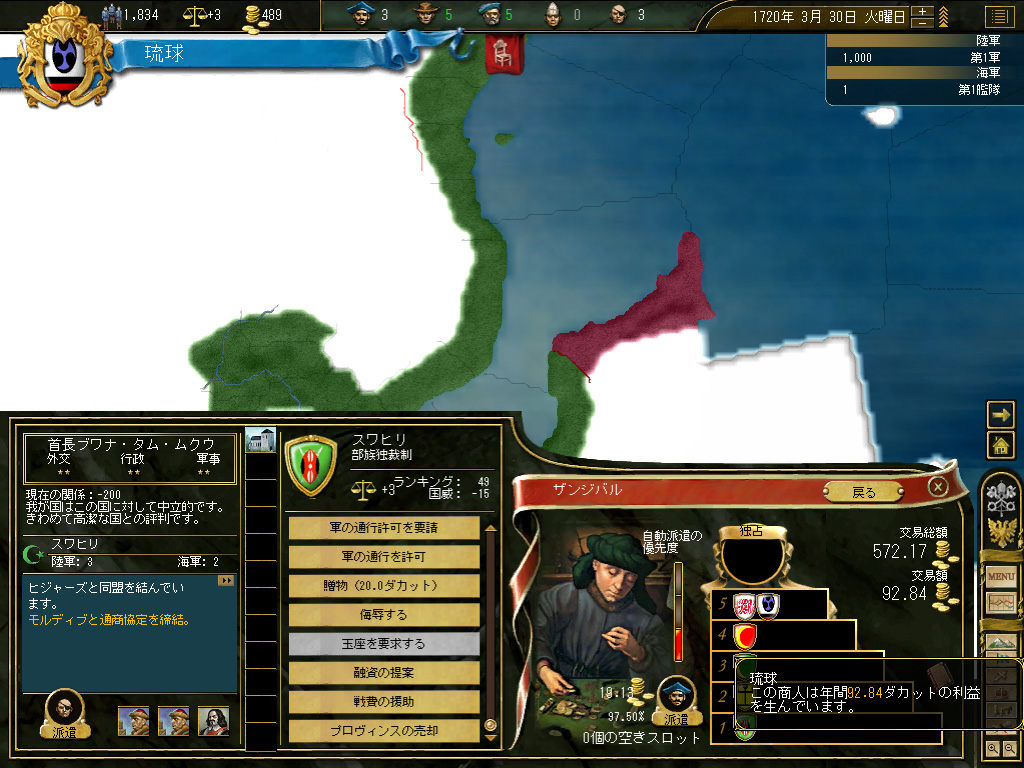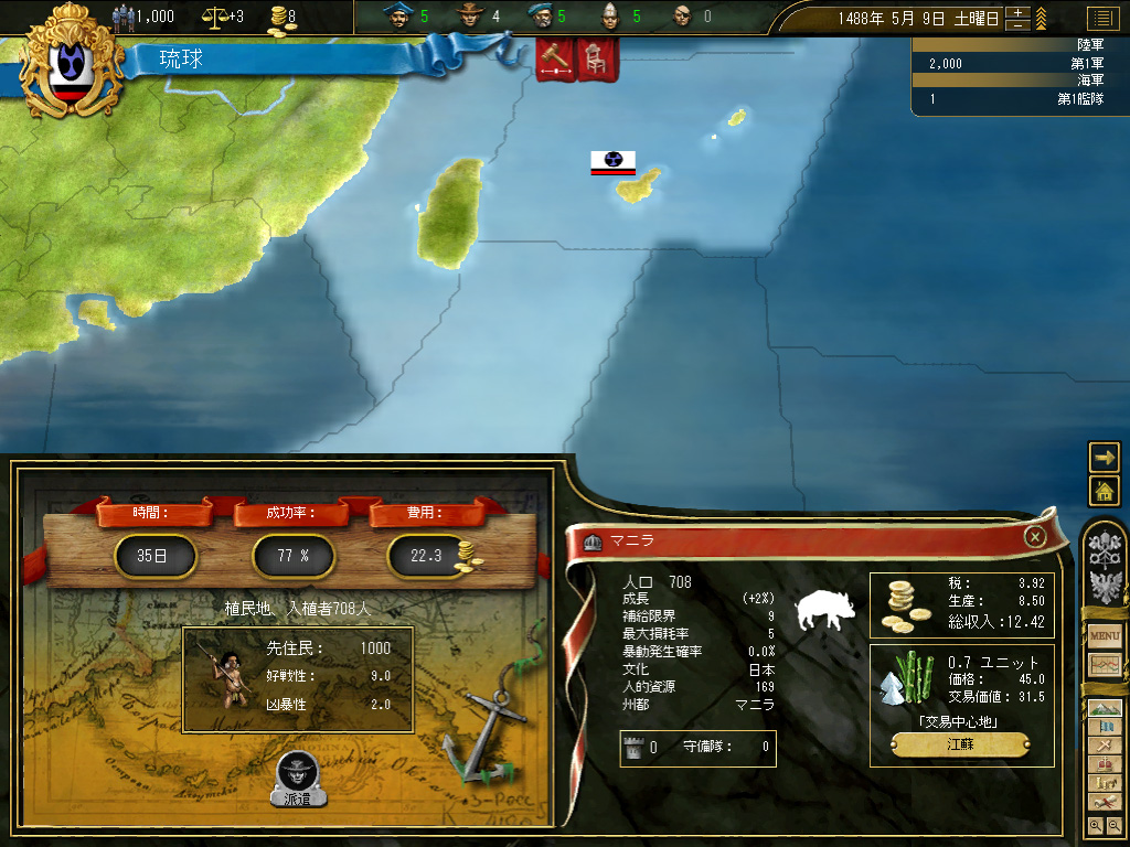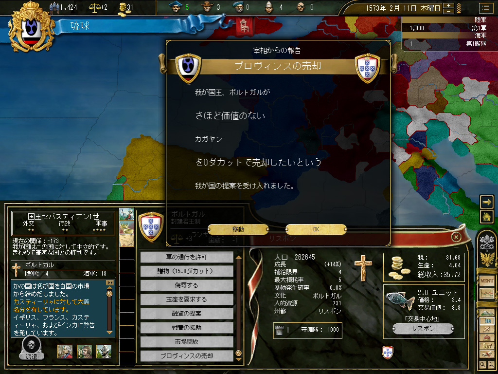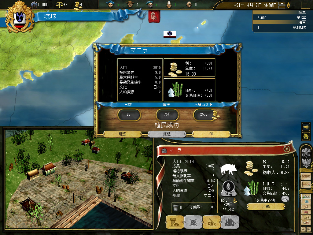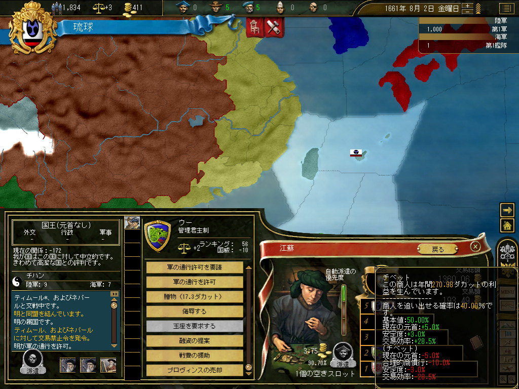 結果,琉球の財政規模は月当たり100ダカット近くにまでふくれ上がった。これがどれくらい大きいかというと,前回のドイツ騎士団がゲーム開始直後に10ダカット程度の経済規模だったことから推測していただきたい。いまや1琉球=10ドイツ騎士団というレートなのである。