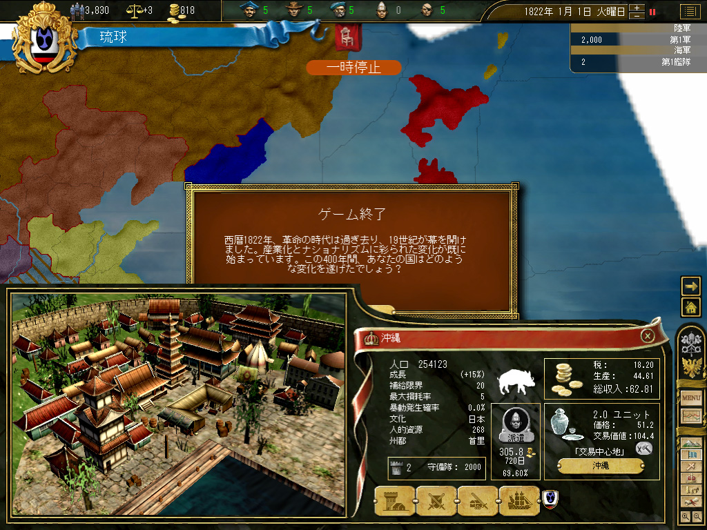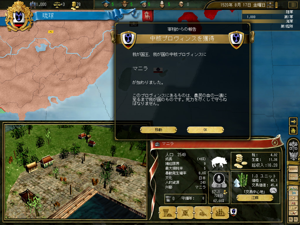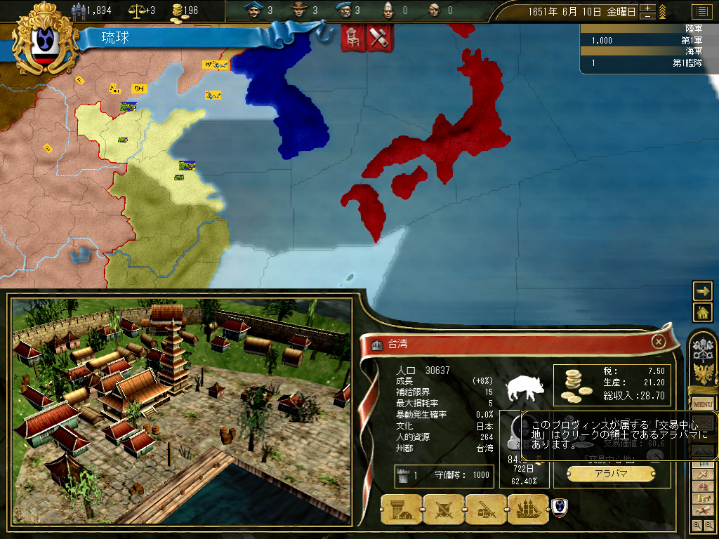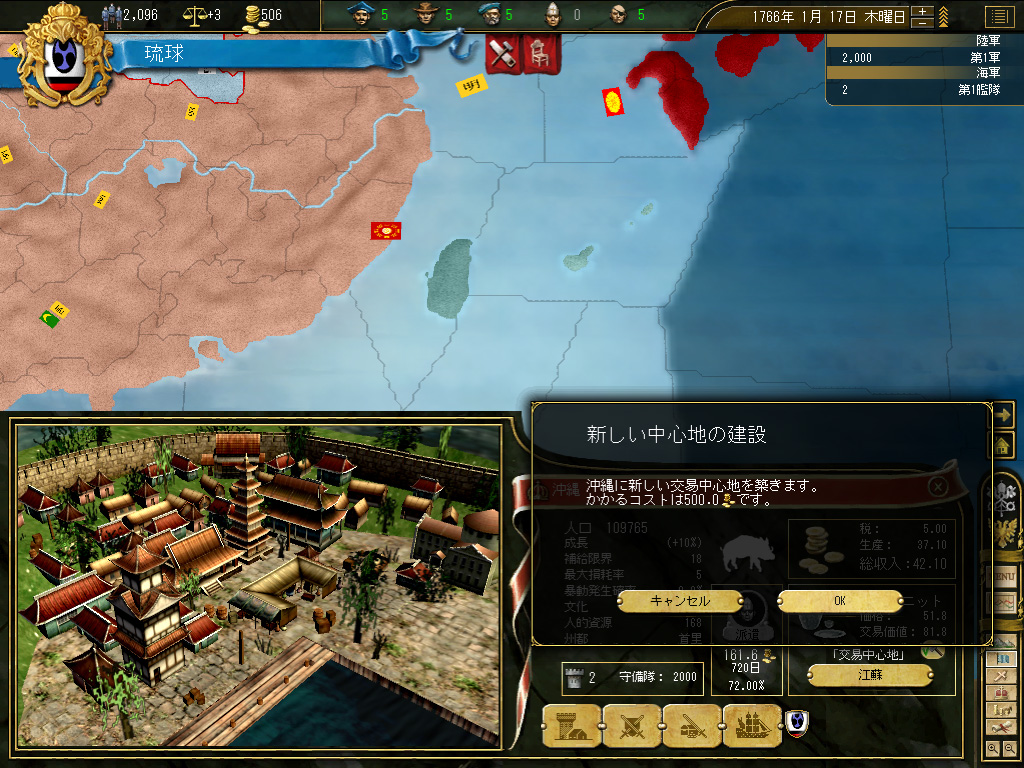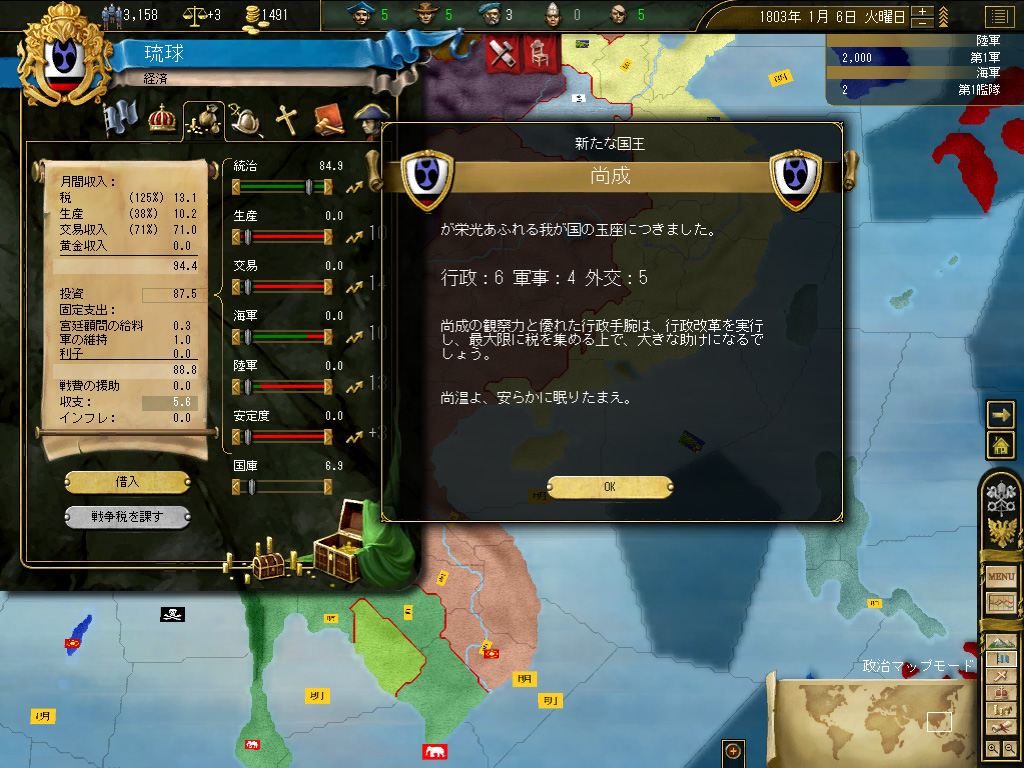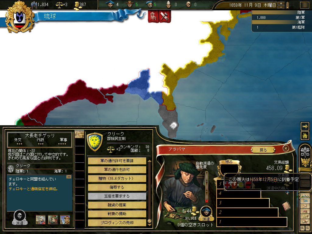 結果,琉球の財政規模は月当たり100ダカット近くにまでふくれ上がった。これがどれくらい大きいかというと,前回のドイツ騎士団がゲーム開始直後に10ダカット程度の経済規模だったことから推測していただきたい。いまや1琉球=10ドイツ騎士団というレートなのである。