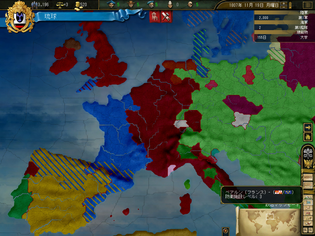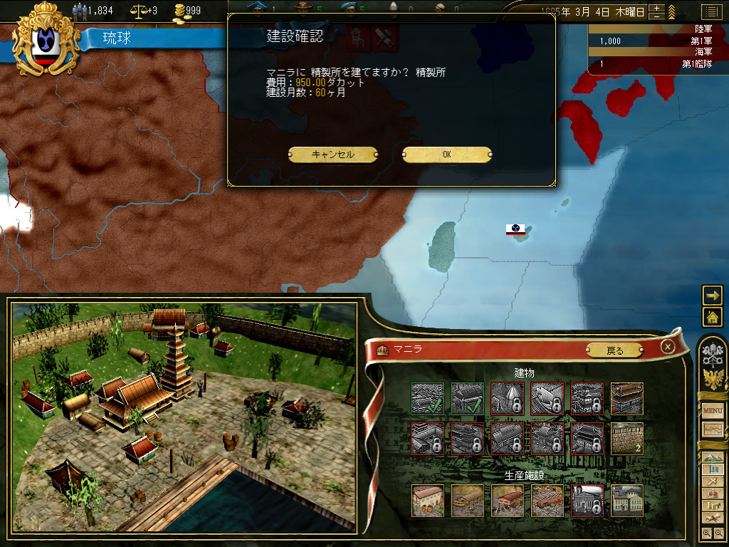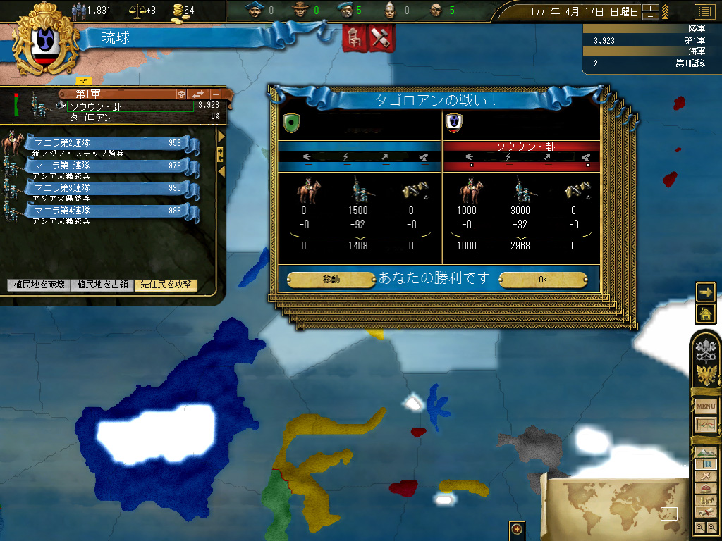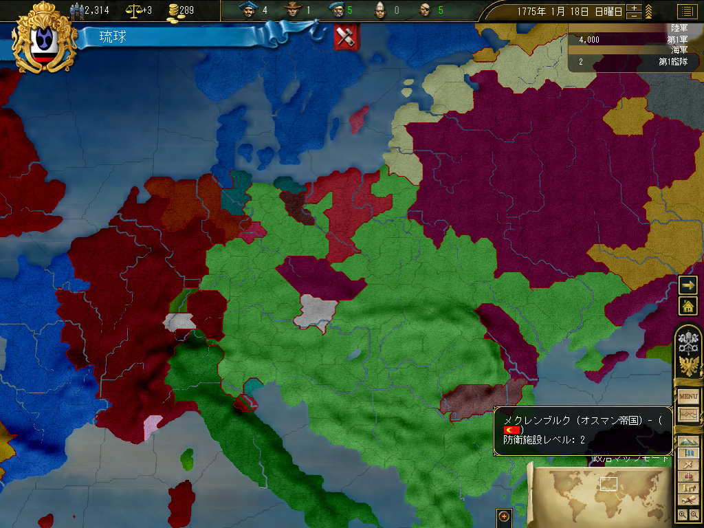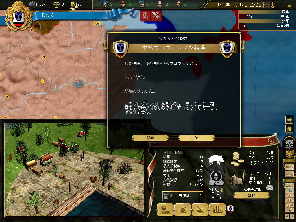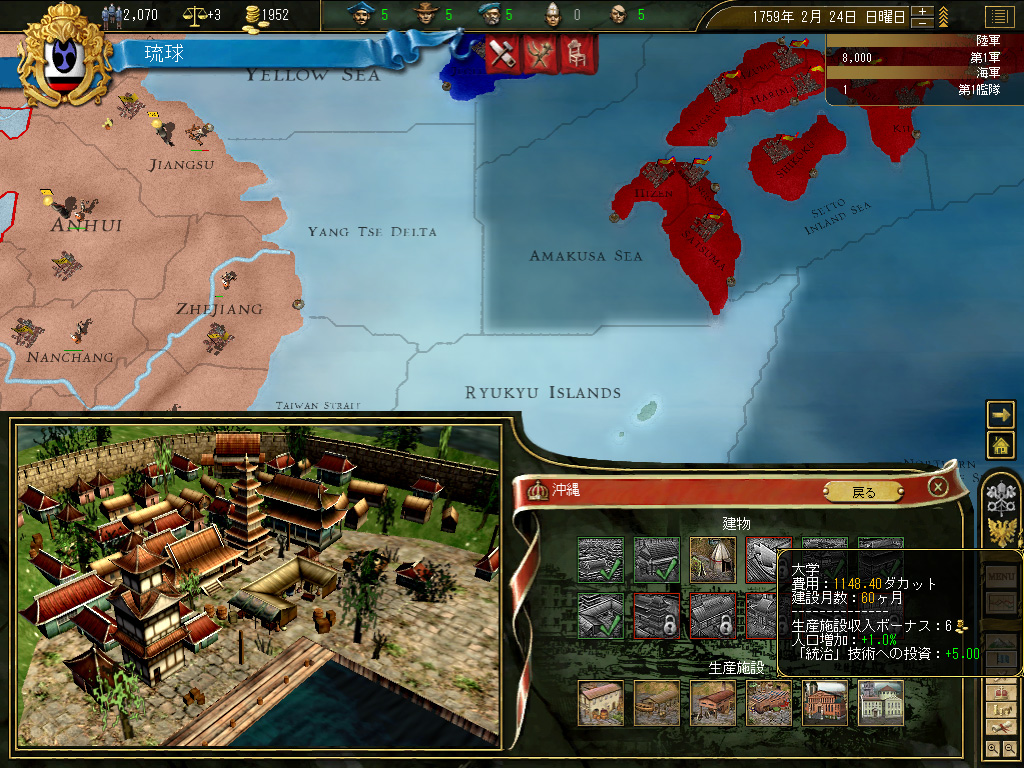 結果,琉球の財政規模は月当たり100ダカット近くにまでふくれ上がった。これがどれくらい大きいかというと,前回のドイツ騎士団がゲーム開始直後に10ダカット程度の経済規模だったことから推測していただきたい。いまや1琉球=10ドイツ騎士団というレートなのである。