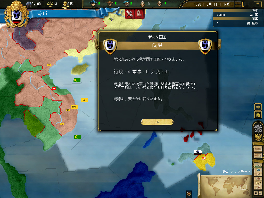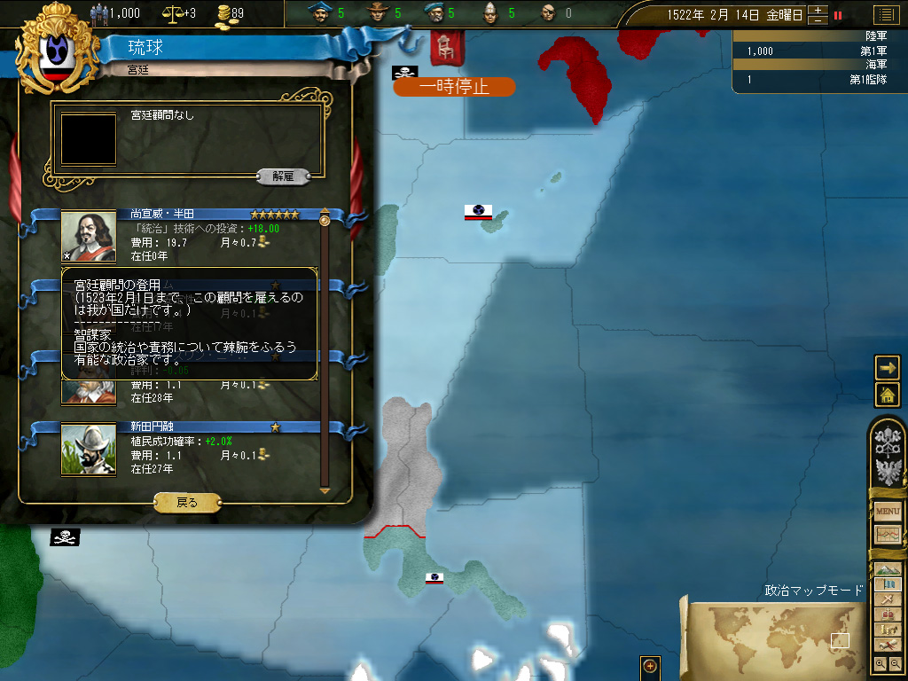 これがヨーロッパであれば,そそくさと最初の国策を取って交易レースに打って出,インフレ覚悟で収益を稼ぎつつ交易技術と統治技術を向上させ,第二の国策を取りつつ市場の独占も可能となったら,次は商売の範囲を世界に……と行けるのだが,琉球ではそもその「最初の国策を取って」のあたりでつまずく。つまずくというか,始めさせてもらえない。