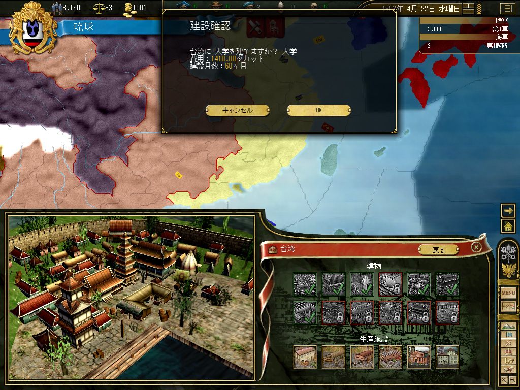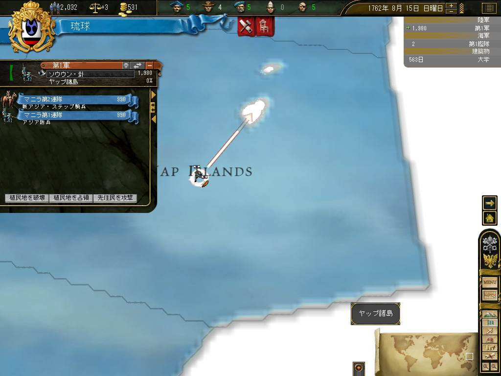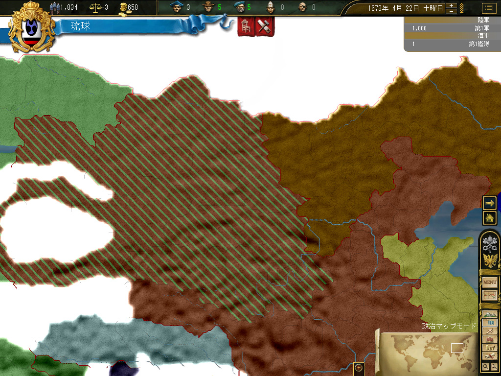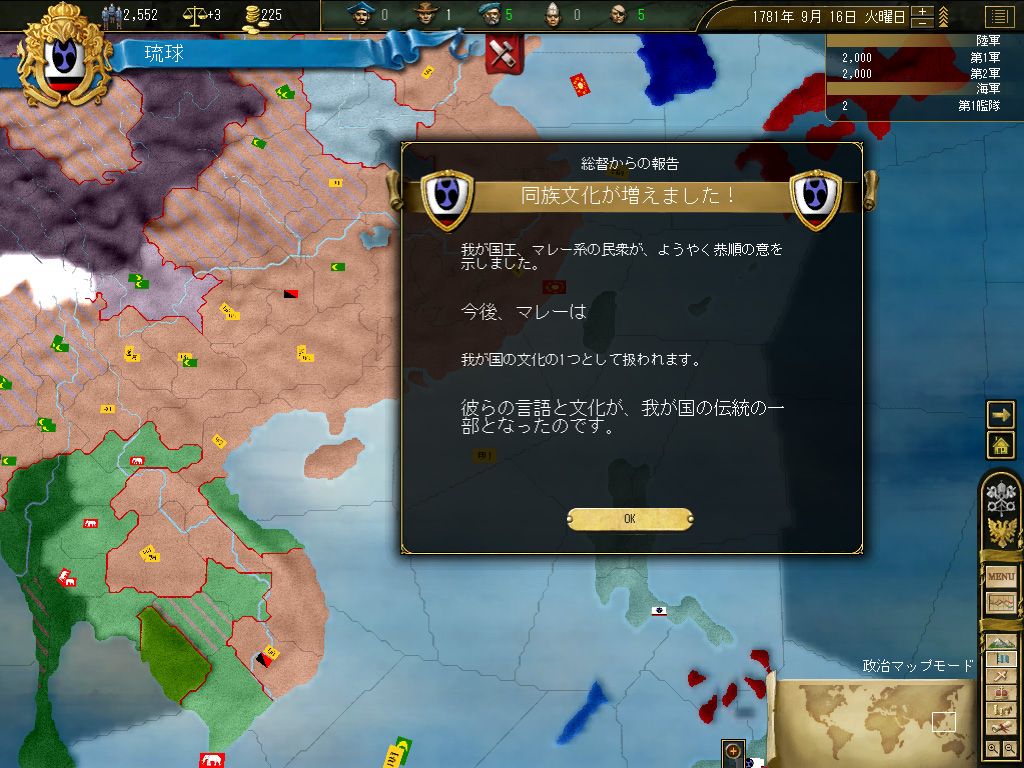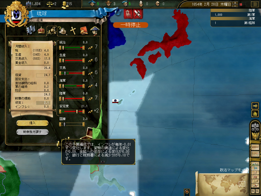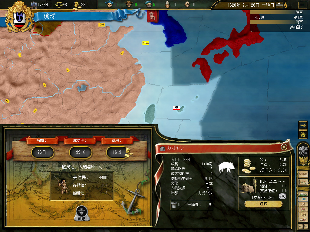 積極的に戦争をしたいわけではないが,将来どこかで反乱でも起きた場合,完全に傭兵頼みの鎮圧戦に持っていきたいとも思わない。というか,不幸なイベントが連続して琉球本島での反乱発生確率が0.3%に達したところ,そこで反乱発生→国家終了という素晴らしいコンボを踏んだことがあるので,そういった前世の記憶にも配慮すると,最低限の軍隊を維持できるスペースと人口は,どうしても確保したいのだ。
