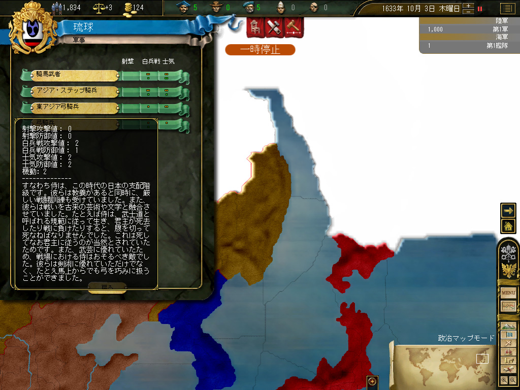 最後に,超大国である明との軍事同盟を利用し,明が引き起こした戦争に乗じて漁夫の利を狙うというアイデアが,まったく活かせないという問題がある。なぜか? 人的資源が1000人しかおらず,陸軍の維持最大部隊数は2部隊,つまり2000人まで。仮に完璧なタイミングで漁夫の利を得たとしても,そのあとにそのプロヴィンスで数回は確実に発生するであろう住民反乱に,まるで対応できない。傭兵を雇えばある程度まで対抗できるだろうが,果たして傭兵を雇って維持できるだけの“上がり”が確保できるかは不明だ。