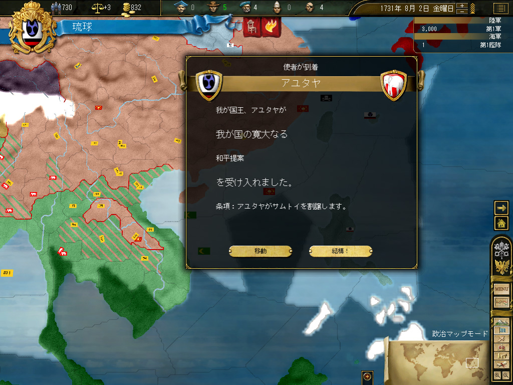 軍事的には非常に心もとないところはあるが,明は相変わらず東洋の巨人であり,明の庇護下にある限り侵略される心配はほとんどない。もっとも,「幸運」(ゲーム開始時にシステム上こっそり5か国選ばれる,幸運な国家。いろいろとプラス修正が得られる)を得ていたティムールが西から張り出して来ており,アジアの盟主はゆくゆくティムールの手に収まりそうではあったが,東南アジア付近に限定すれば,明より大きな国は存在しない。