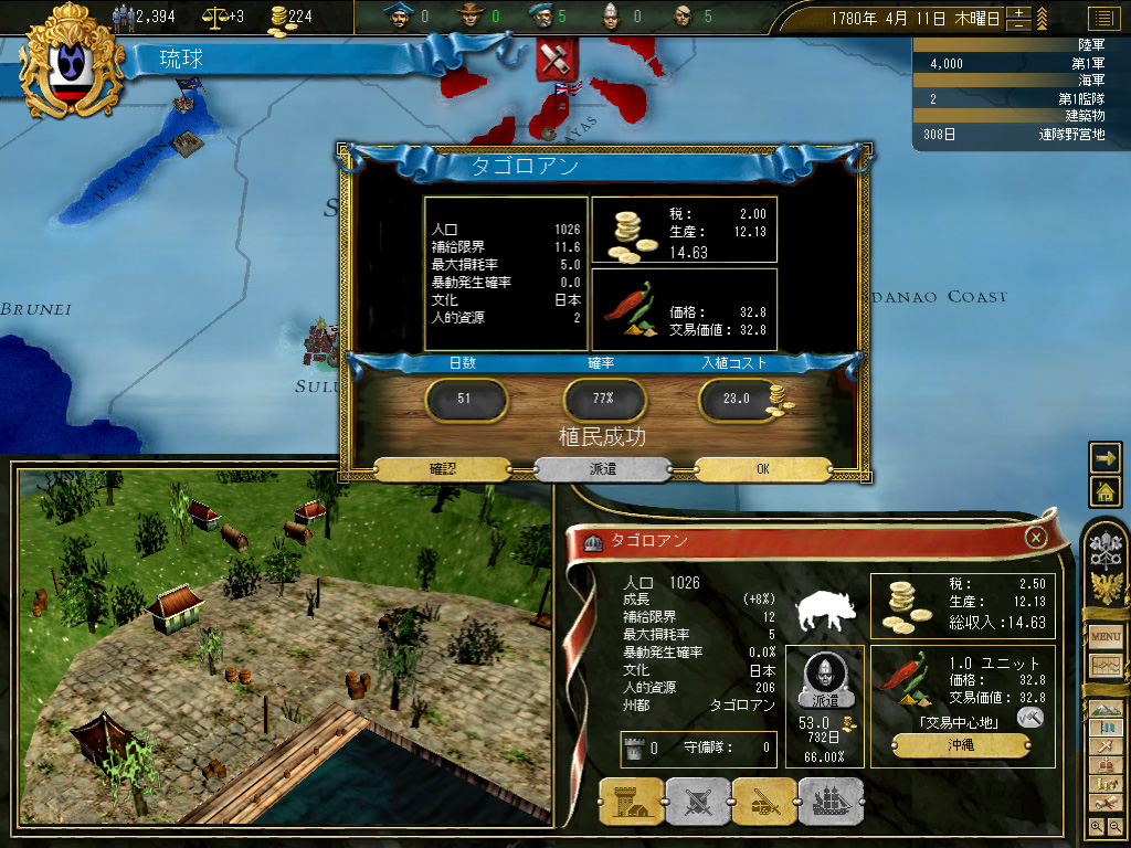 一方そのころ,マニラの北にアユタヤが植民を開始する。将来的に戦争が起こったときに非常に煩い存在になりそうだったので,その隣のプロヴィンスを押さえておくことにする。アユタヤの扇動による原住民反乱が厳しかったので傭兵の数を増やし,植民開始。何とか無事に植民は完了した。