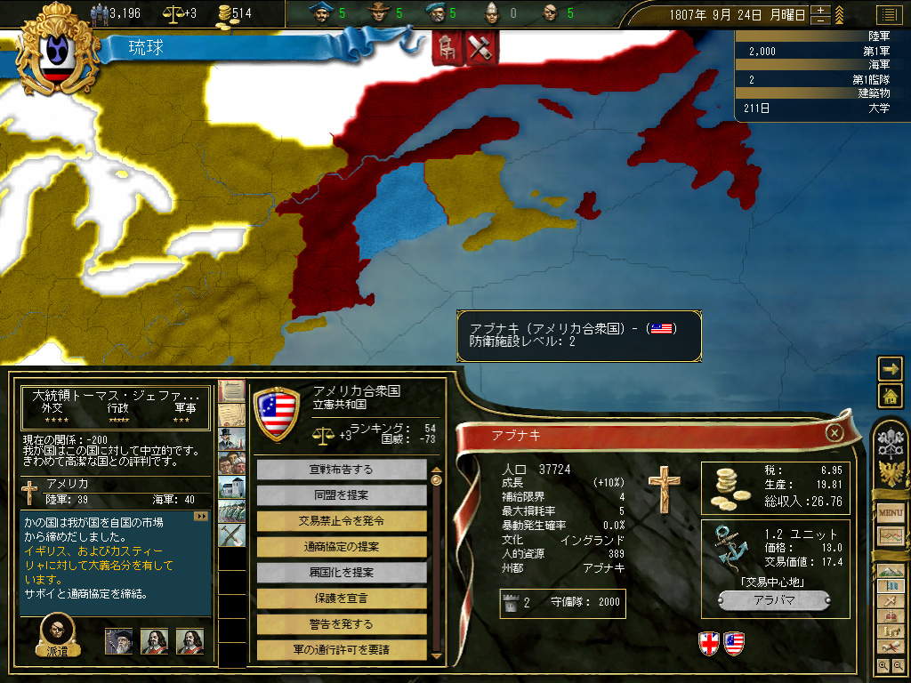 問題は,この「商人」にまつわる部分にある。商人を派遣するに当たっては,当然ながらそのCoTが既知の土地になくてはならない。また派遣先のCoTを支配する国が,こちらに対して市場を開放していなければならない。この時代,「鎖国」をしていた国は意外と多く,また重商主義の芽生えとともに,国益のために市場の封鎖が行われることはよくあった。