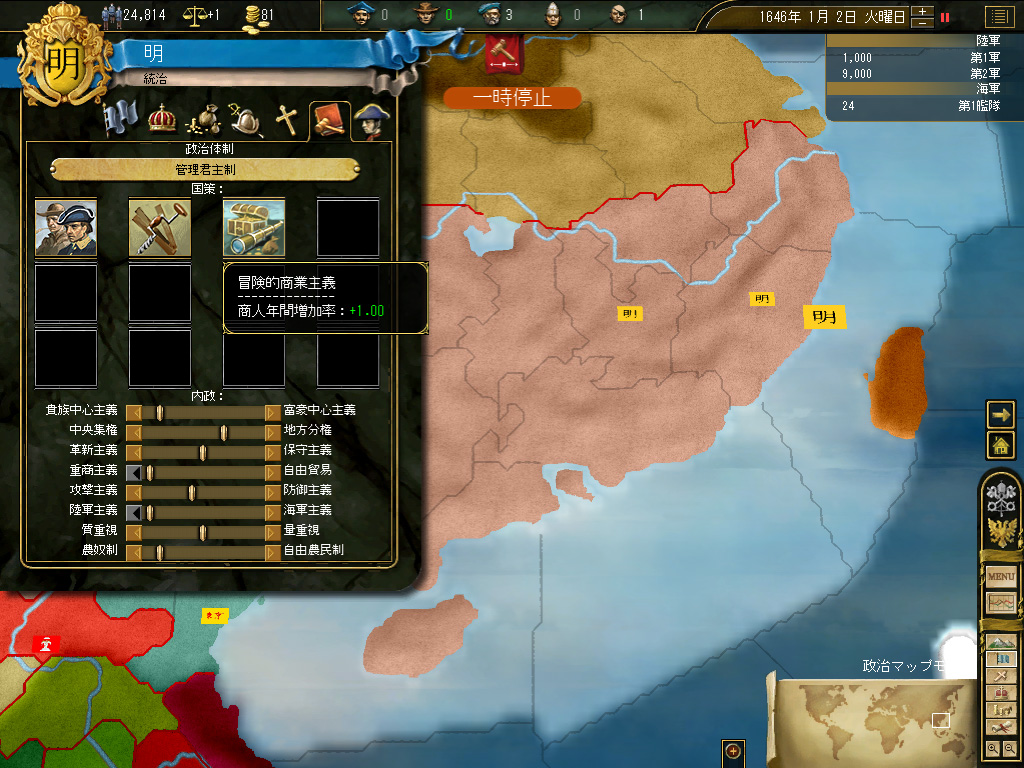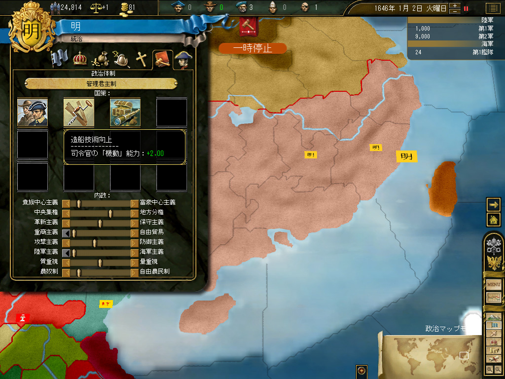 そうなると残るは二つ。初期状態では海戦関係と,年間の商人数+1という,不要不急もいいところのセットである。商人が増えたところで,交易効率+10%&商人の競争力+10%国策がなければ無意味だし,明はバリバリの陸戦国家である。このままではよろしくない。