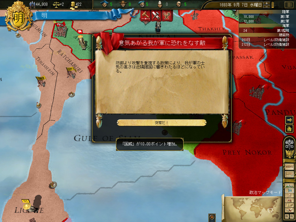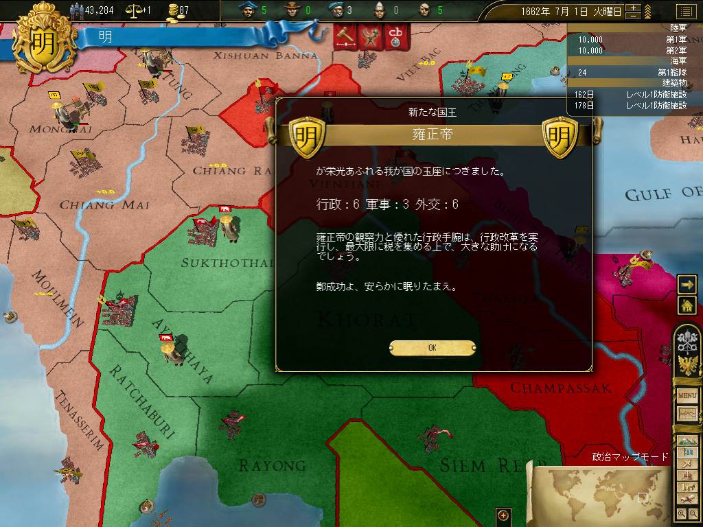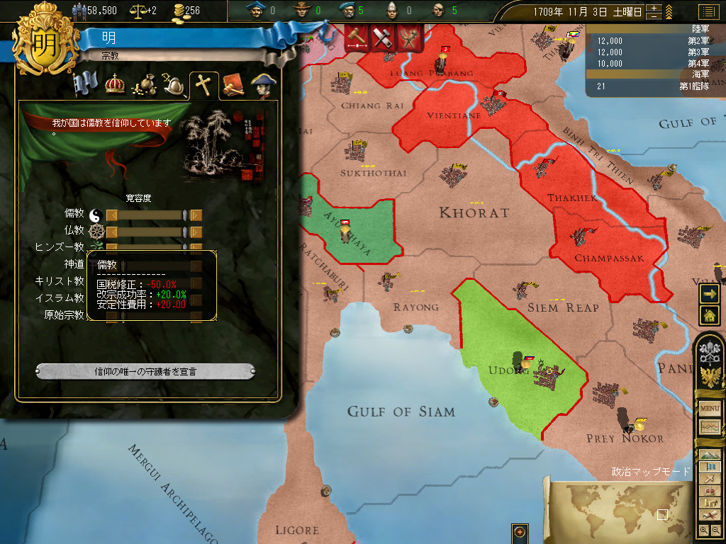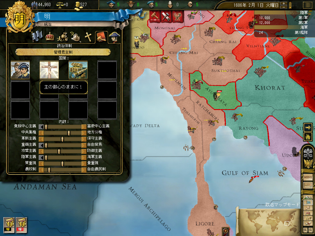かくして,なんだまたかという気もするが,国策は「国民皆兵」「中央銀行」「主の御心のままに!」の武闘派3点セットとあいなった。国策二つを変更すると安定度が都合−6される(−3×2回)わけで,安定度回復が遅い南明にとっては苦痛以外のなにものでもなかったが,痛みなくして改革はあり得ない。東南アジアを事実上統一する頃には,南明は十分に戦える国へと変貌を遂げたのである。