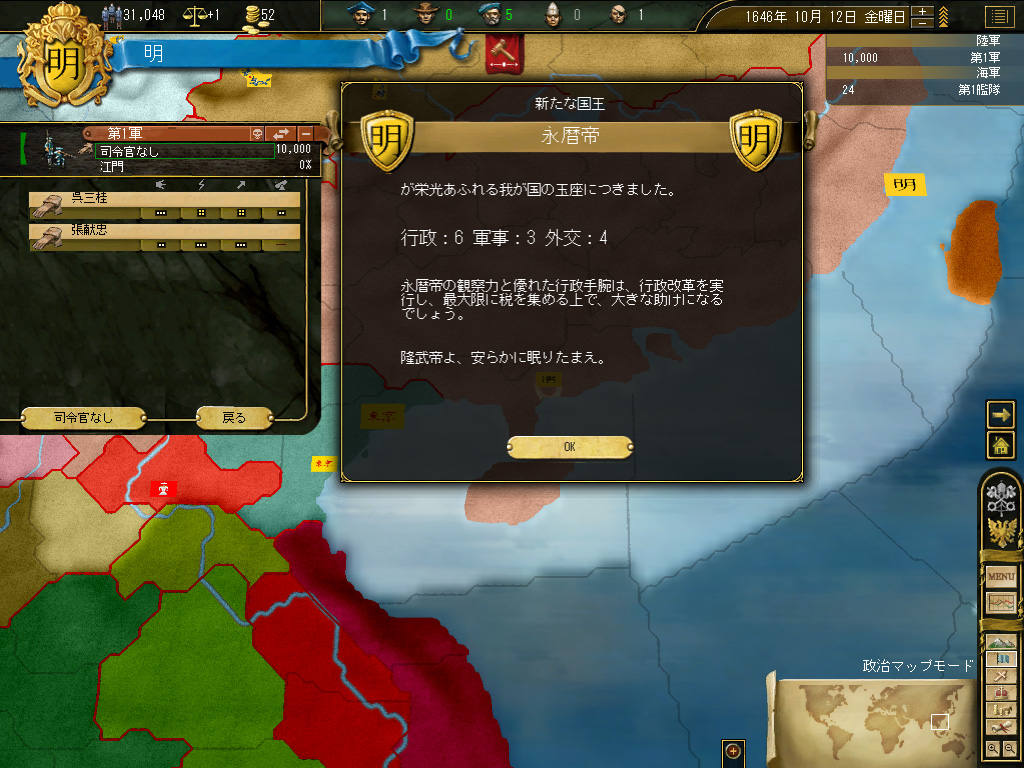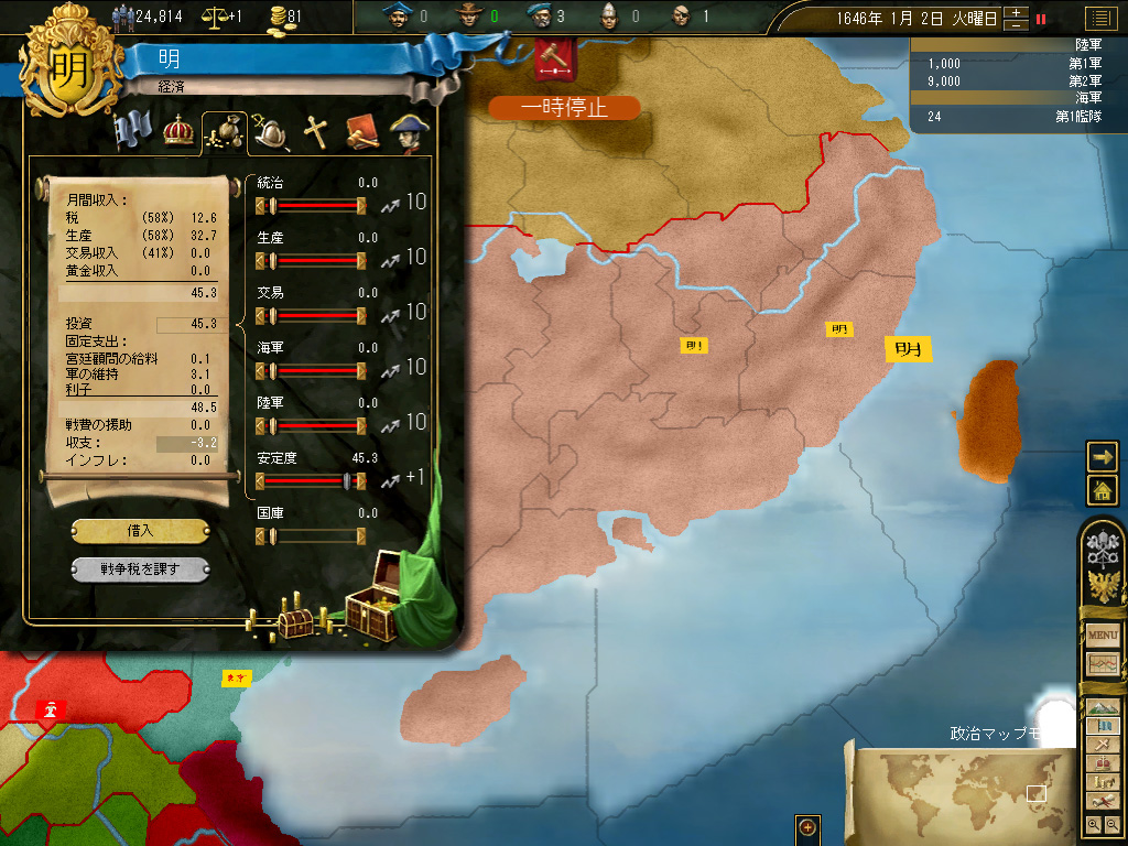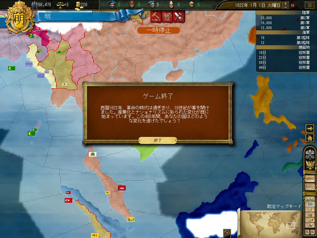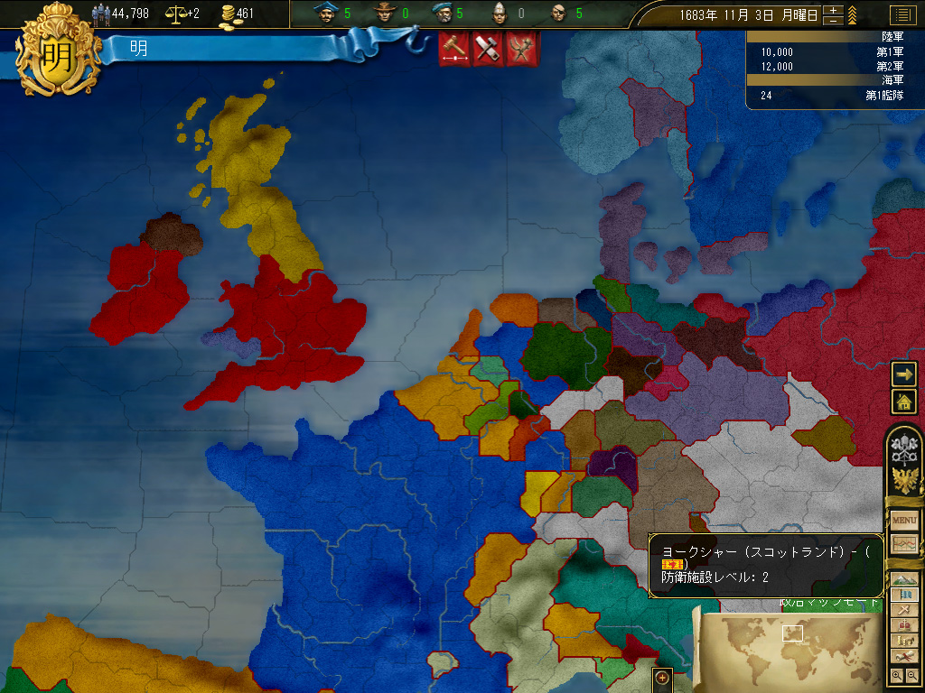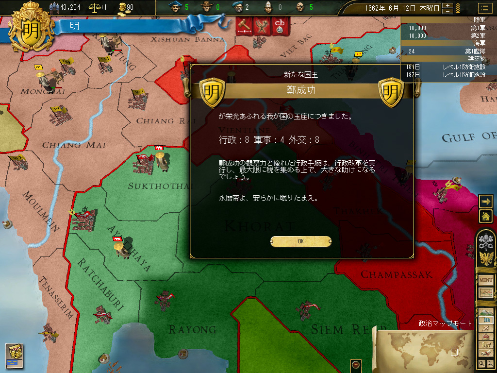 かくして,なんだまたかという気もするが,国策は「国民皆兵」「中央銀行」「主の御心のままに!」の武闘派3点セットとあいなった。国策二つを変更すると安定度が都合−6される(−3×2回)わけで,安定度回復が遅い南明にとっては苦痛以外のなにものでもなかったが,痛みなくして改革はあり得ない。東南アジアを事実上統一する頃には,南明は十分に戦える国へと変貌を遂げたのである。