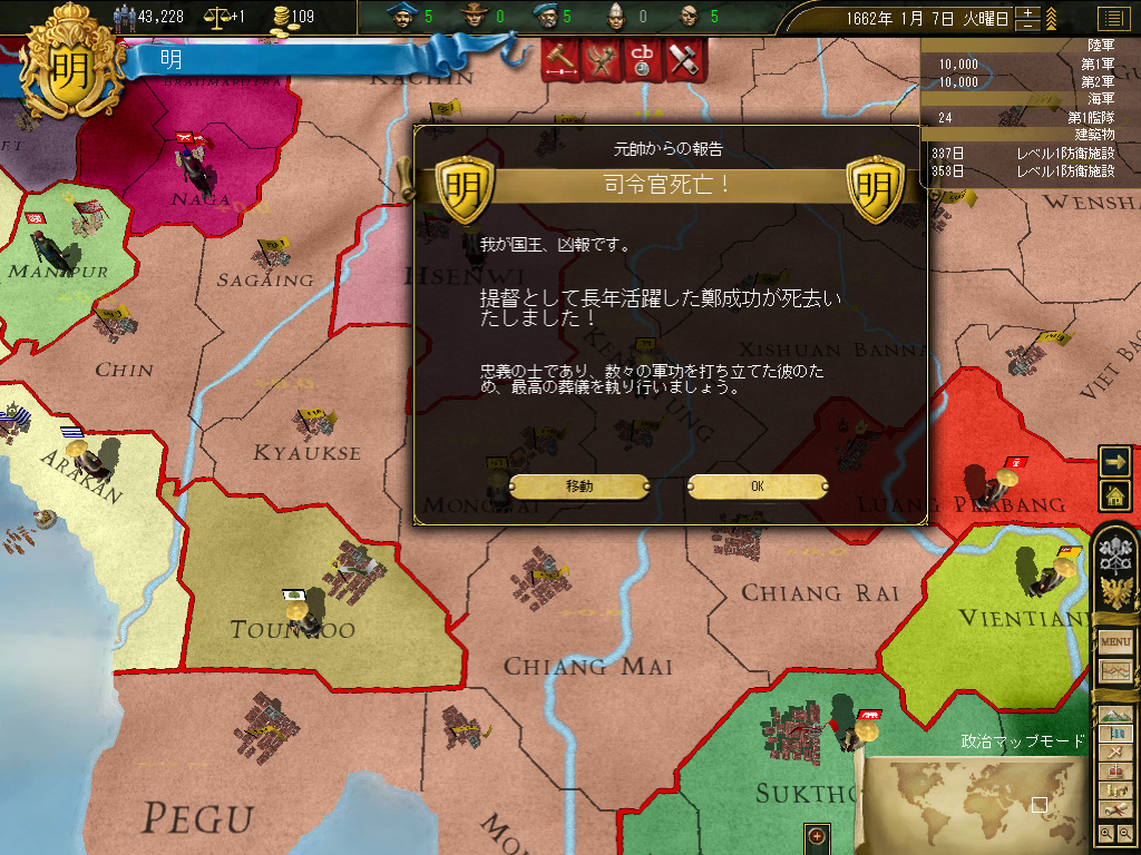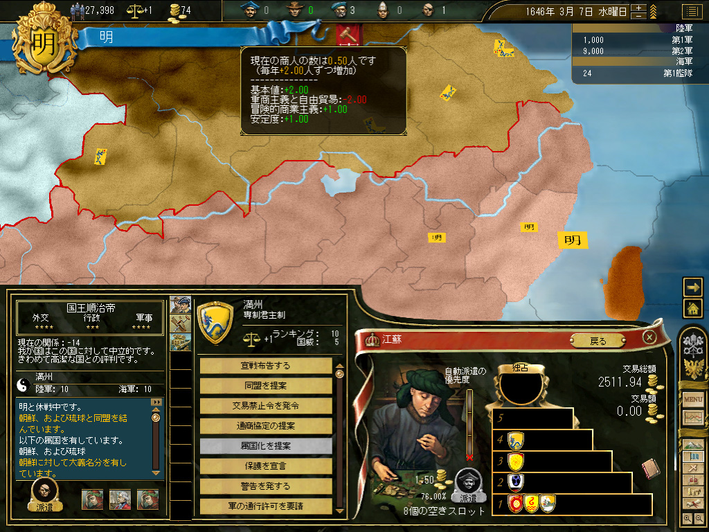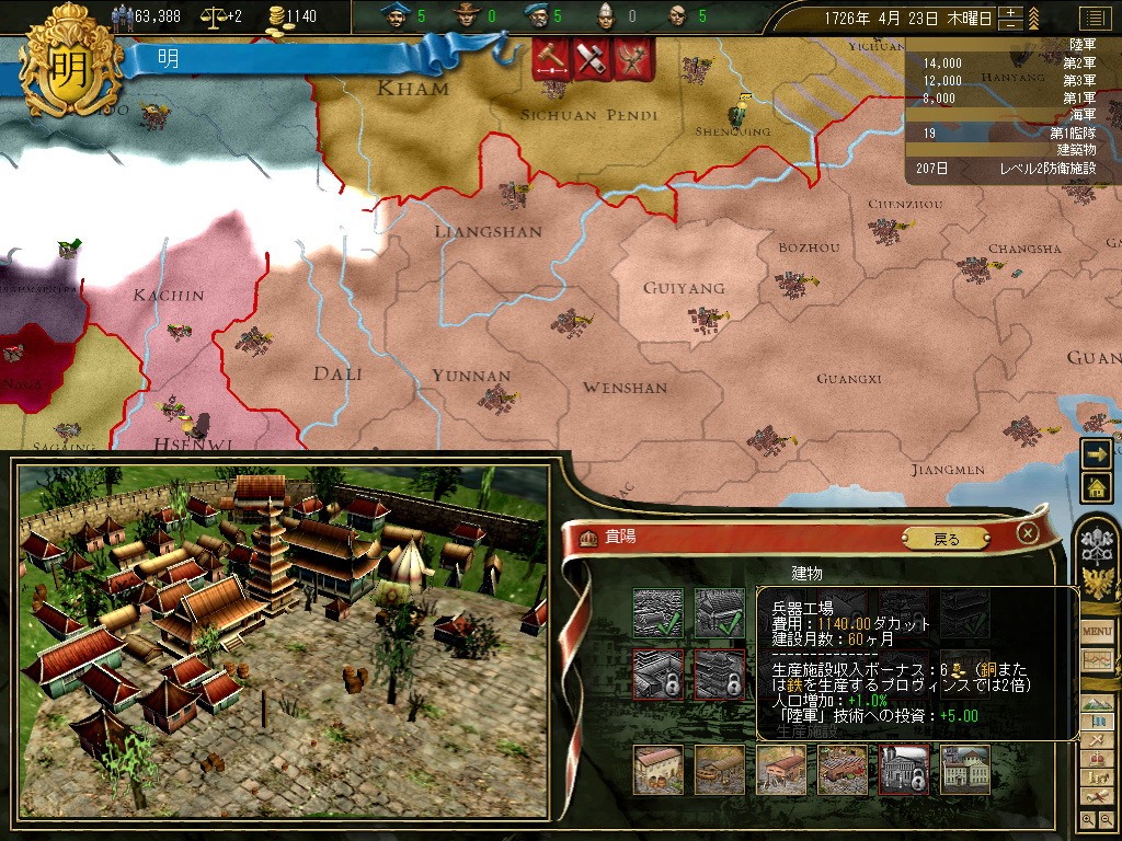 CoTを押さえたいま,交易国家に転身するのは魅力的であり,商人の数の問題が出るものの,交易2点セットを取るという方向性はあり得る――しかし,南明はいかんせん図体が大きすぎ,また戦争を前提としすぎている。商売に必要なのは安定度であって,安定しないことが確定している国で交易に乗り出すのは下策だ。