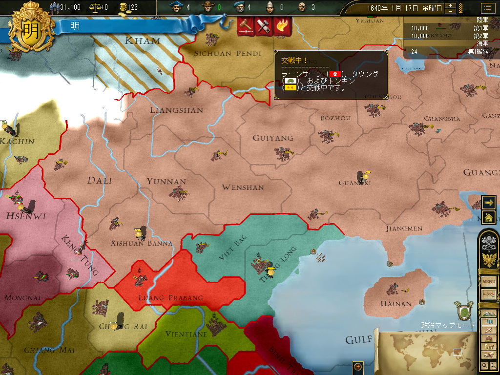 明の絞りカスのような国といえども,東南アジアの小国と比べれば国力の差は歴然だ。密林や山岳といった東南アジアの険阻かつ劣悪な環境が,軍事行動の大きな障害となるものの,それは相手も同じこと。いろんなものが足りない南明だが,人的資源だけは十分にあるので,多少の行軍損耗は気にせず,突っ込むことにする。