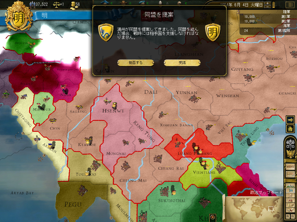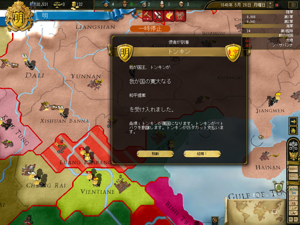 だいたいこれくらい領土を広げた段階で,おもむろに清から同盟のオファーが入った。清は西方でカザフスタンやペルシアといった国との戦争にもつれ込みつつあり,その観点からすると南方で赫々たる戦果を挙げ,急速に国力を増大させている南明は,パートナーとして望ましいという判断が下されたのだ。「強きを助け,弱きを挫く」――これこそが国際政治の本道なのである。