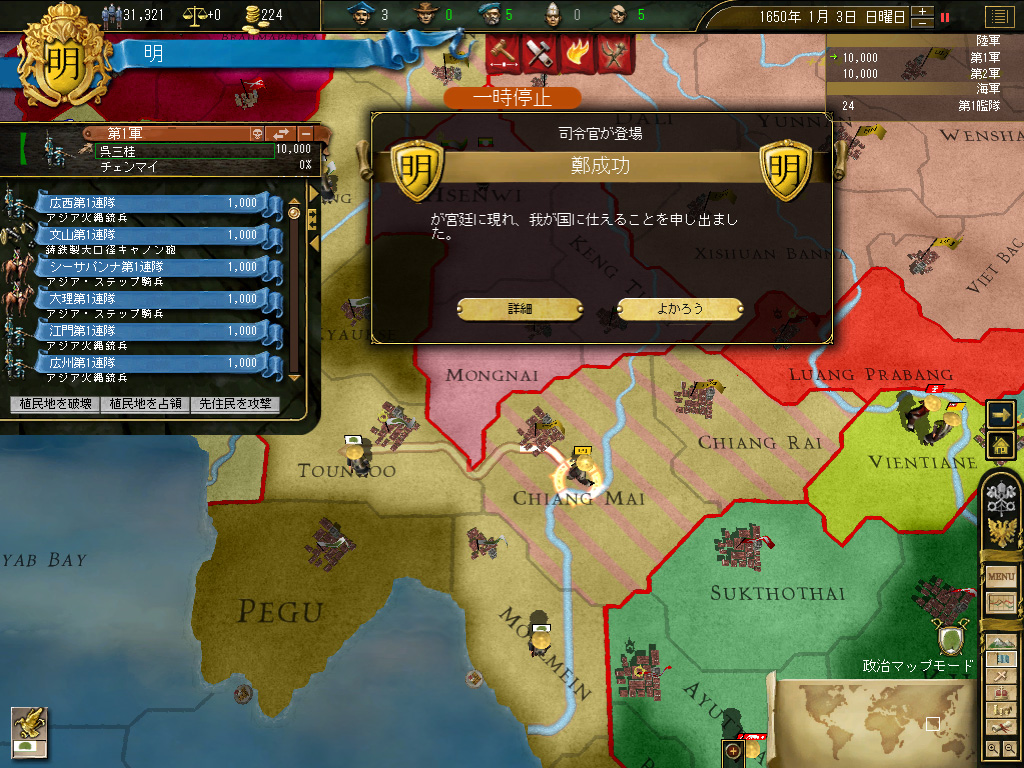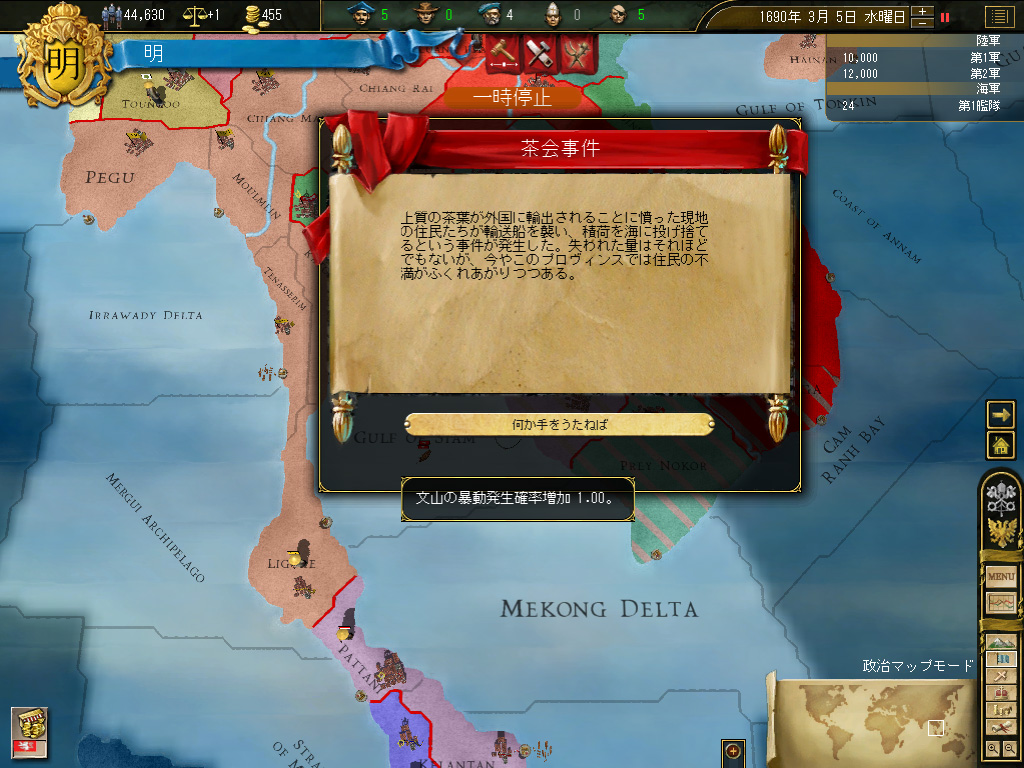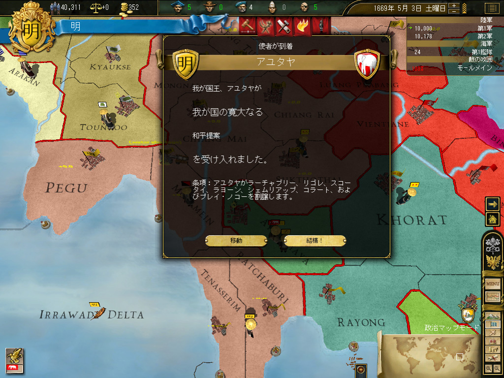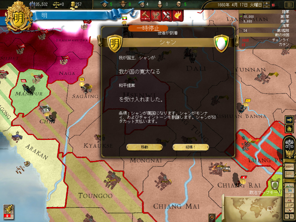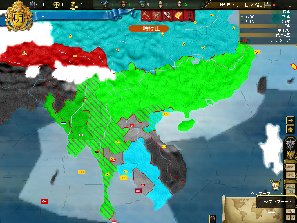 だが,ここらへんでちょっと国際的悪評が高まりすぎたので,やむなくシャンを再独立させ,タウングを併合する。タウングは経済価値が高い地域を持っているだけでなく,マラッカへの回廊も押さえている。取るなら断然こっちである。
