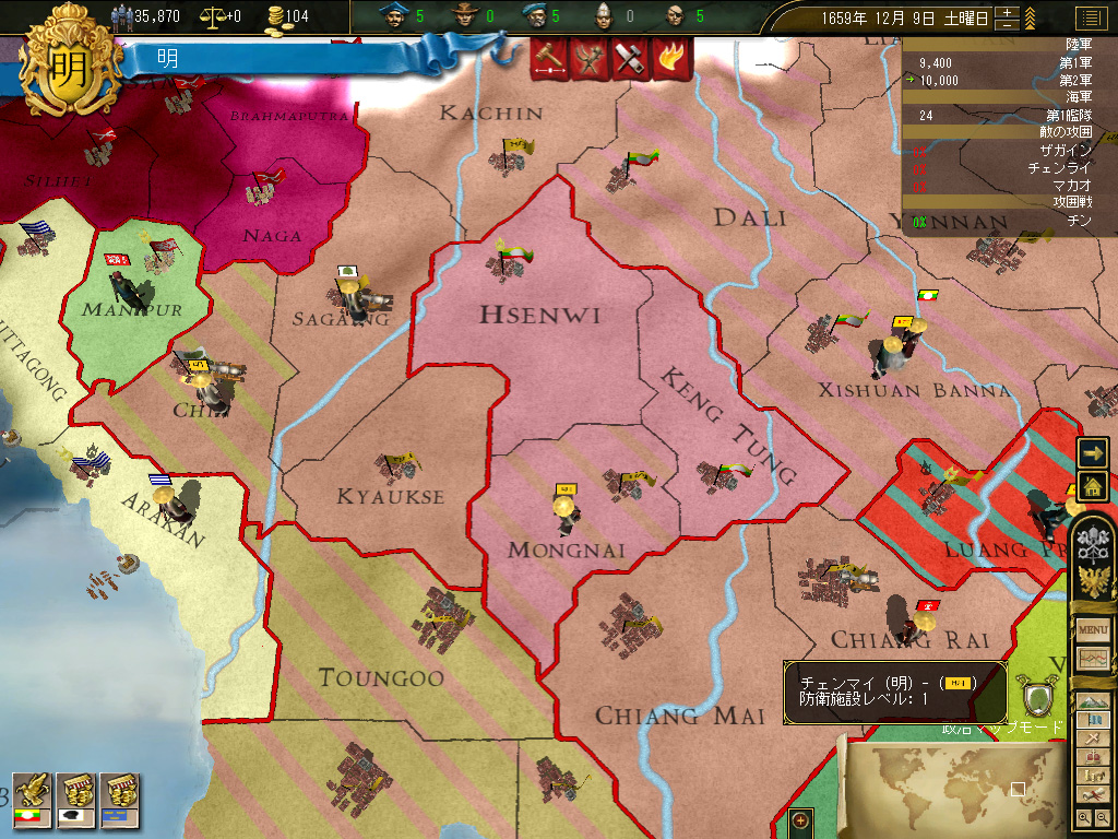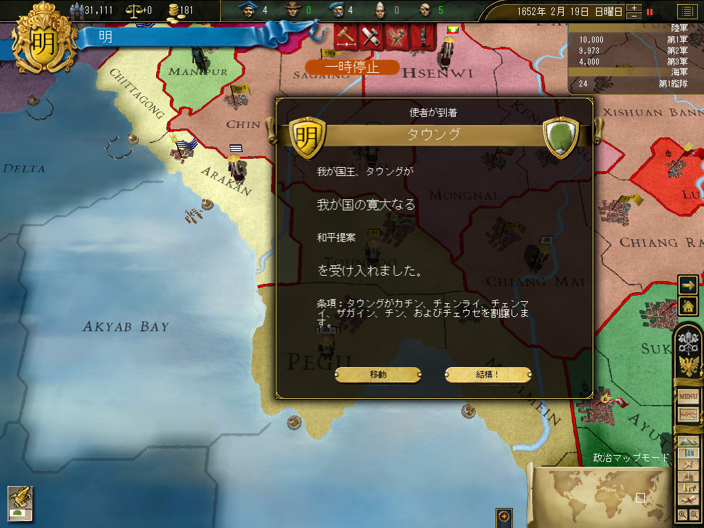 続いて,山岳に足をとられつつもタウングから大幅に領土を切り取る。切り取ったところで果てしない不毛の土地だが,ないよりはあったほうがいい。なにしろ南明にとって数少ない優位点である人的資源にしても,しめて3万弱しかないというのが正直なところなので,たとえほかに何一つ生み出さないにしても,人的資源の供給源はどんどん確保したい。
