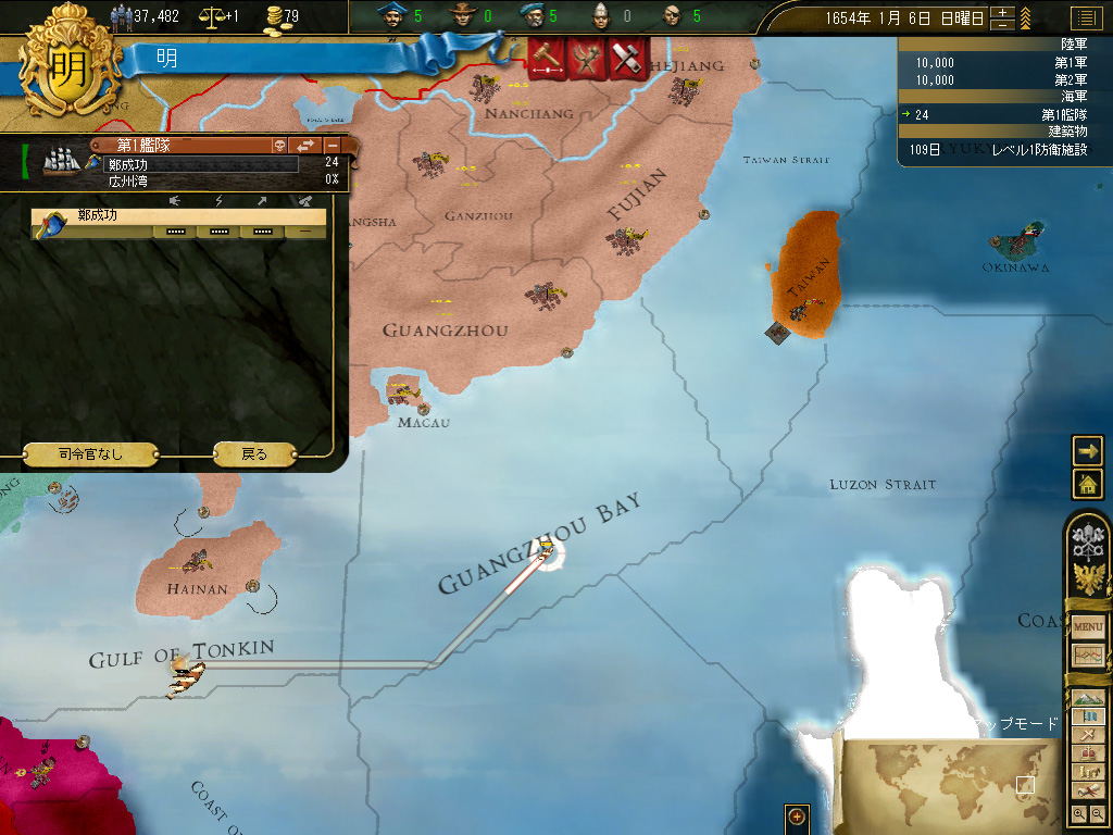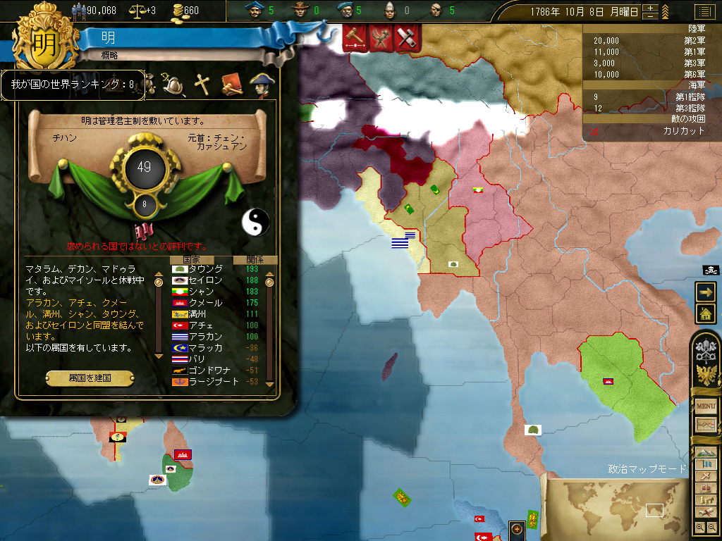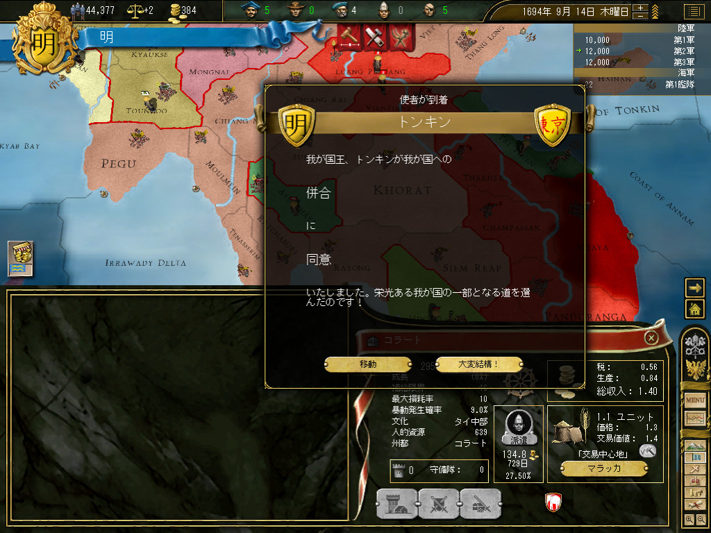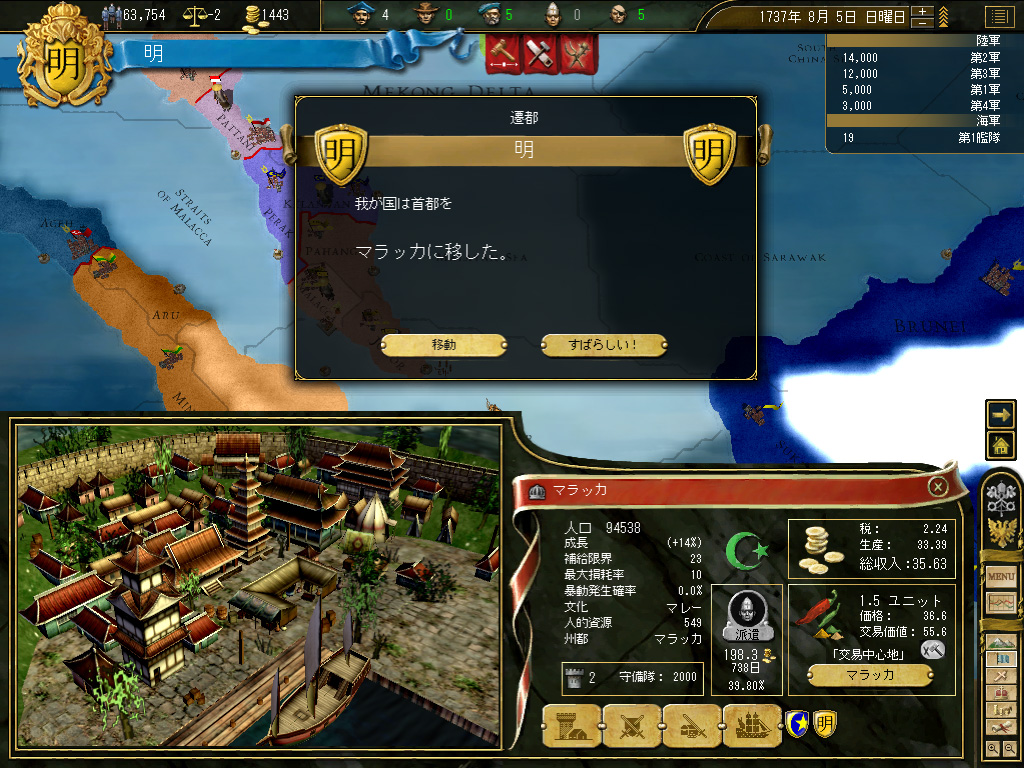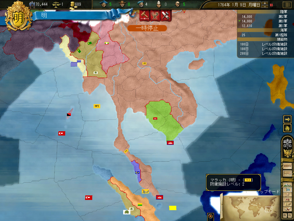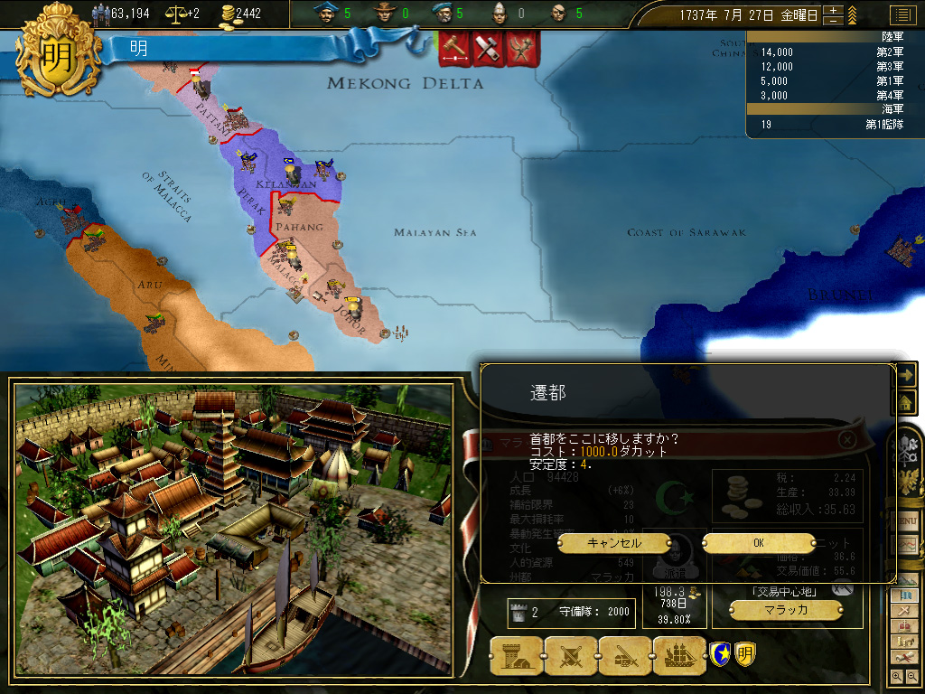 南明は,中国本土のCoTをすでに清に奪われており,経済的にかなり問題がある。これを解決する方法は二つ。CoTを自作するか,奪い取るかである。幸いといっていいのかどうか微妙だが,インドシナ半島をどんどん南下して行けば,地域最大のCoTであるマラッカが転がっている。ここを占領できれば,南明の経済状態は大きく改善されるだろう。