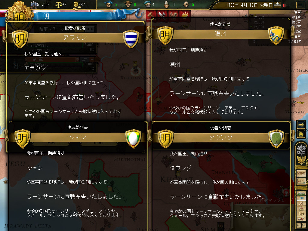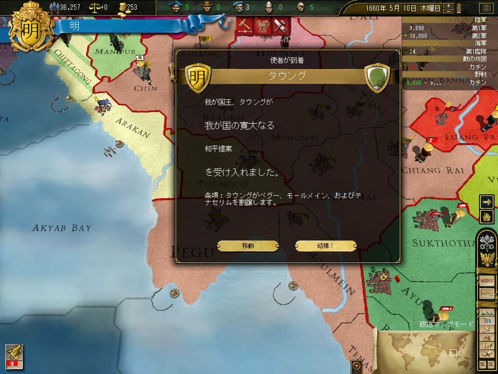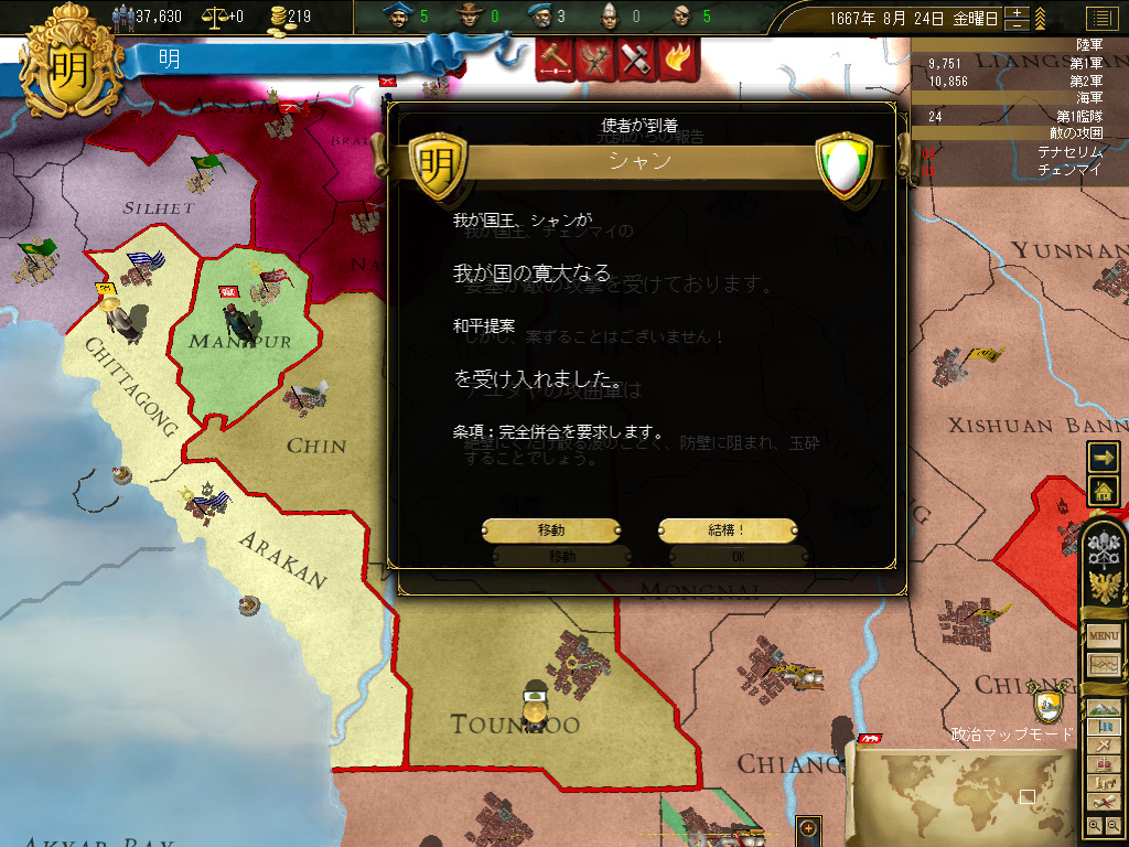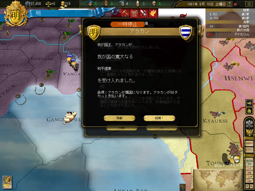 ともあれ,再びタウングにならず者戦争をふっかけ,のこのこついてきたタウング属国のシャンを踏み潰し,正義の戦いと勇んで参戦してきたアラカン軍は叩き潰して属国化する。なんとも効率が良くて助かる。