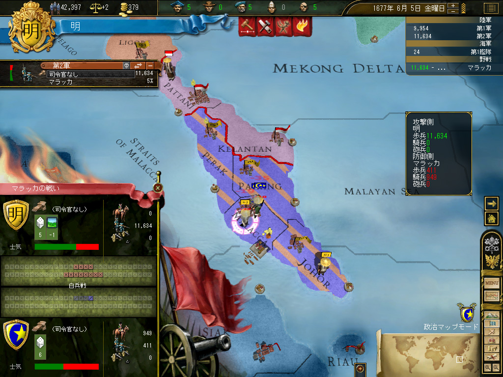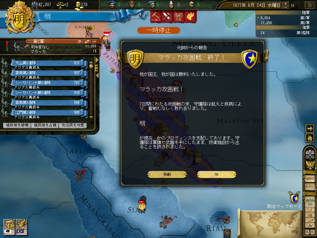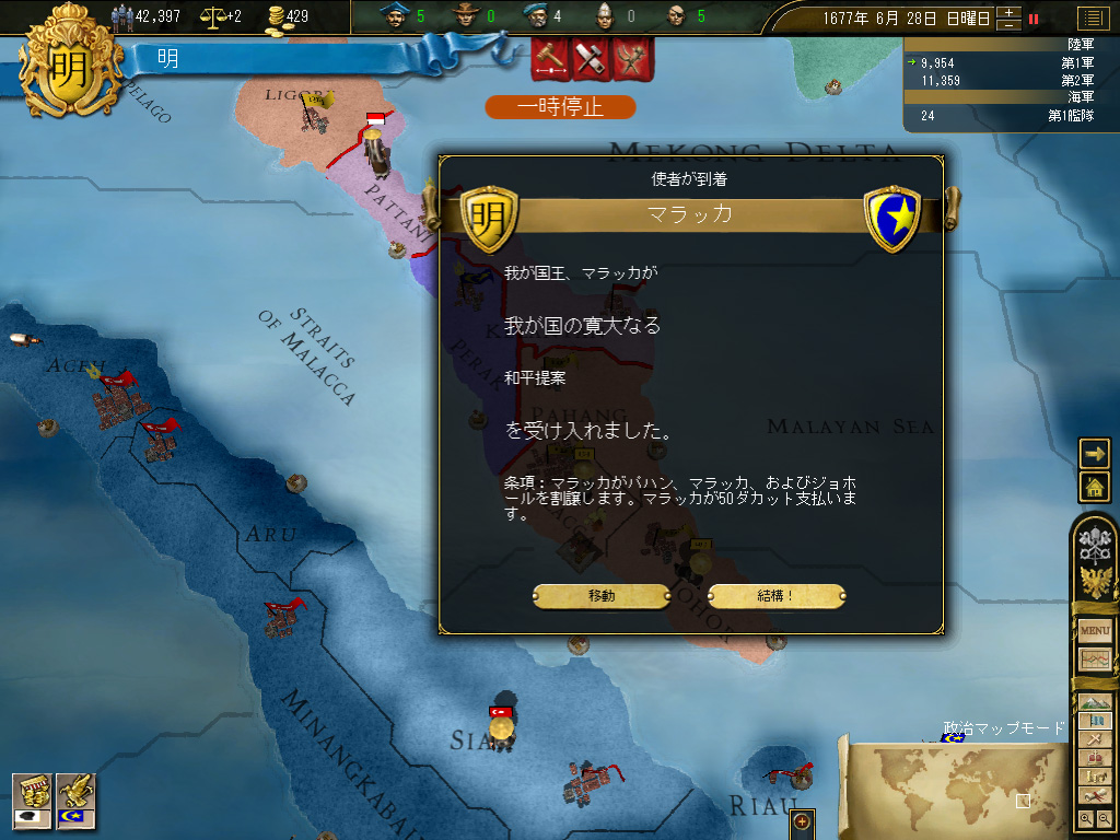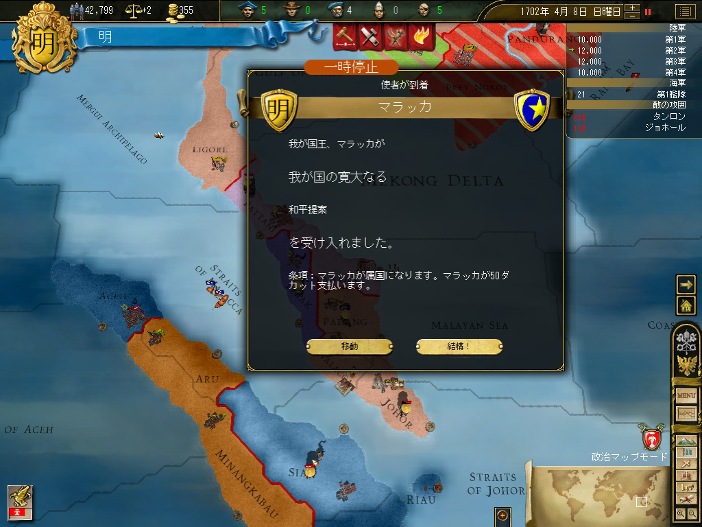 アユタヤを実質無力化して側面の脅威を絶ったところで,ついに本命マラッカに突撃を開始する。マラッカとの間には小国が1国挟まっているのだが,軍の通行許可を要請したらあっさりと飲んだので,これ幸いとスルーを決め込む。この国,国土の一部がスマトラ島にあるせいで,まともに戦争して領土割譲要求を出すと,かなり面倒なことになるという事情もあった。