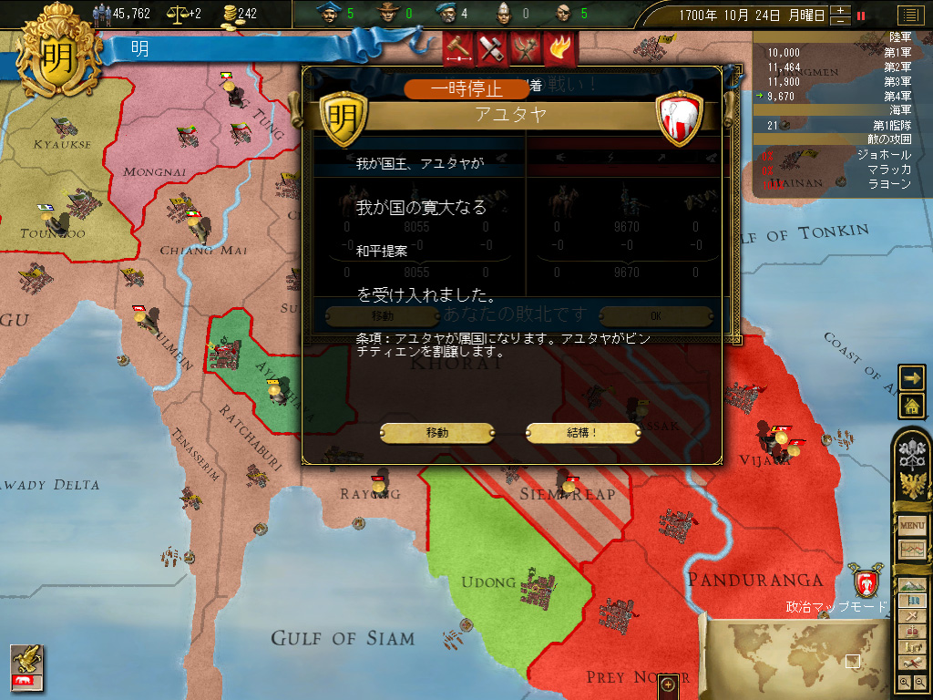 タウング/シャン問題がおおむね解決したところで,次はアユタヤ攻略を開始する。忠実な属国が増えていることもあって,南明軍はアユタヤ本土に直行,周囲に漏れるアユタヤ軍は属国軍に処理させることにした。結果,トンキンが思いがけず大活躍してアユタヤの半分近くをもぎとっていったが,将来的にトンキンは外交併合する予定なのでよしとしよう。どうせ自分で占領しても,人的資源以外はほとんど利益にならないのだし。