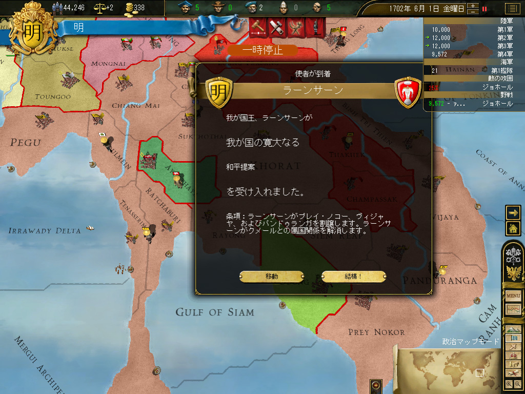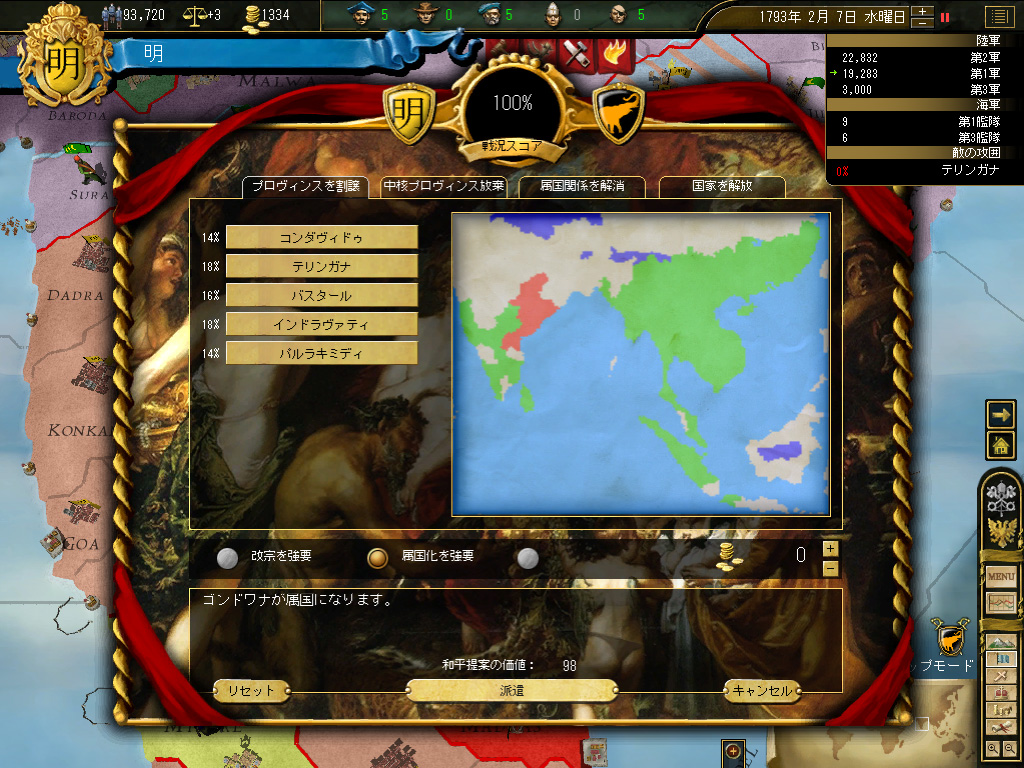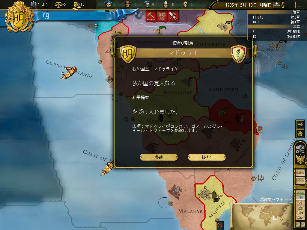 半端な講和条件などいっさい無視してゴンドワナを完全制圧,このまま併合していってもよかったが,ゴンドワナ相手に時間をかけすぎると,ムガールを過剰に刺激する危険がある。そこで,ゴンドワナには現状を維持したまま南明の属国となってもらうことで和平を締結した――いまの南明にとって,時間が最大の敵なのである。