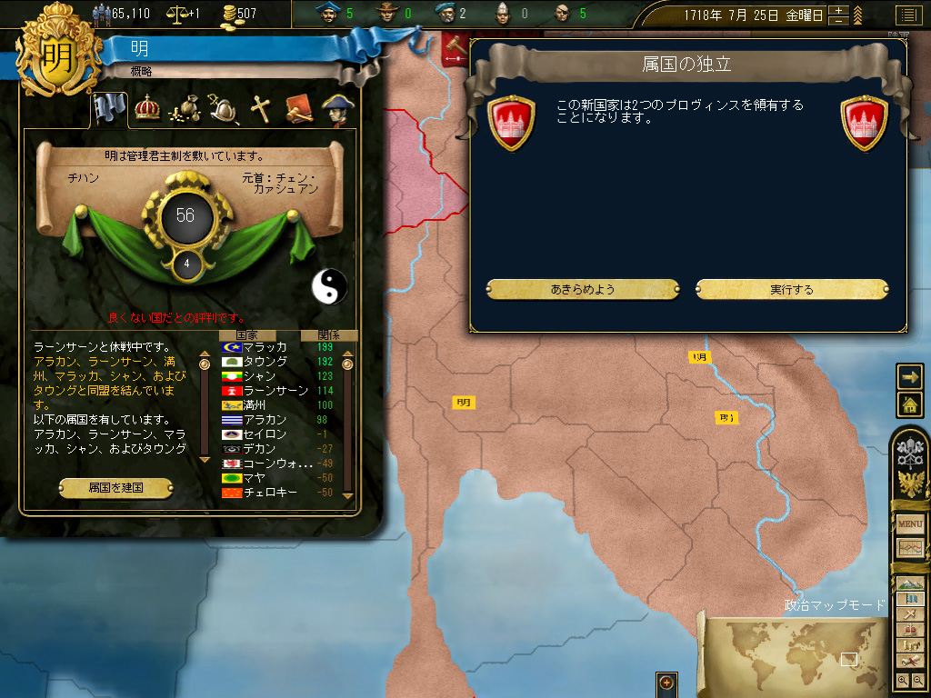 ここでタウングを併合した瞬間,「タウングを再独立させるか,安定度−3か」の選択イベントが……。後者は絶対にあり得ないので,泣く泣くタウングを再独立させる。人生ままならないものだ。とはいえマラッカへの回廊が南明支配に留まったのが,不幸中の幸いといえよう。
