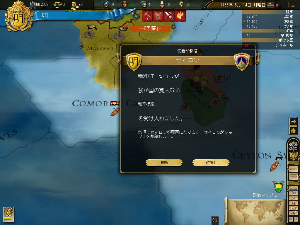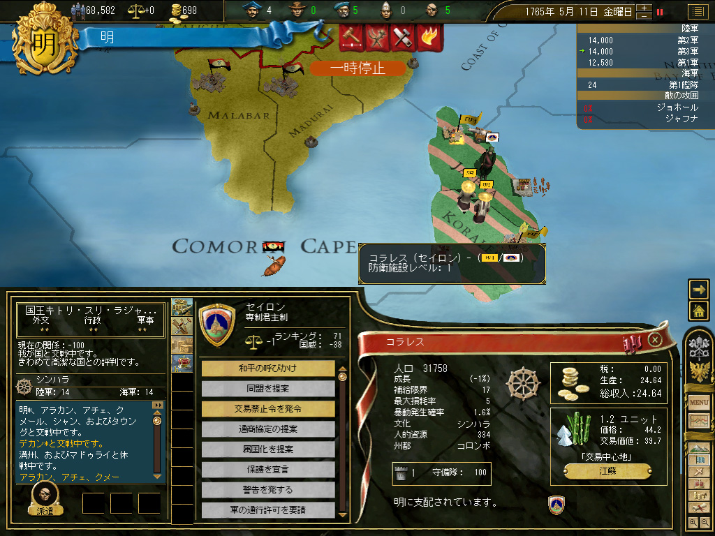 最初の攻撃目標はセイロンである。セイロンはインド亜大陸のいずれの国とも同盟しておらず,簡単に排除可能だ。一発で併合まではできないが,ぶっちゃけ陸海軍が駐屯できるプロヴィンスが一つ出来ればよいだけなので,1プロヴィンス割譲+属国化で手を打つ。どうしても併合したいときは,将来的な外交併合を目指そう。