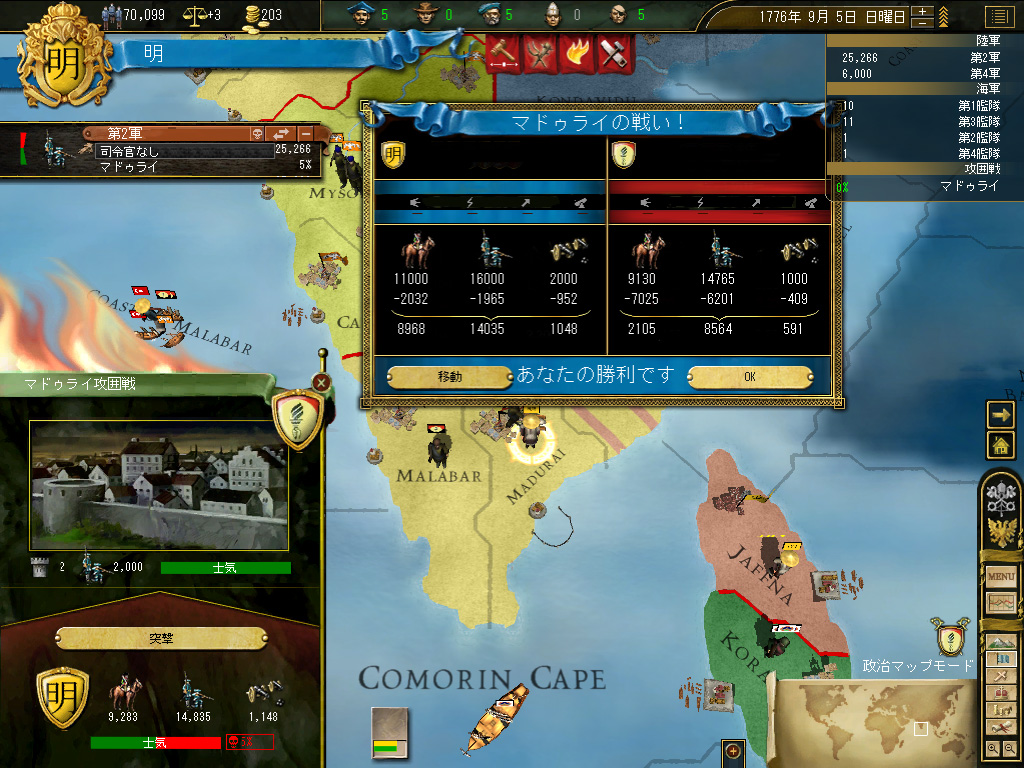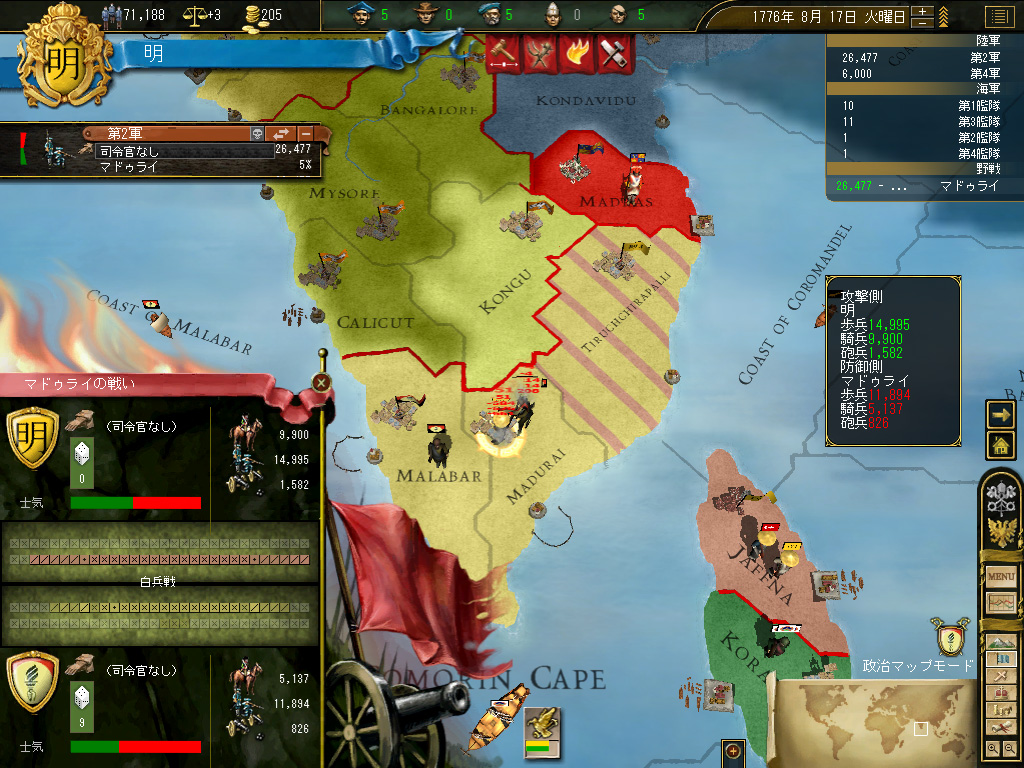 セイロンを制圧したら,いよいよ本番である。攻撃目標はインド亜大陸南端のマドゥライ。マイソールと同盟しており,マイソールがマドゥライを二分するような形になっている。マドゥライから始めると全土の占領が大変で,マイソールから入れば上下から挟まれるという,非常に困った情勢である。