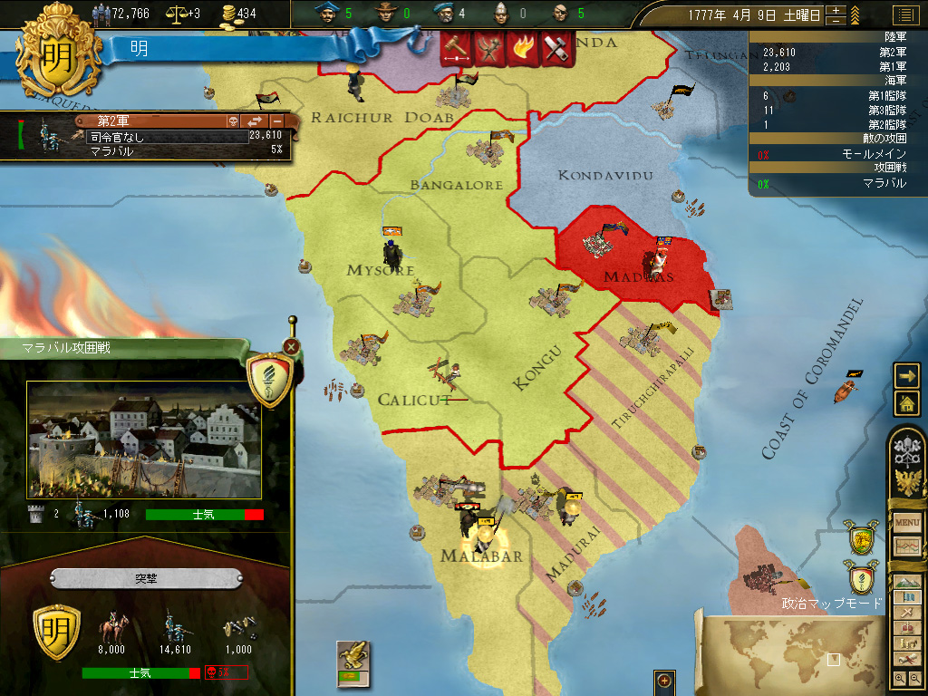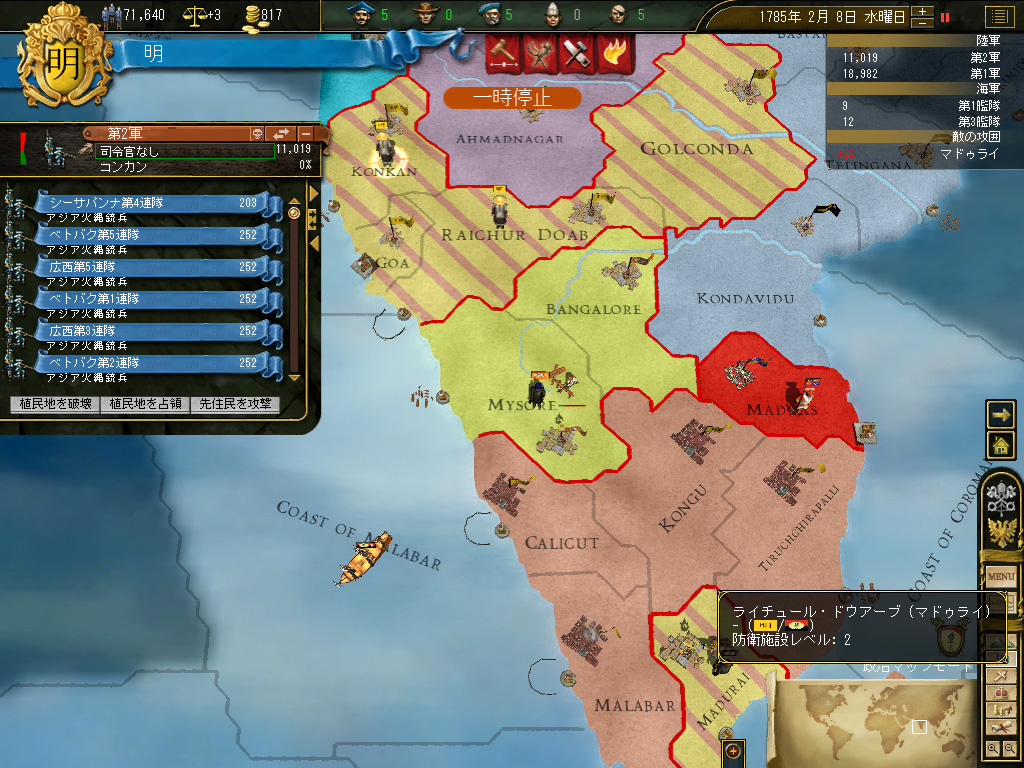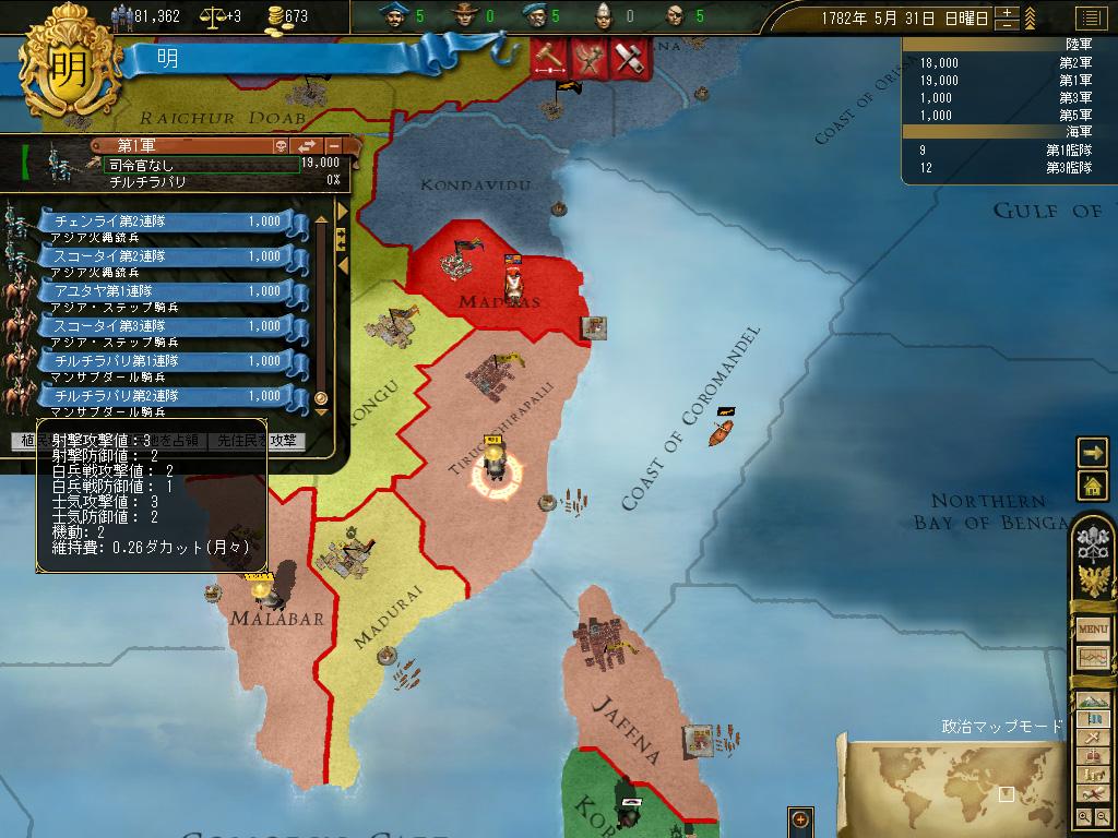 もう一つの作戦はインドへの進出である。とはいえムガールと戦ってなんとかなる可能性は皆無なので,インド南部の中小国連合を狙い撃ちする。インドもまた,経済力も人的資源も申し分ない。問題は,申し分なさすぎるせいで,中小国連合といえども侮れない力を持っていることだ。