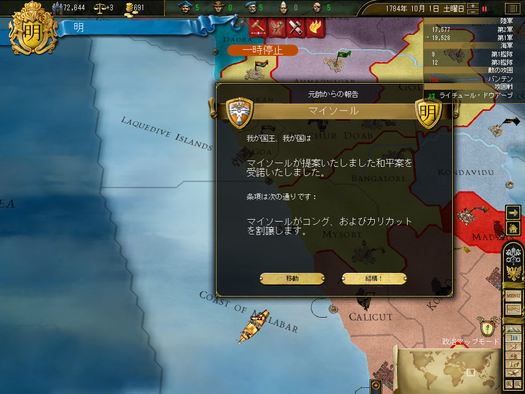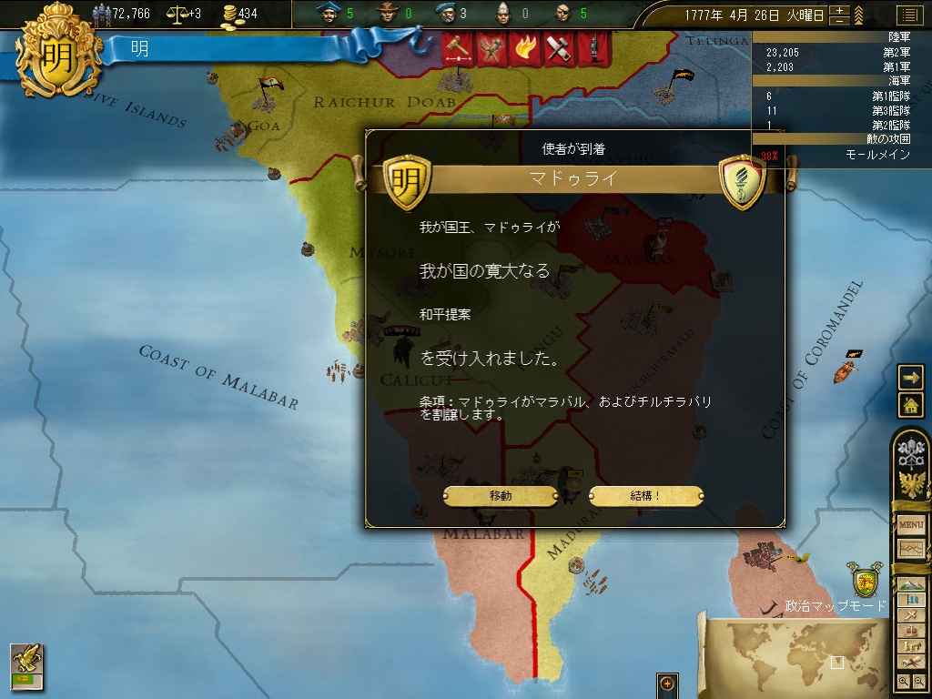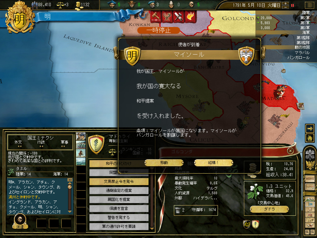 まずは1部隊でマドゥライがインド南端に持つ最後の1プロヴィンス(首都だったりする)を占拠,しかるのちにそこから,二つの部隊でマイソール領を駆け上がる。マイソールからは悲鳴に近い和平の申し出が来るものの,いまはマイソールの領土を切り取るのが目的ではない! 侵攻部隊はマイソールの戦意を挫きつつ,マイソール軍の残党にかまわず電撃的に北上,ついにマイソールの北に広がるマドゥライ領にまで到達した。この段階でマイソールとは講和し,いくつかの領土を勝ち取る。